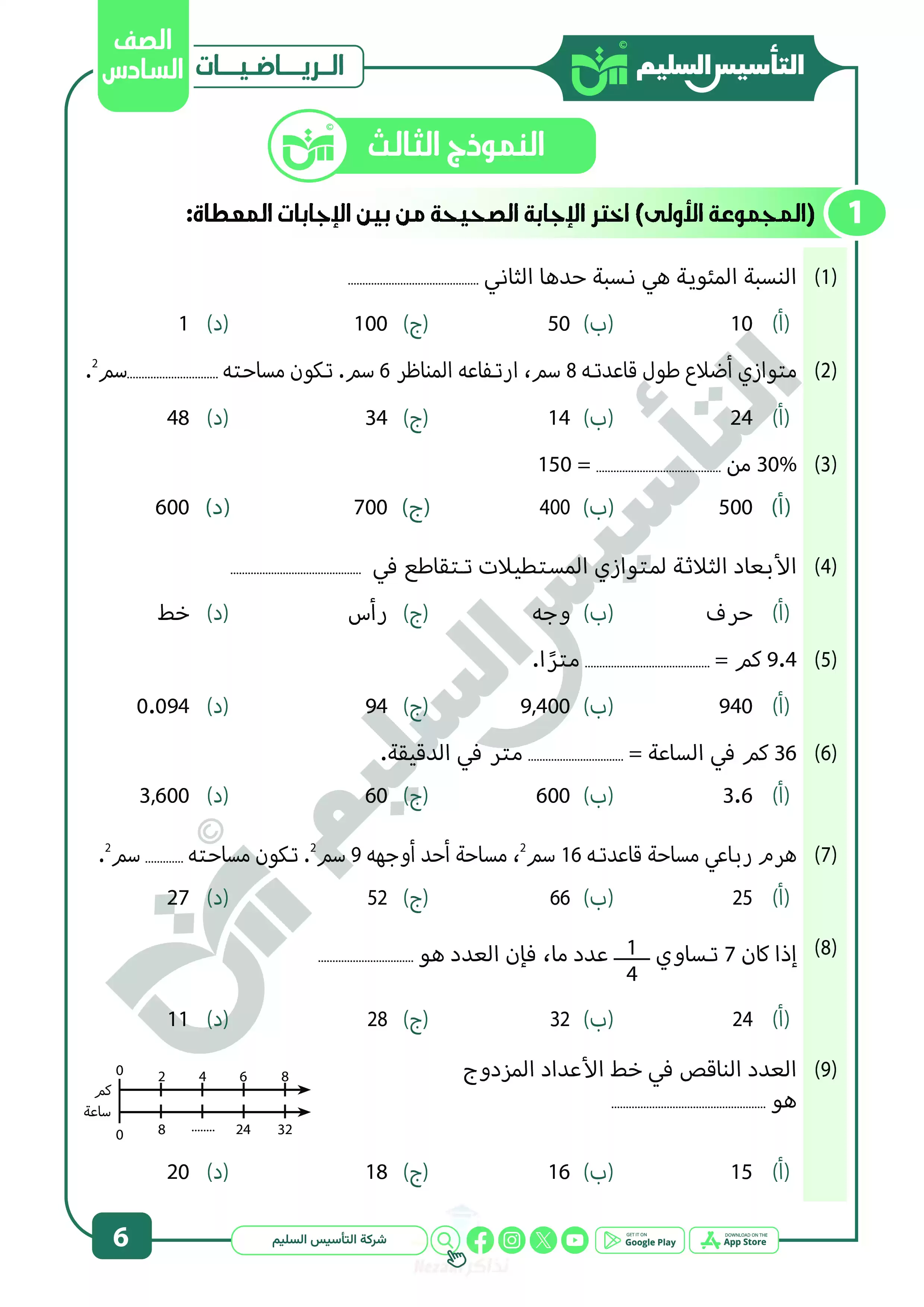 صفحة 6 من 22 صفحة من ملف: نماذج اختبارات ومراجعة الرياضيات النهائية من التأسيس السليم للصف السادس الابتدائي الترم الثاني 2025 - Nezakr