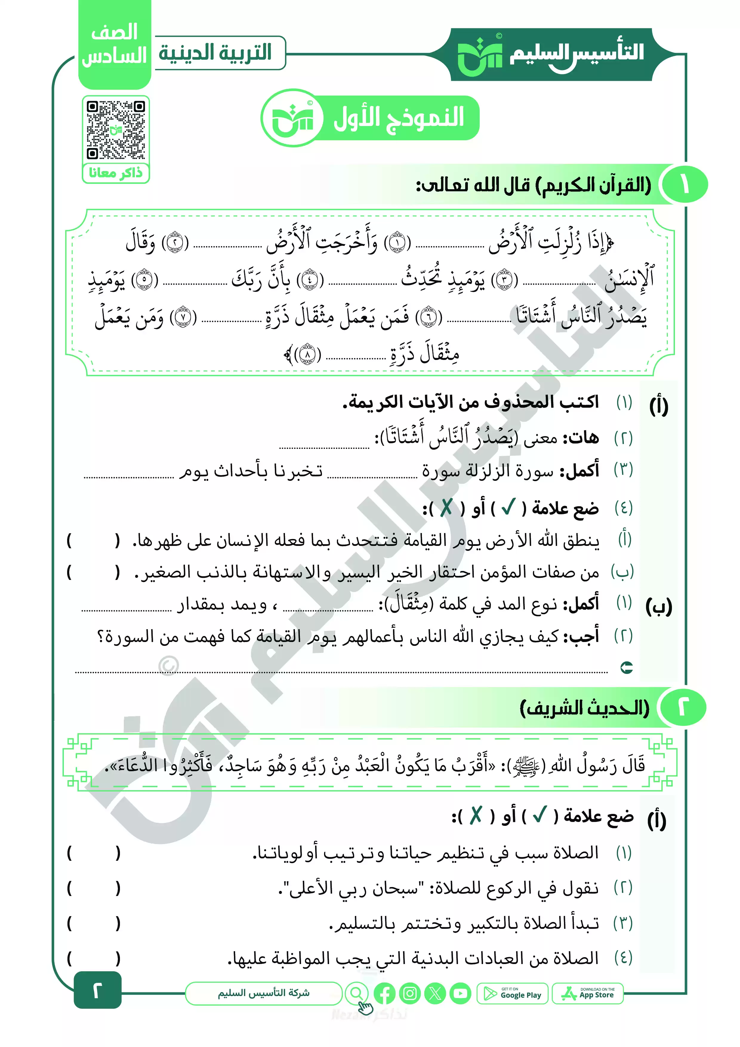 بيانات الملف: (نماذج اختبارات ومراجعة الدين النهائية من التأسيس السليم للصف السادس الابتدائي الترم الثاني 2025 - Nezakr)