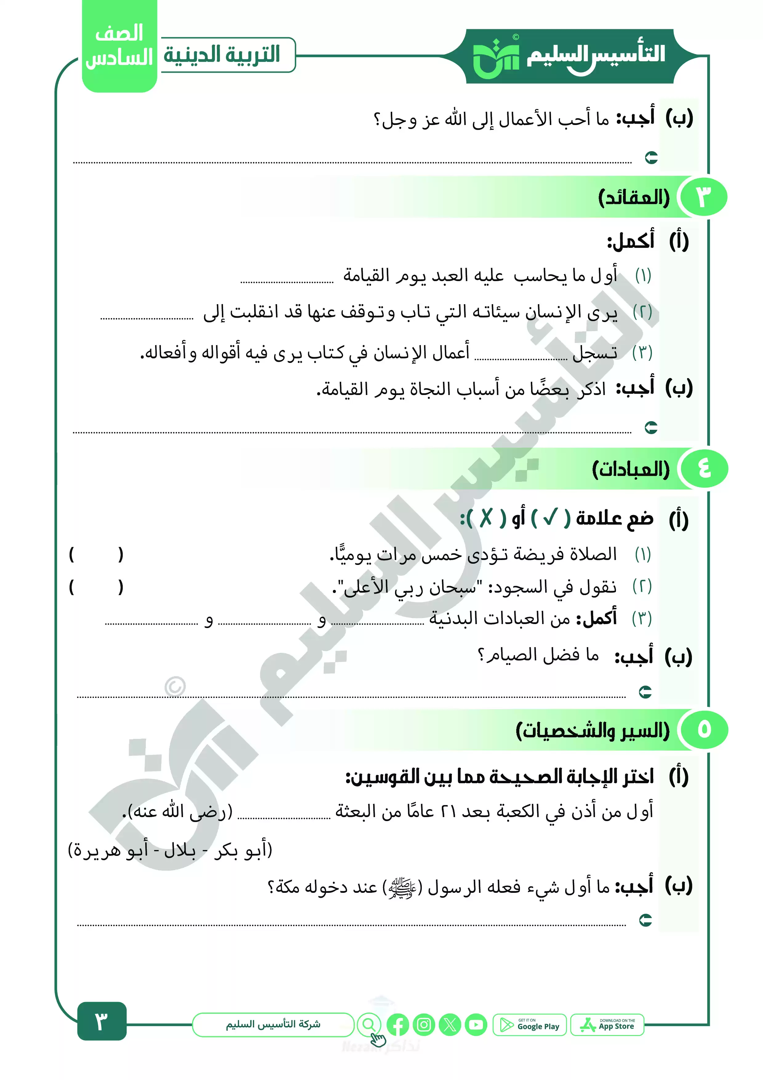 صفحة 3 من 22 صفحة من ملف: نماذج اختبارات ومراجعة الدين النهائية من التأسيس السليم للصف السادس الابتدائي الترم الثاني 2025 - Nezakr