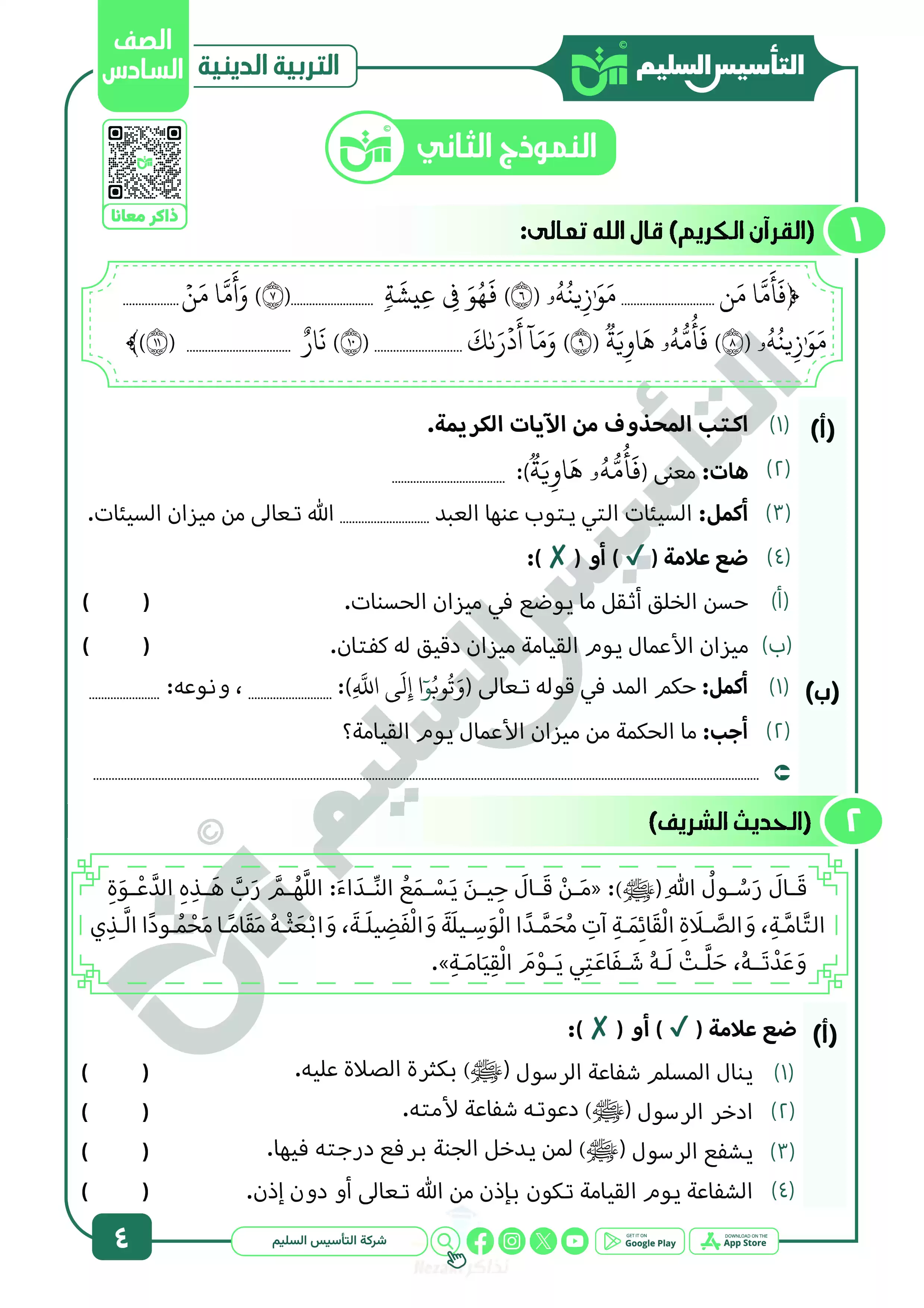 صفحة 4 من 22 صفحة من ملف: نماذج اختبارات ومراجعة الدين النهائية من التأسيس السليم للصف السادس الابتدائي الترم الثاني 2025 - Nezakr