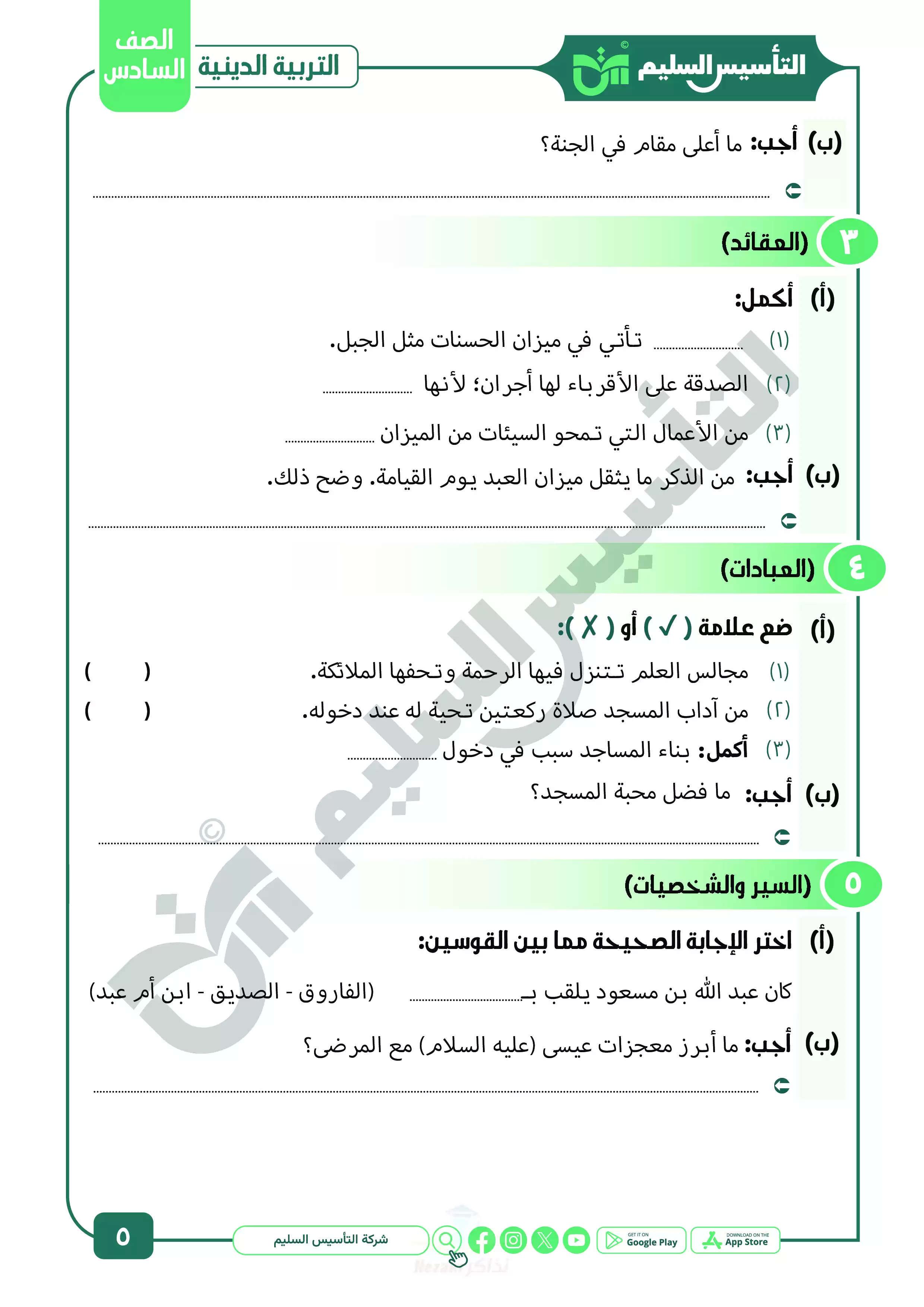 صفحة 5 من 22 صفحة من ملف: نماذج اختبارات ومراجعة الدين النهائية من التأسيس السليم للصف السادس الابتدائي الترم الثاني 2025 - Nezakr