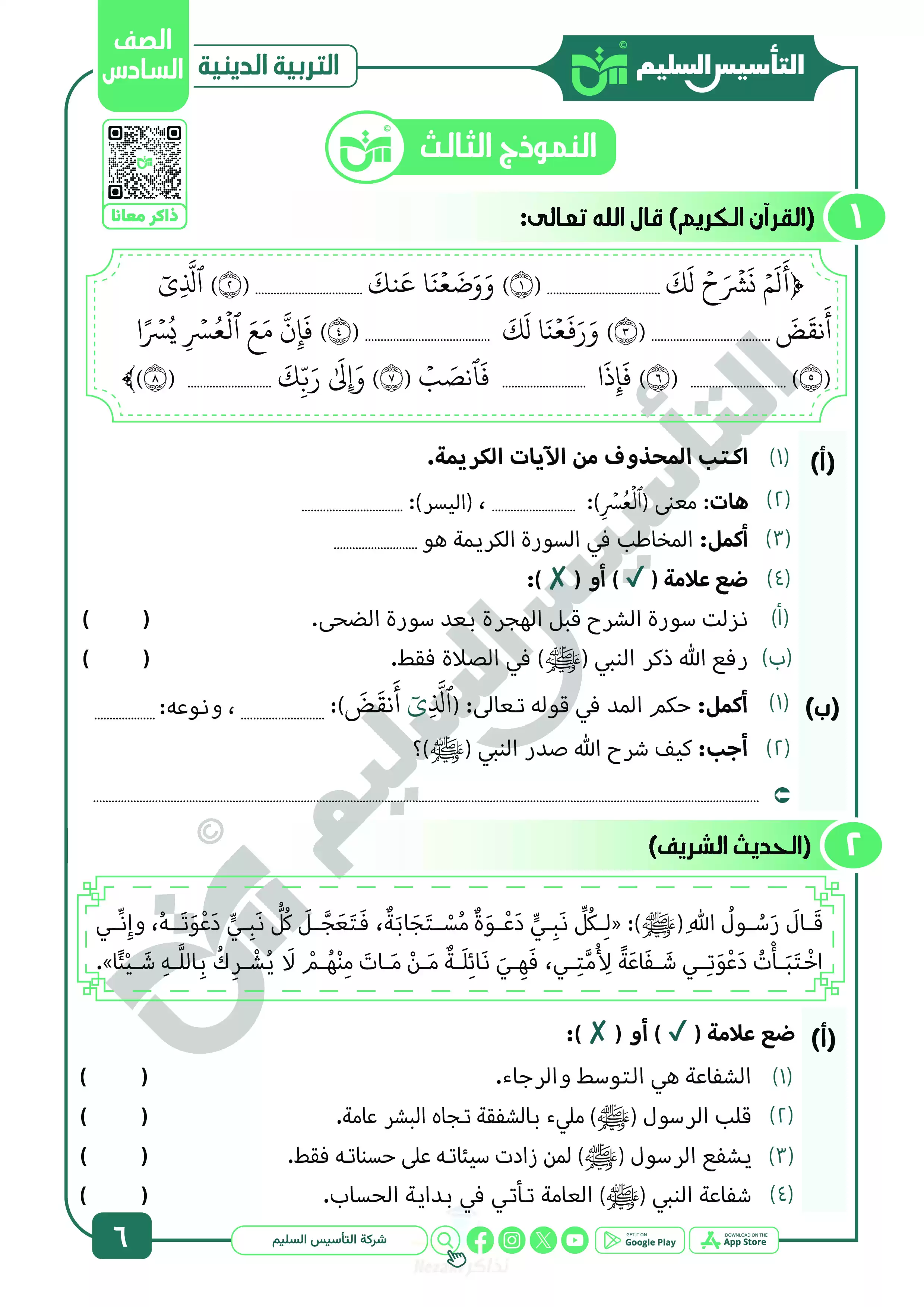 صفحة 6 من 22 صفحة من ملف: نماذج اختبارات ومراجعة الدين النهائية من التأسيس السليم للصف السادس الابتدائي الترم الثاني 2025 - Nezakr