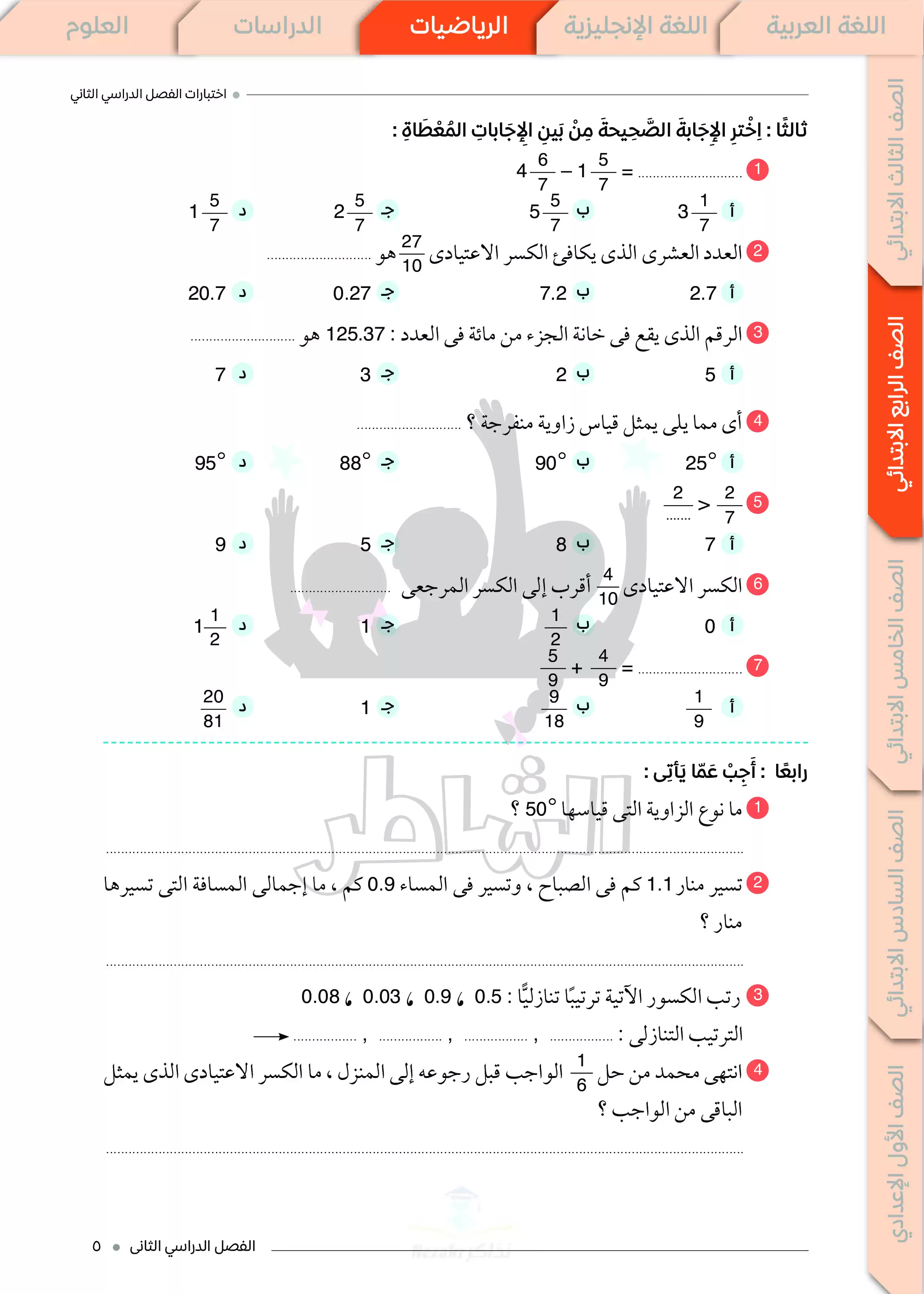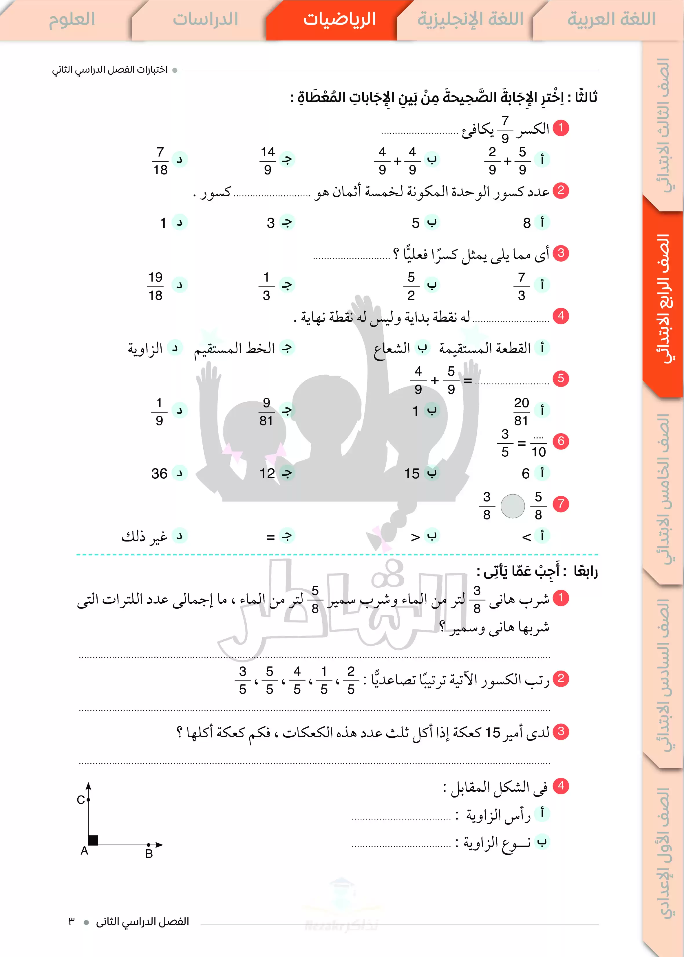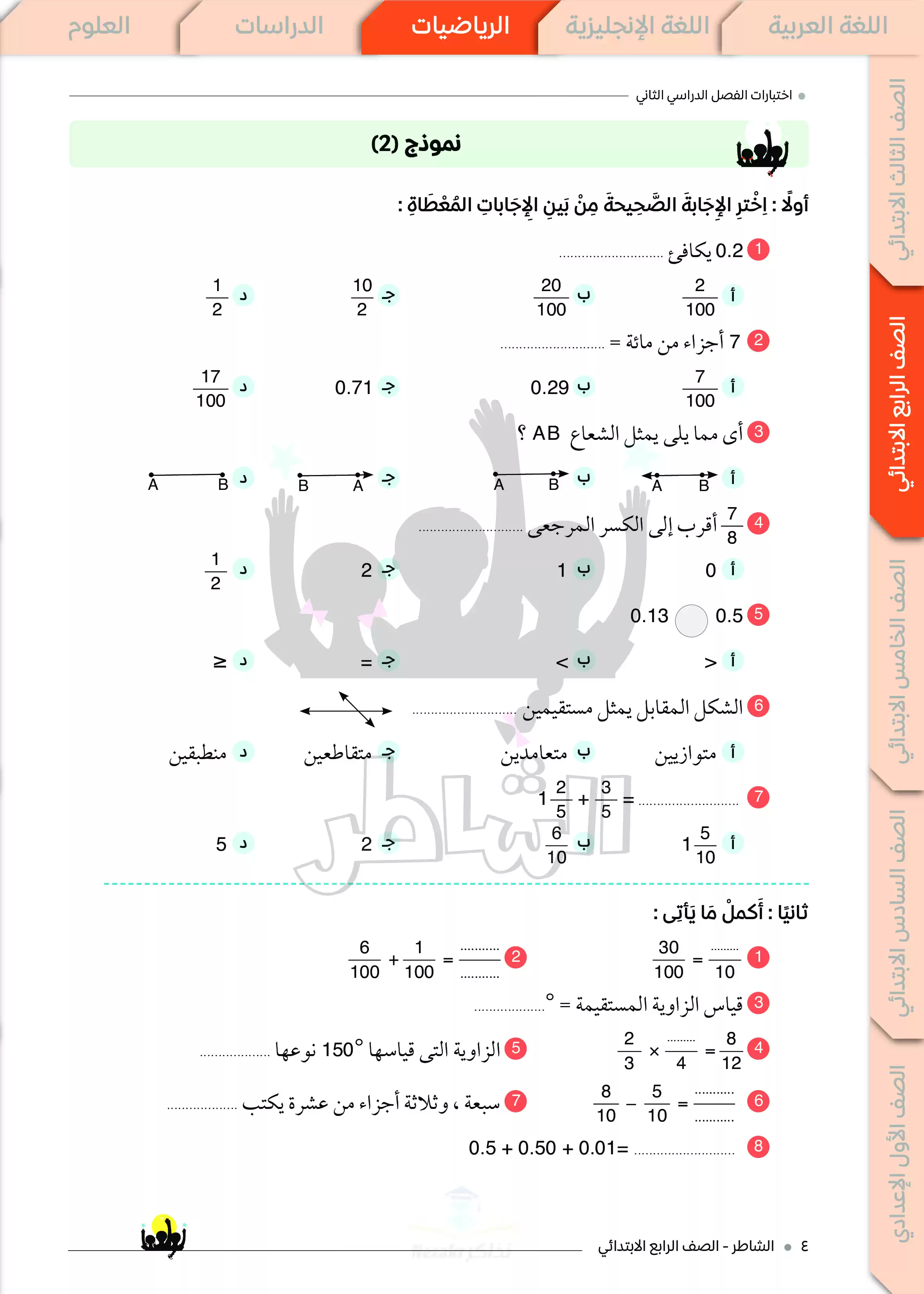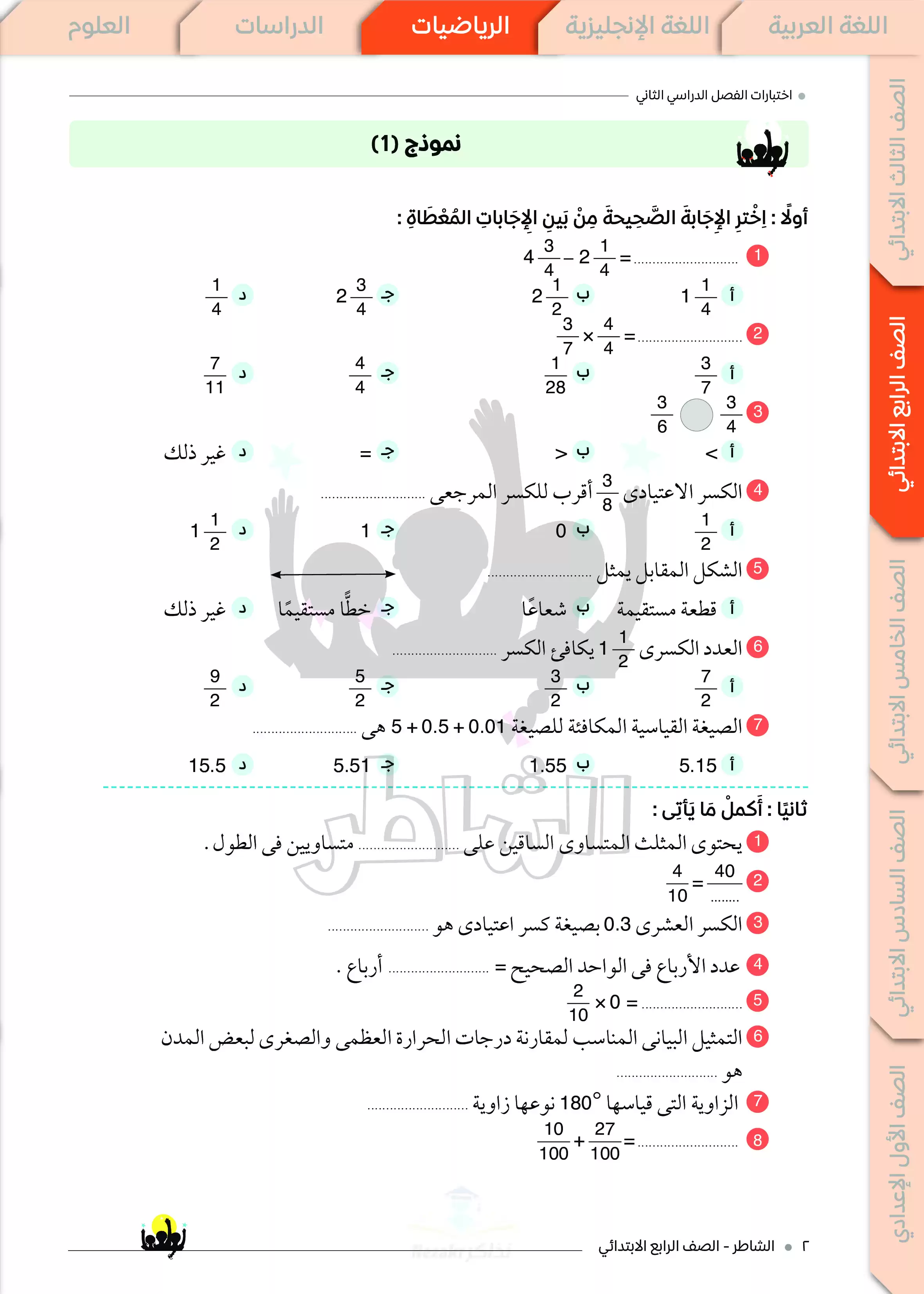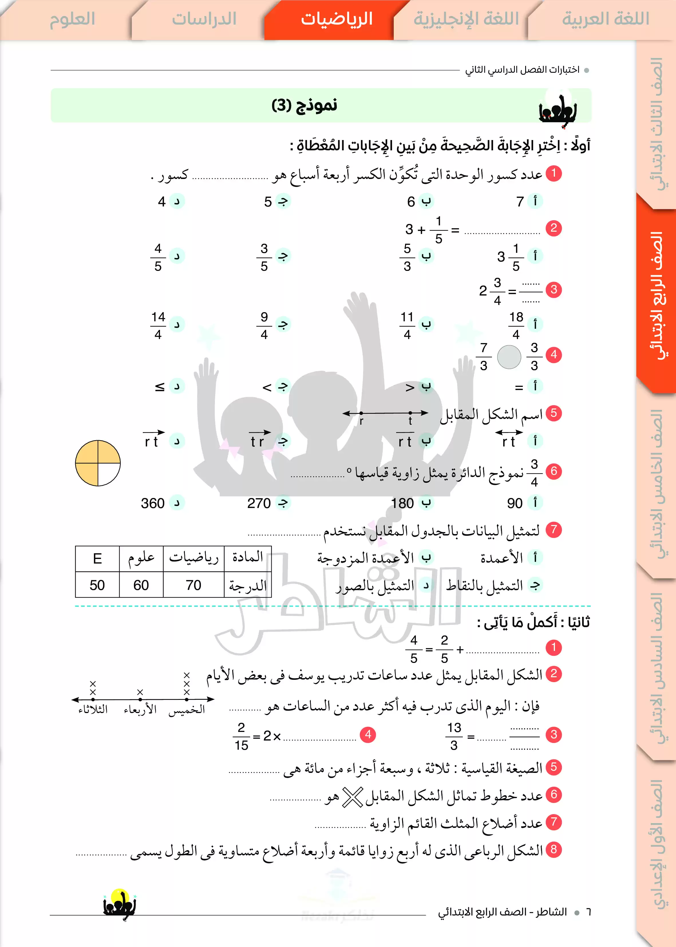 • اختبارات الشاطر في الرياضيات لرابعة ابتدائي ترم ثاني 2025 مع الإجابات النموذجية