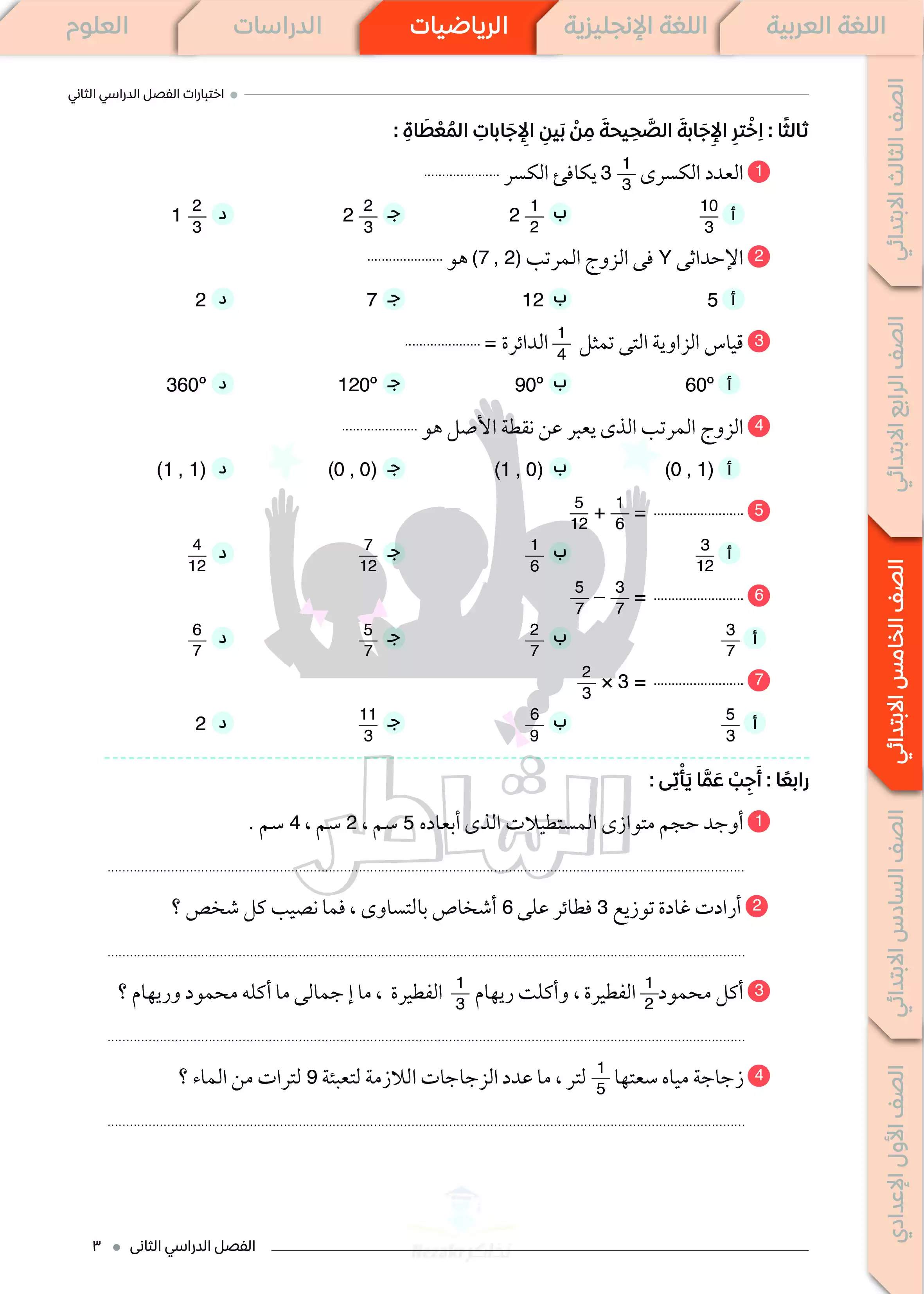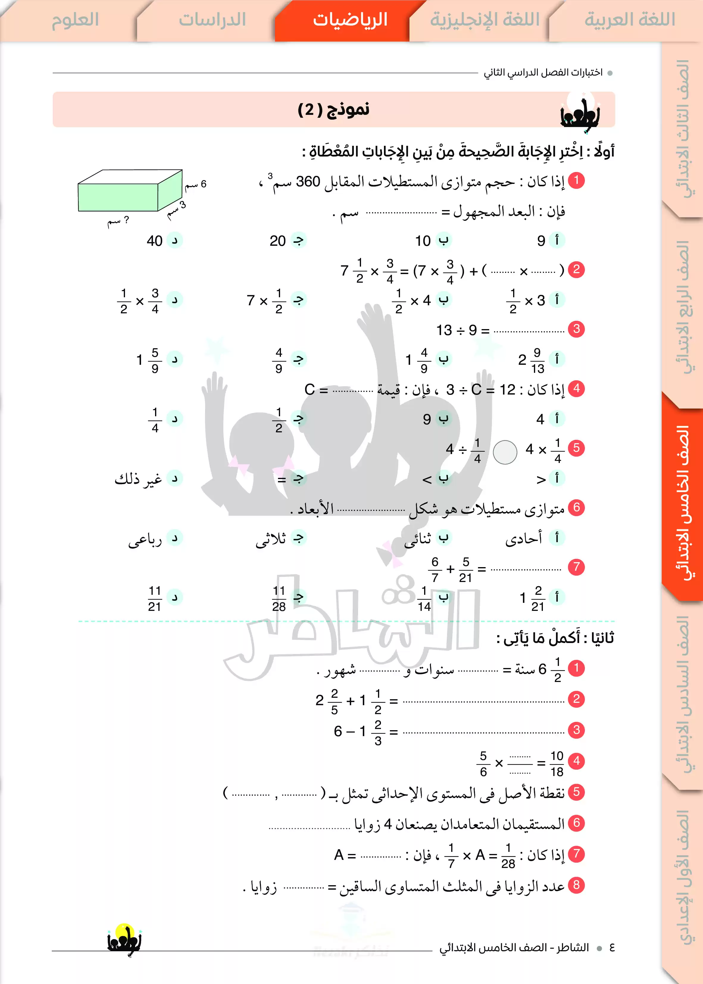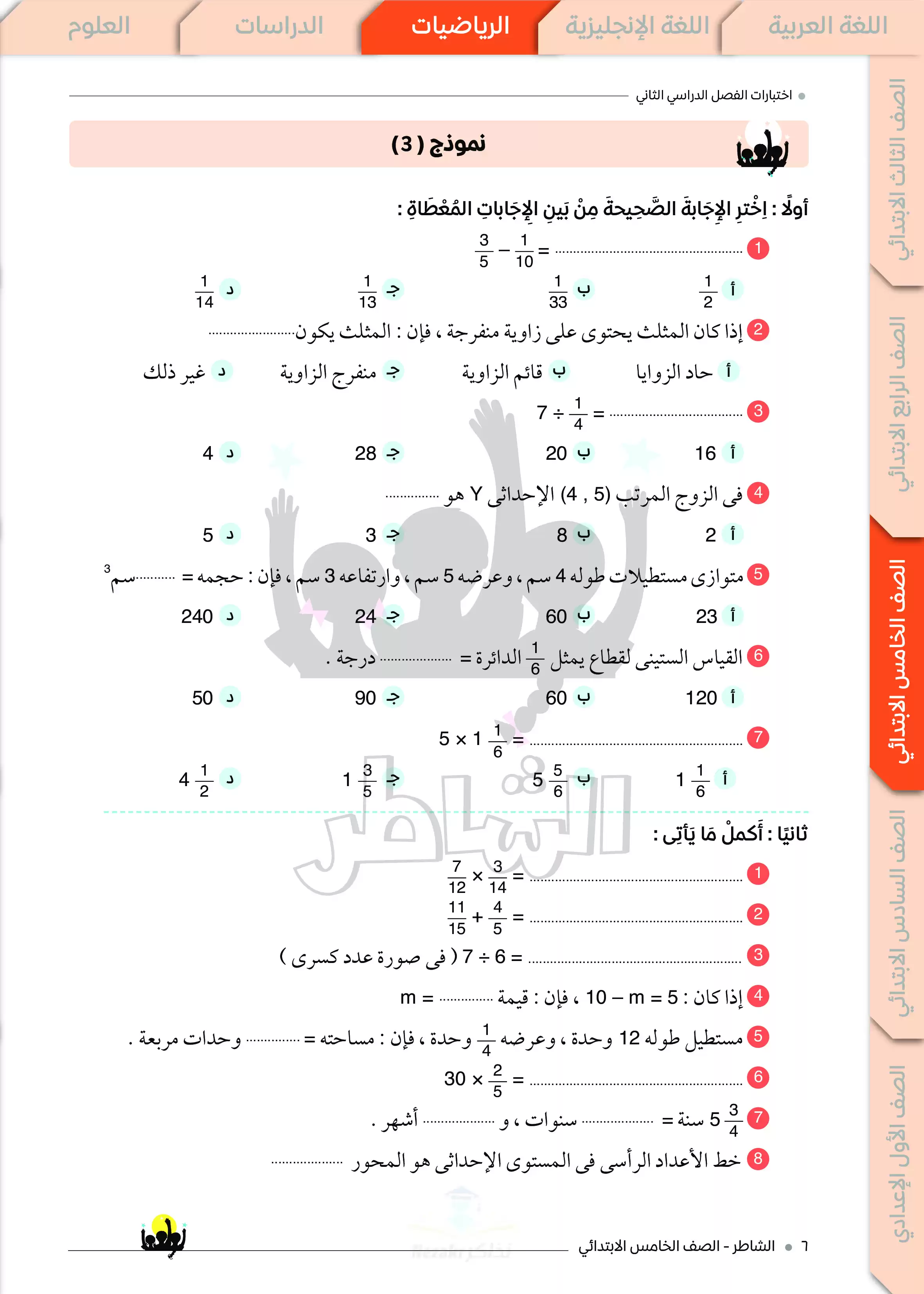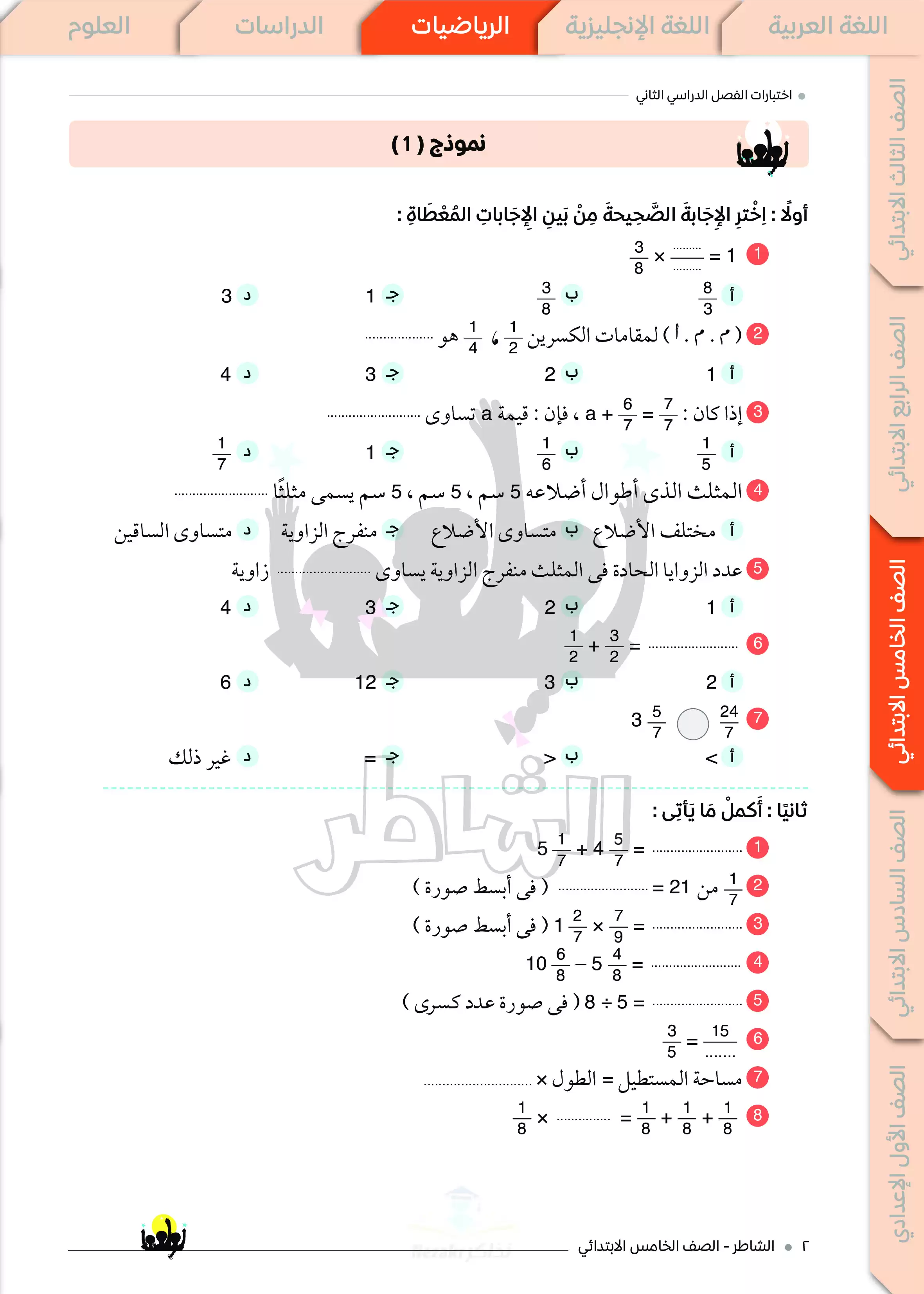 • اختبارات الشاطر في الرياضيات لخامسة ابتدائي ترم ثاني 2025 مع الإجابات النموذجية