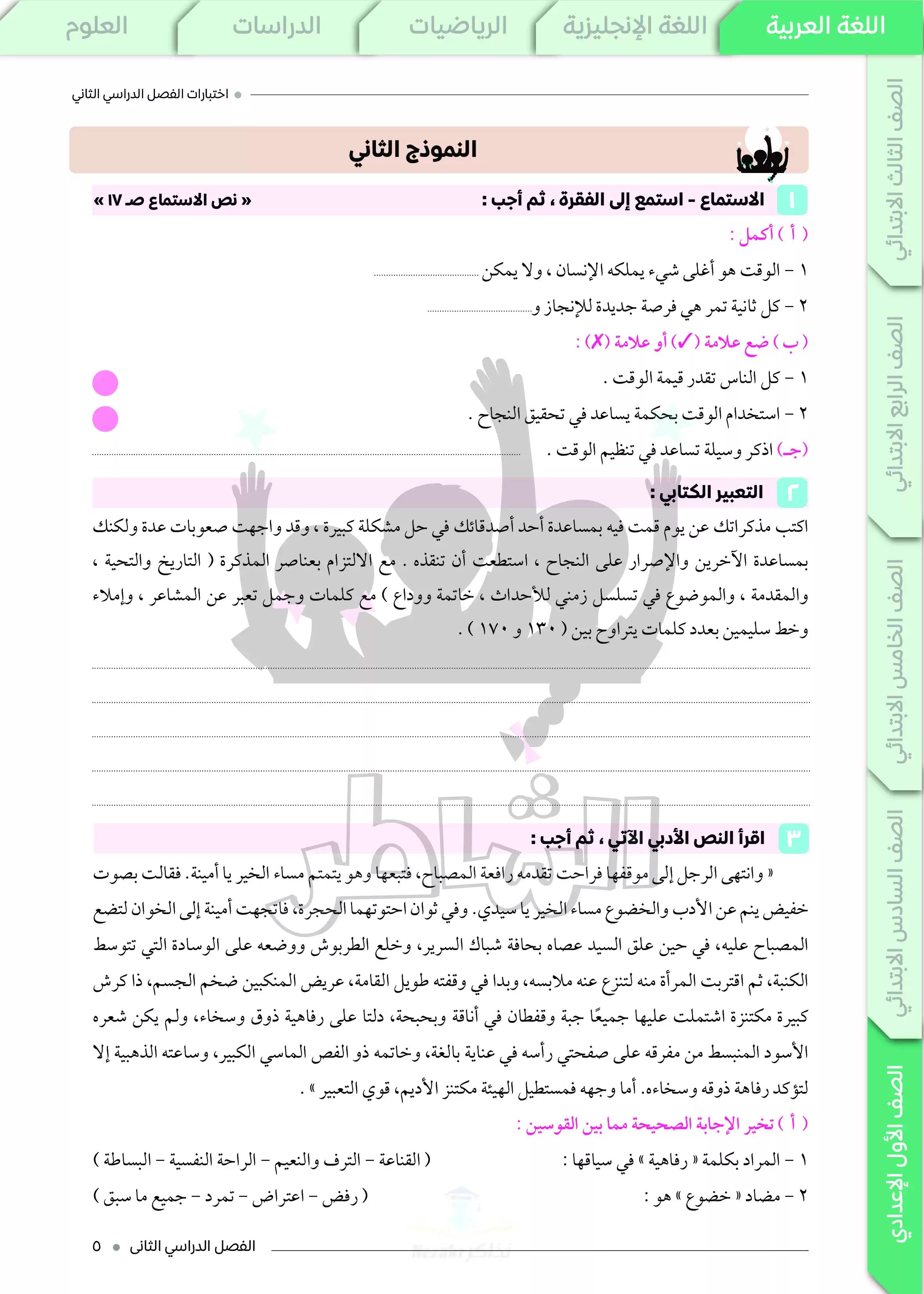 الملف بصيغة PDF وبجودة عالية ومميزة ومتاح للتحميل والتصفح أونلاين، كما يمكنك طباعته ورقيا والمذاكرة منه بسهولة أو عرضه على الهاتف أو التابلت، للتدرب على امتحان العربي في الترم الثاني أولى اعدادي.