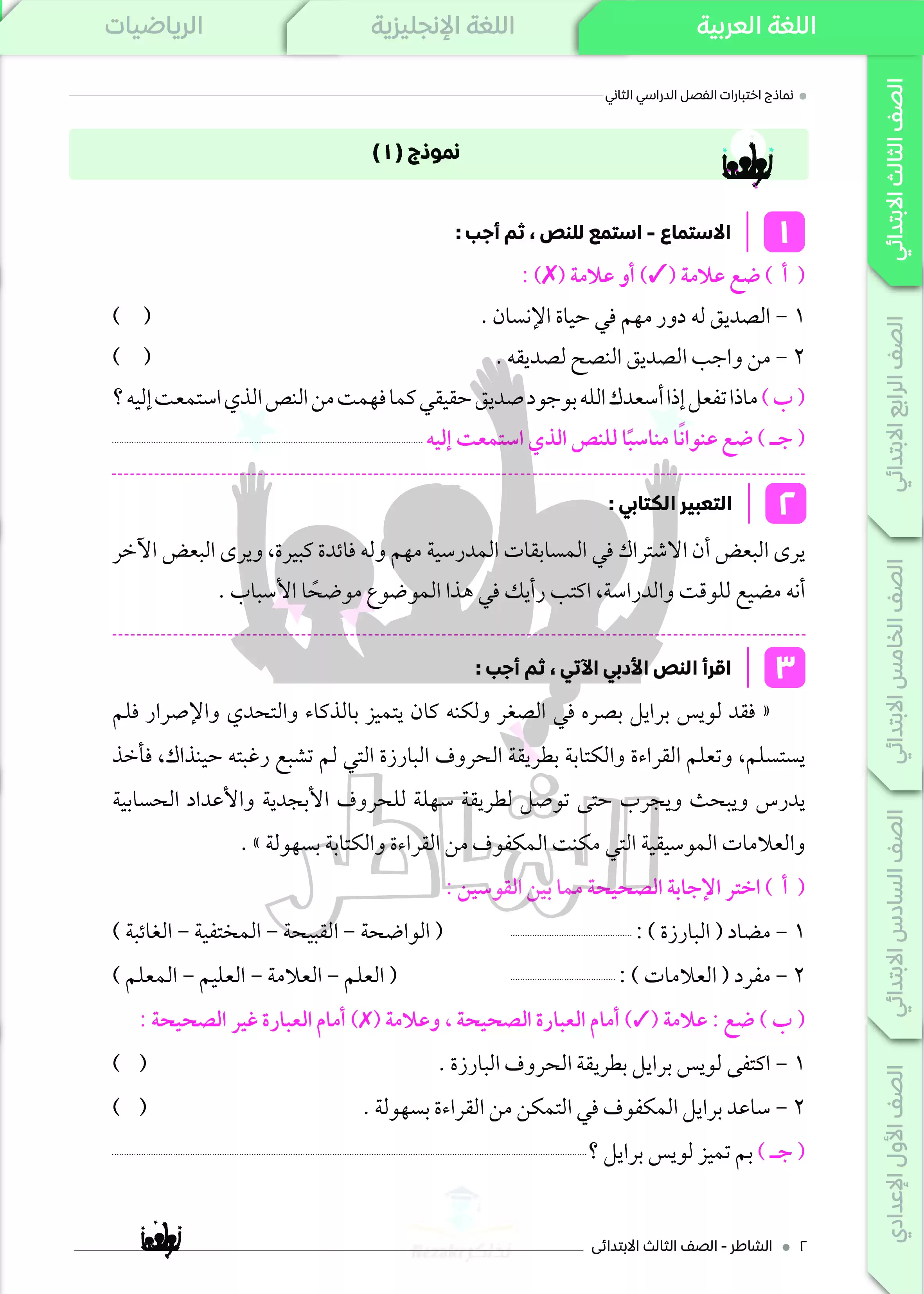 مرحباً بكم تلاميذ الصف الثالث الابتدائي، نقدم لكم نماذج اختبارات استرشادية في مادة اللغة العربية لثالثة ابتدائي ترم ثاني 2025 من إعداد سلسلة كتب الشاطر، ويتكون الملف من نماذج امتحانات مميزة تغطية كافة أجزاء منهج العربي للصف الثالث الابتدائي الفصل الدراسي الثاني، ليتمكن الطالب من خلالها من التدريب على نظام امتحان آخر العام في اللغة العربية وطريقة وضع الأسئلة الامتحانية، كما يتعود على شكل الامتحان ولا يكون عند الطالب رهبة منه.