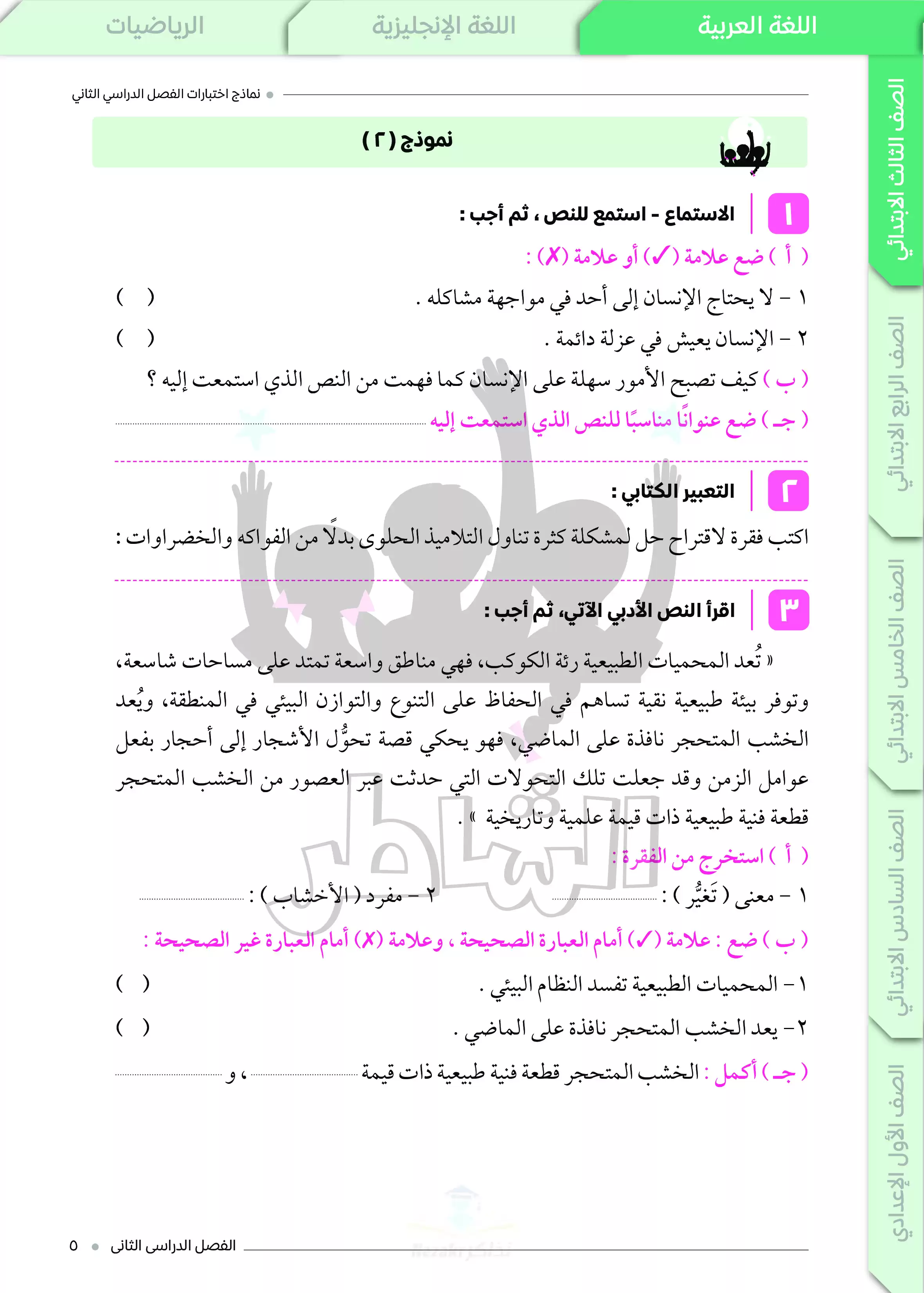 الملف بصيغة PDF وبجودة عالية ومميزة ومتاح للتحميل والتصفح أونلاين، كما يمكنك طباعته ورقيا والمذاكرة منه بسهولة أو عرضه على الهاتف أو التابلت، للتدرب على امتحان اللغة العربية في الترم الثاني ثالثة ابتدائي.