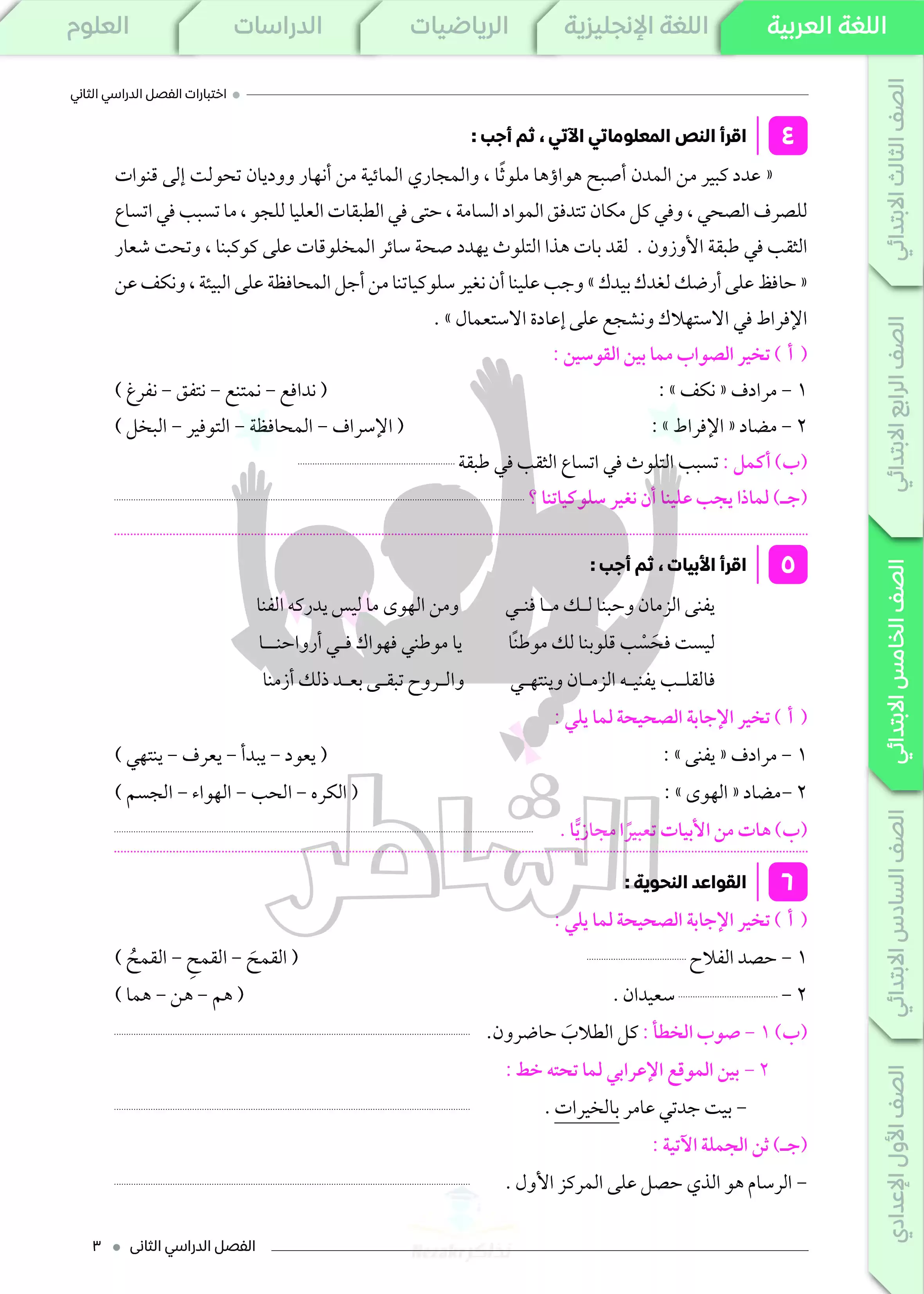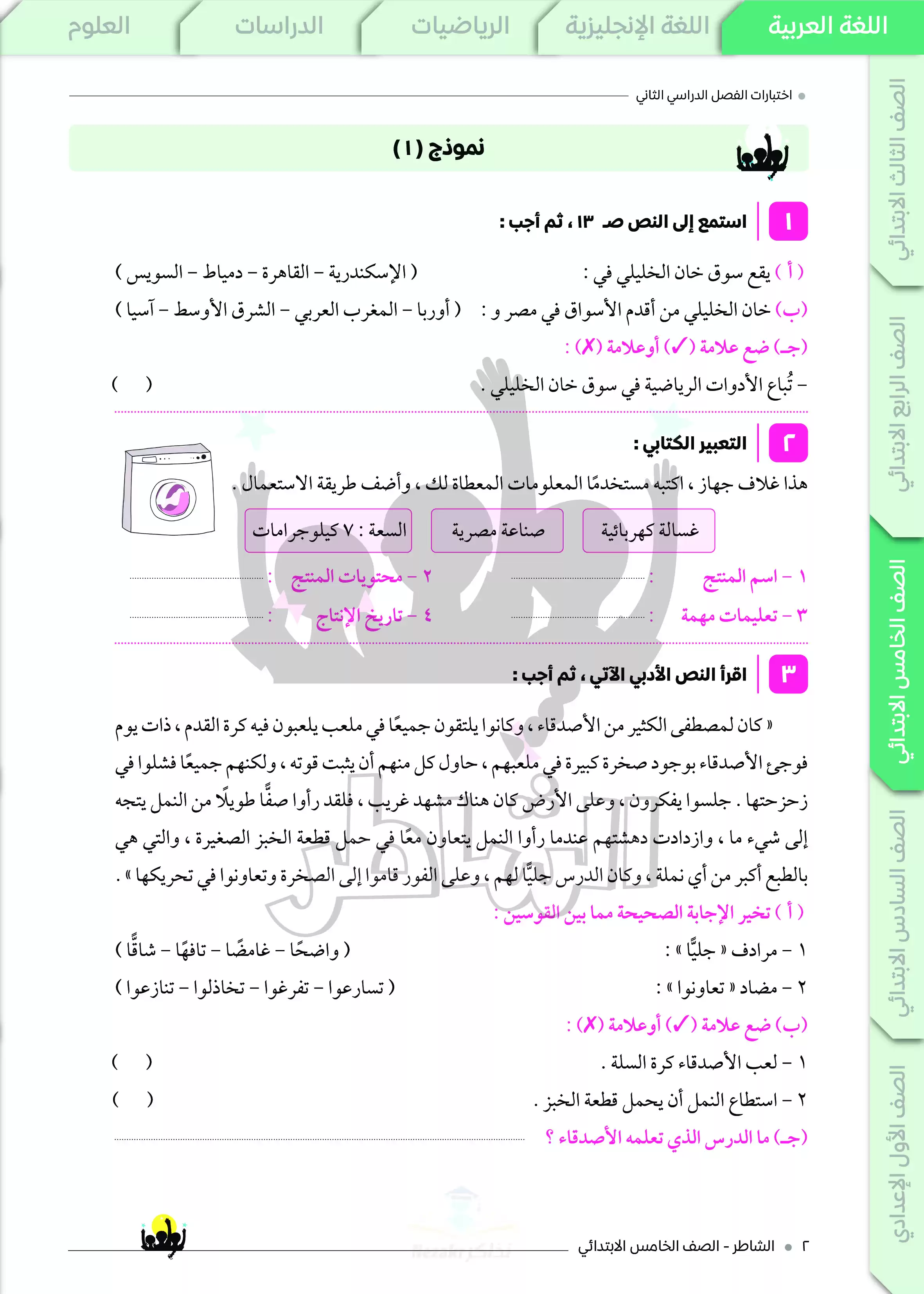 مرحباً بكم تلاميذ الصف الخامس الابتدائي، نقدم لكم نماذج اختبارات استرشادية في مادة اللغة العربية لخامسة ابتدائي ترم ثاني 2025 من إعداد سلسلة كتب الشاطر، ويتكون الملف من نماذج امتحانات مميزة تغطية كافة أجزاء منهج العربي للصف الخامس الابتدائي الفصل الدراسي الثاني، ليتمكن الطالب من خلالها من التدريب على نظام امتحان آخر العام في اللغة العربية وطريقة وضع الأسئلة الامتحانية، كما يتعود على شكل الامتحان ولا يكون عند الطالب رهبة منه.