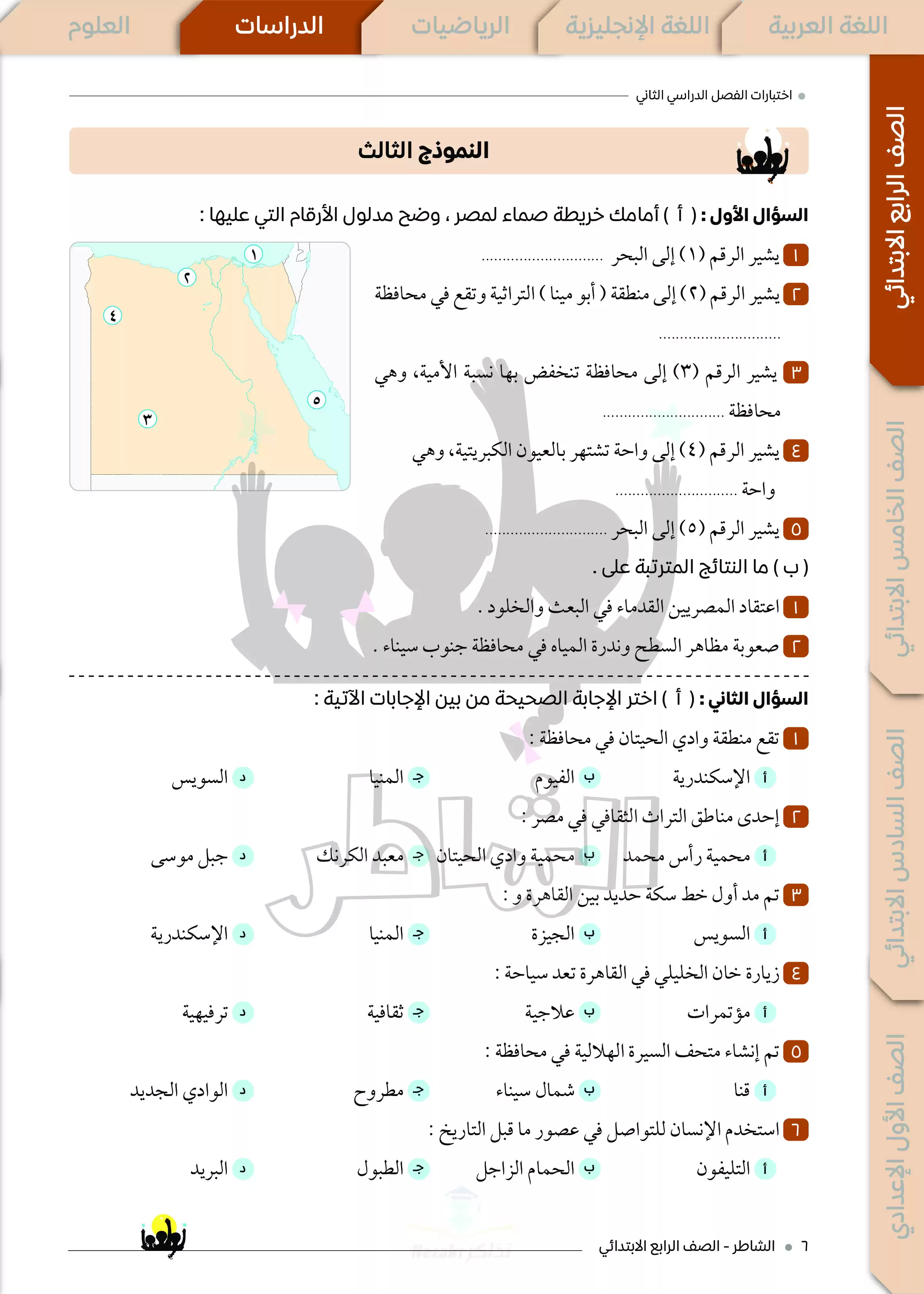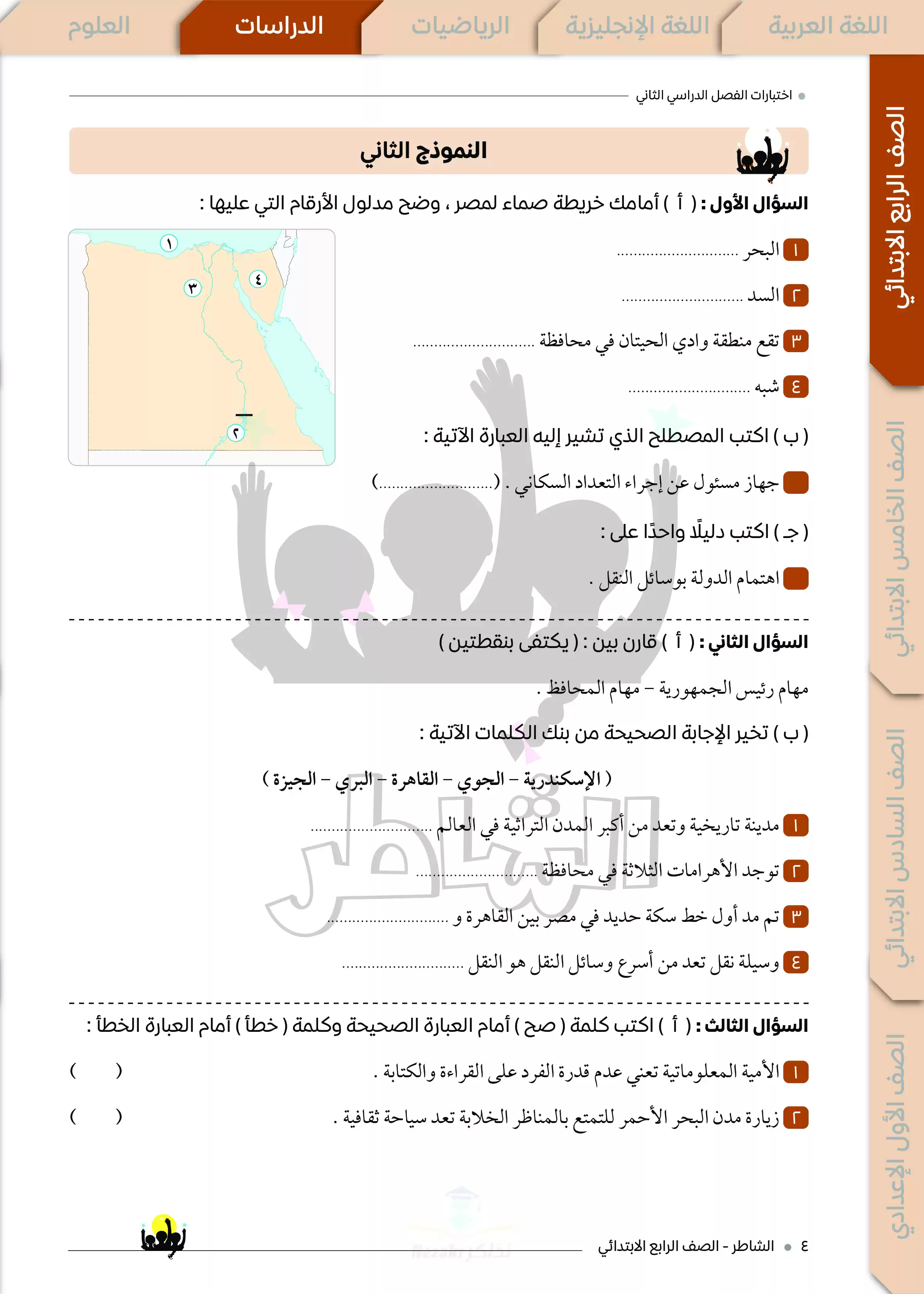 مرحباً بكم تلاميذ الصف الرابع الابتدائي، نقدم لكم نماذج اختبارات استرشادية في مادة الدراسات الاجتماعية لرابعة ابتدائي ترم ثاني 2025 من إعداد سلسلة كتب الشاطر، ويتكون الملف من نماذج امتحانات مميزة تغطية كافة أجزاء منهج الدراسات للصف الرابع الابتدائي الفصل الدراسي الثاني، ليتمكن الطالب من خلالها من التدريب على نظام امتحان آخر العام في الدراسات وطريقة وضع الأسئلة الامتحانية، كما يتعود على شكل الامتحان ولا يكون عند الطالب رهبة منه.
