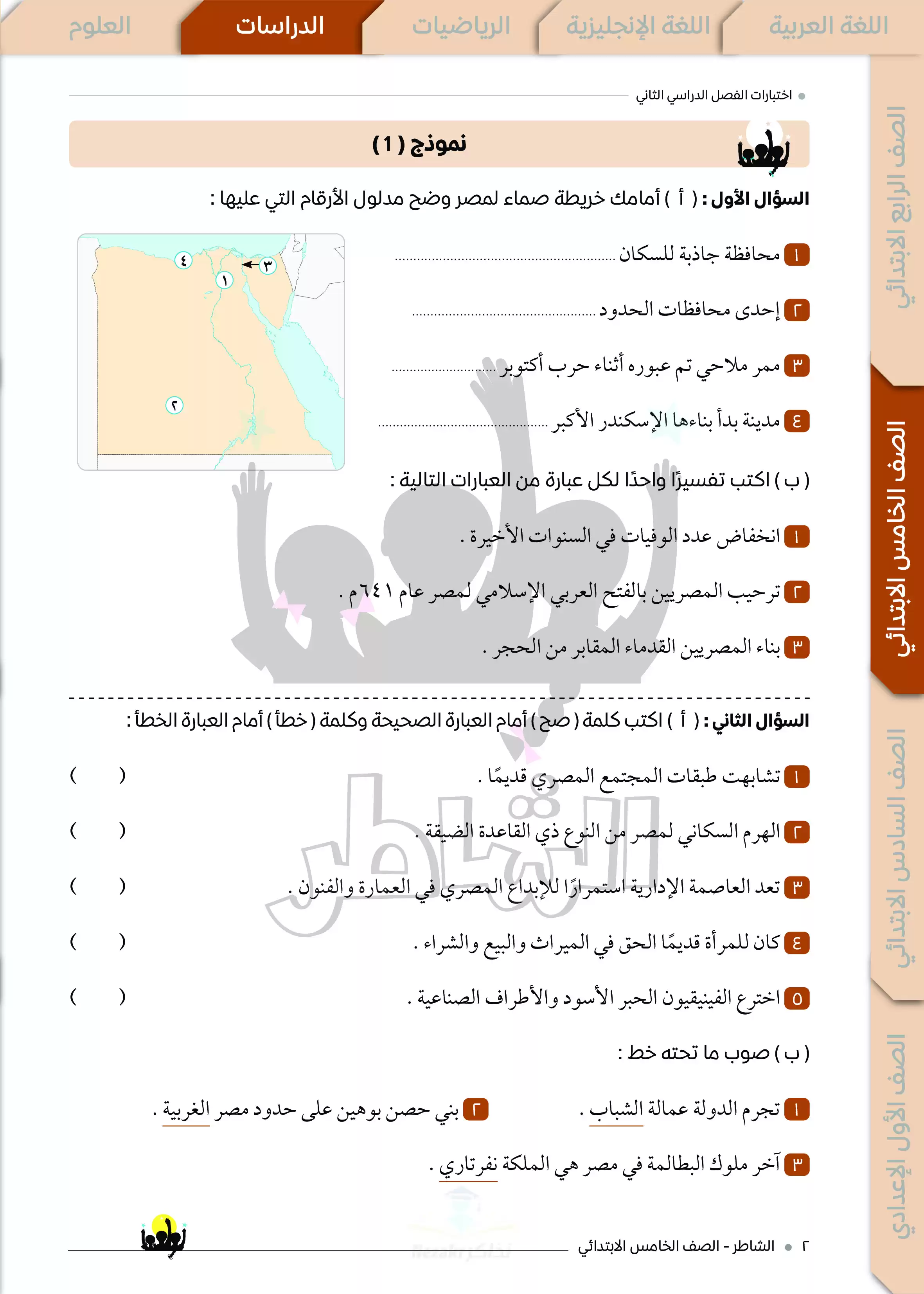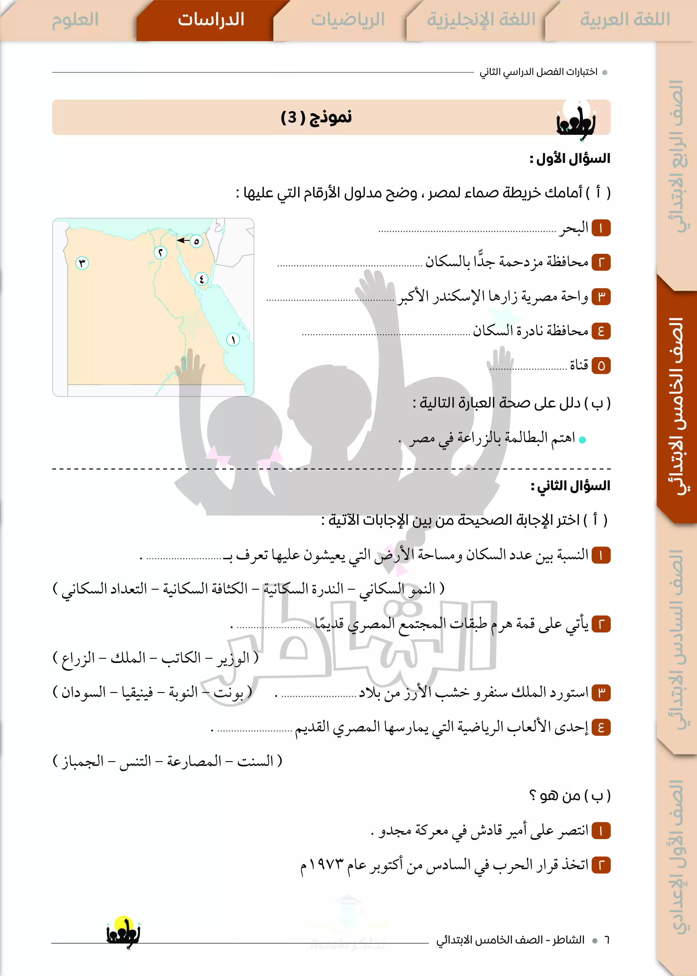 مرحباً بكم تلاميذ الصف الخامس الابتدائي، نقدم لكم نماذج اختبارات استرشادية في مادة الدراسات الاجتماعية لخامسة ابتدائي ترم ثاني 2025 من إعداد سلسلة كتب الشاطر، ويتكون الملف من نماذج امتحانات مميزة تغطية كافة أجزاء منهج الدراسات للصف الخامس الابتدائي الفصل الدراسي الثاني، ليتمكن الطالب من خلالها من التدريب على نظام امتحان آخر العام في الدراسات وطريقة وضع الأسئلة الامتحانية، كما يتعود على شكل الامتحان ولا يكون عند الطالب رهبة منه.