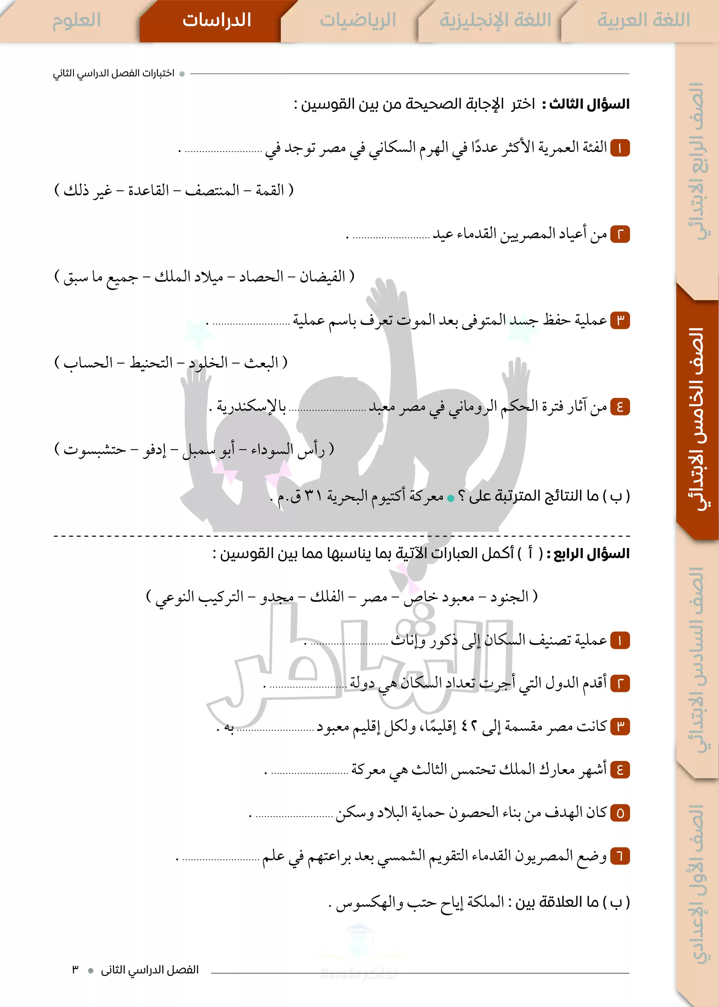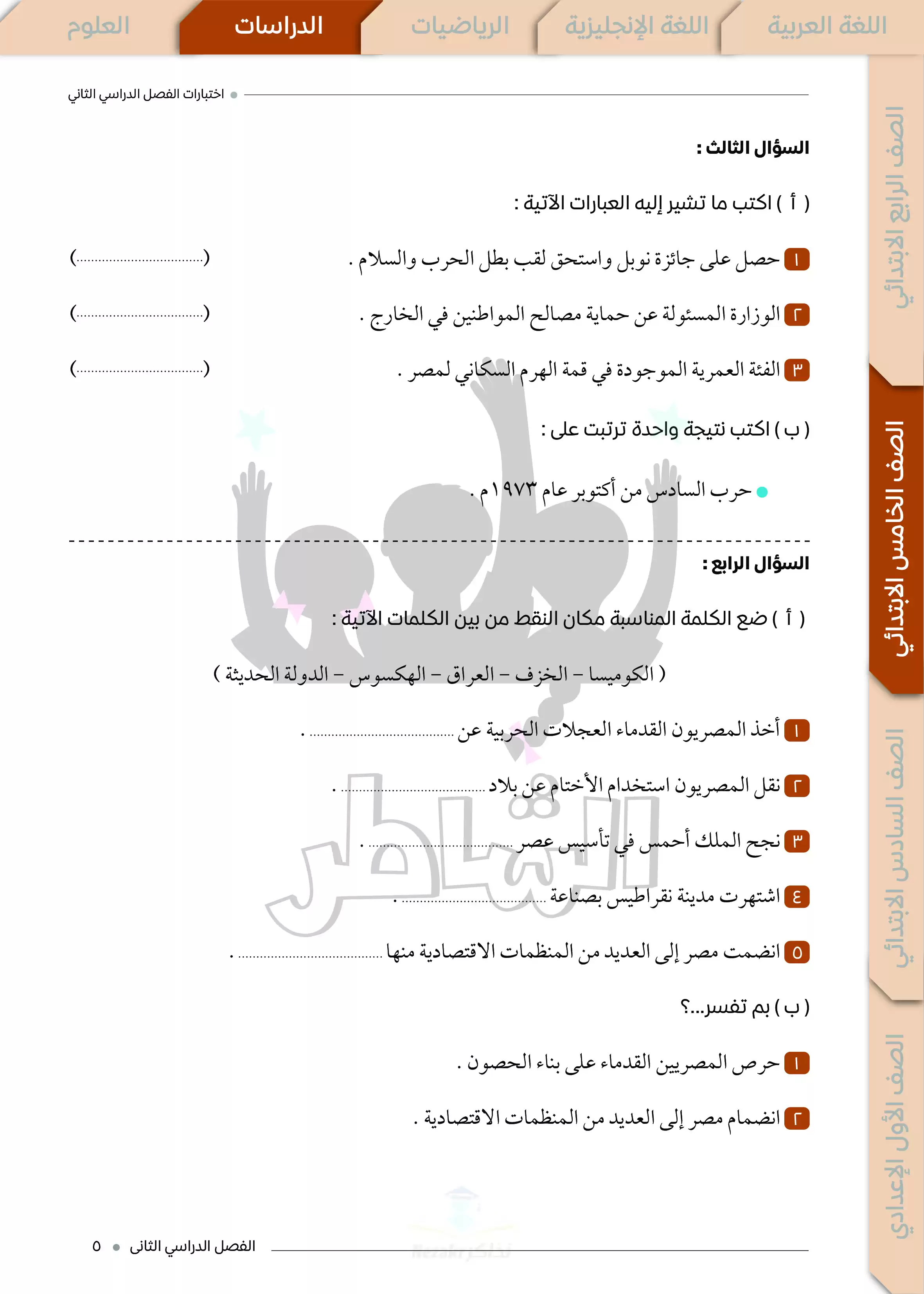 الملف بصيغة PDF وبجودة عالية ومميزة ومتاح للتحميل والتصفح أونلاين، كما يمكنك طباعته ورقيا والمذاكرة منه بسهولة أو عرضه على الهاتف أو التابلت، للتدرب على امتحان الدراسات في الترم الثاني خامسة ابتدائي.