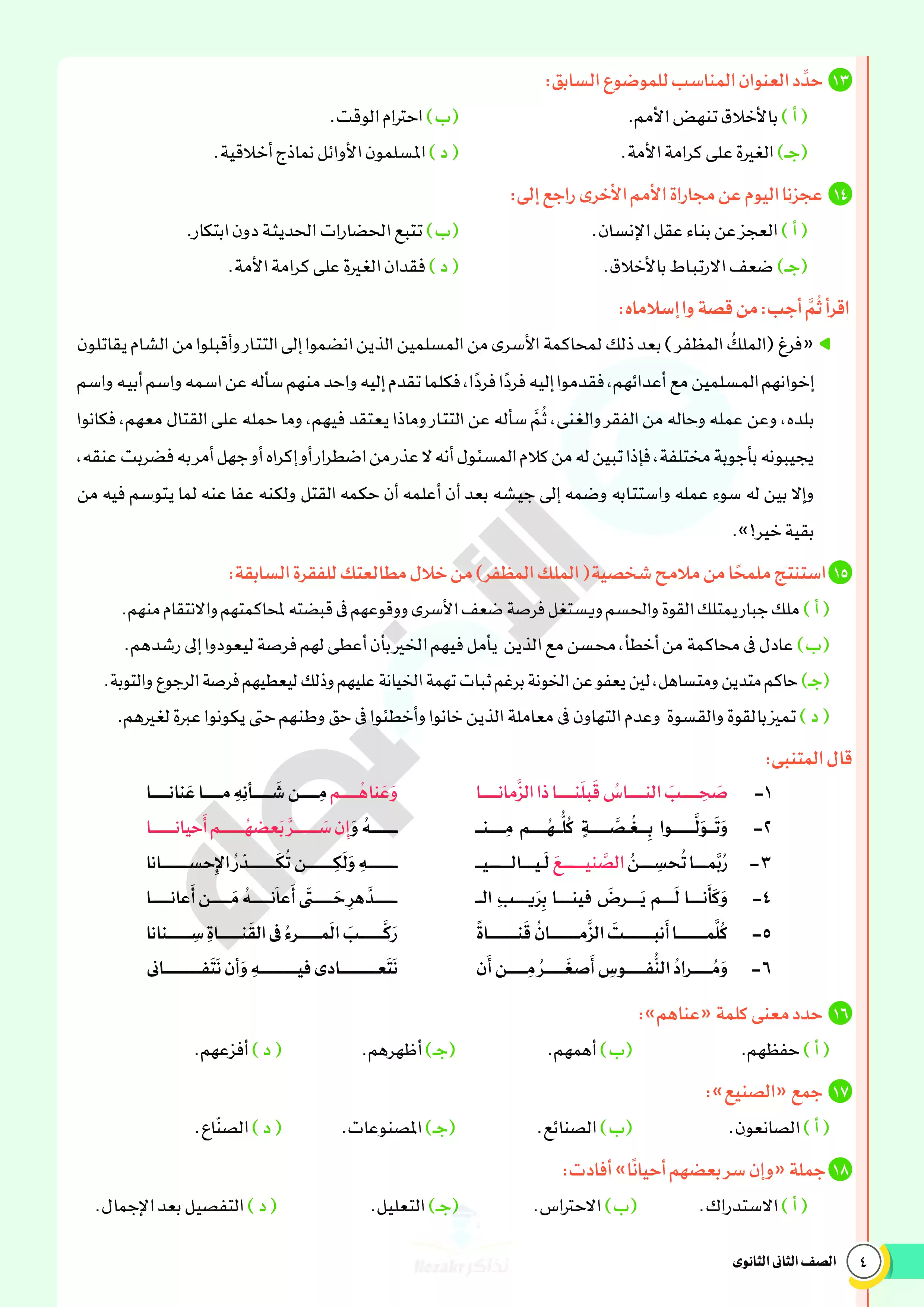 صفحة 4 من 46 صفحة من ملف: نماذج اختبارات ومراجعة الأضواء النهائية في مادة اللغة العربية للصف الثاني الثانوي الترم الثاني 2025 - Nezakr