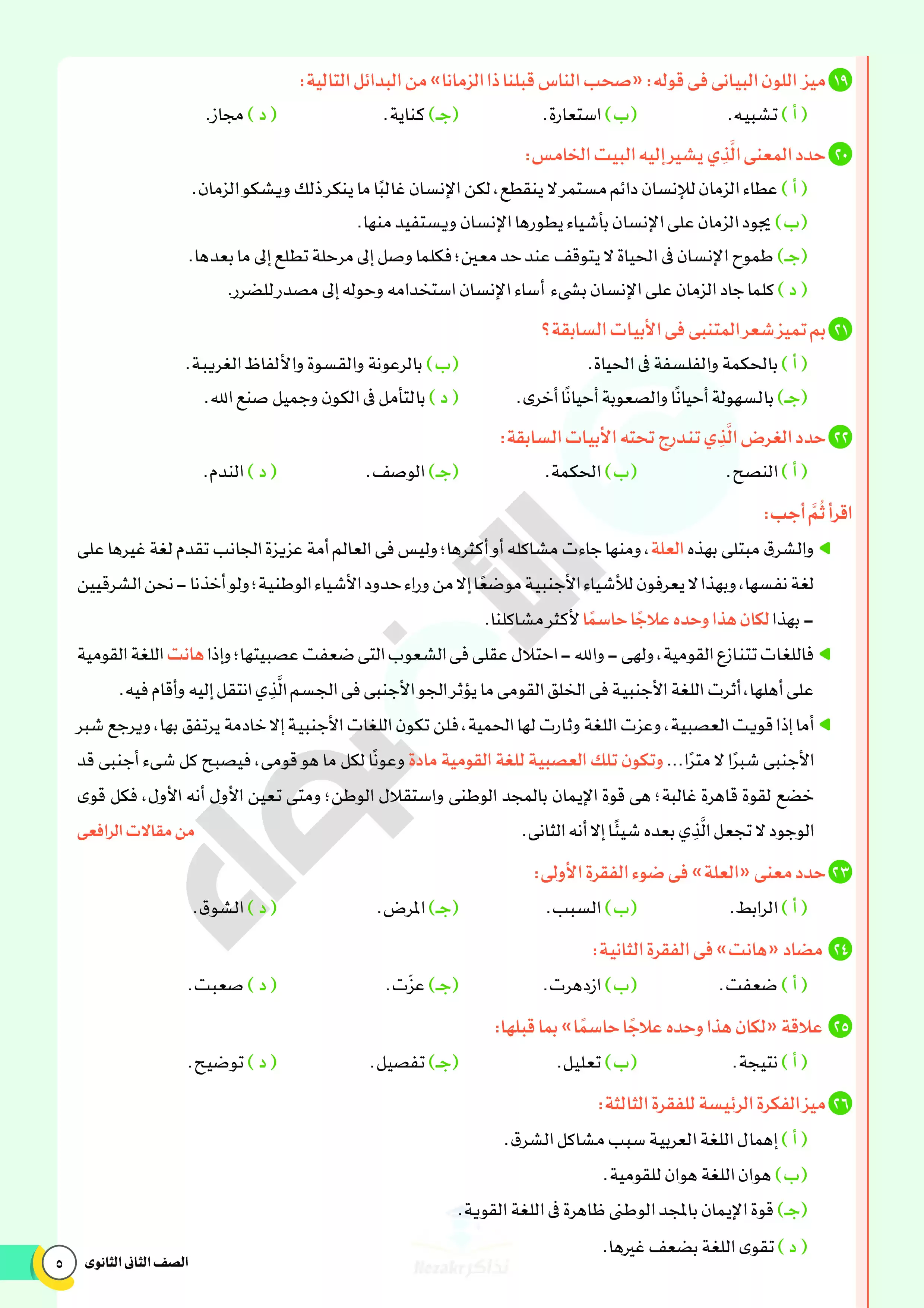 صفحة 5 من 46 صفحة من ملف: نماذج اختبارات ومراجعة الأضواء النهائية في مادة اللغة العربية للصف الثاني الثانوي الترم الثاني 2025 - Nezakr