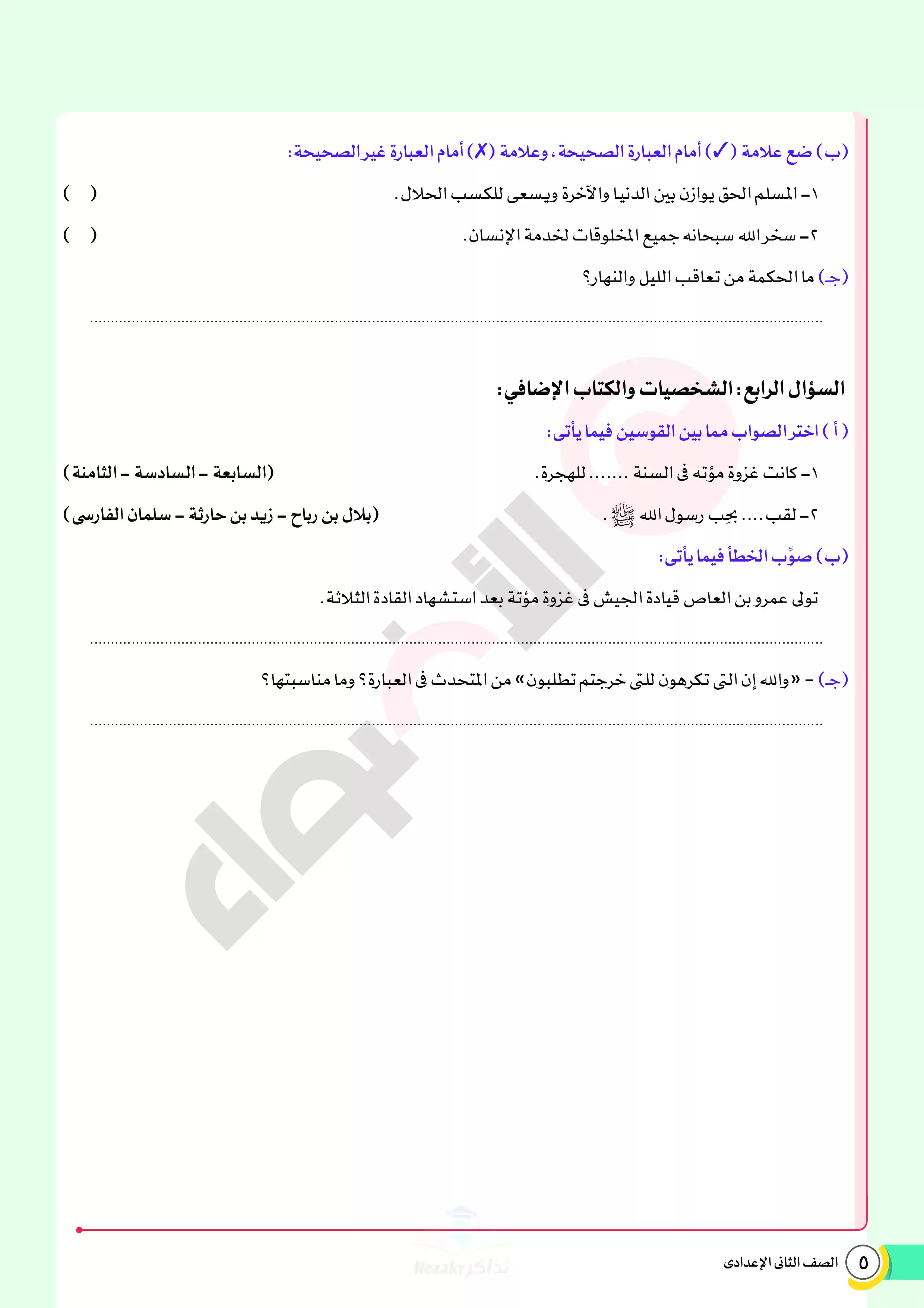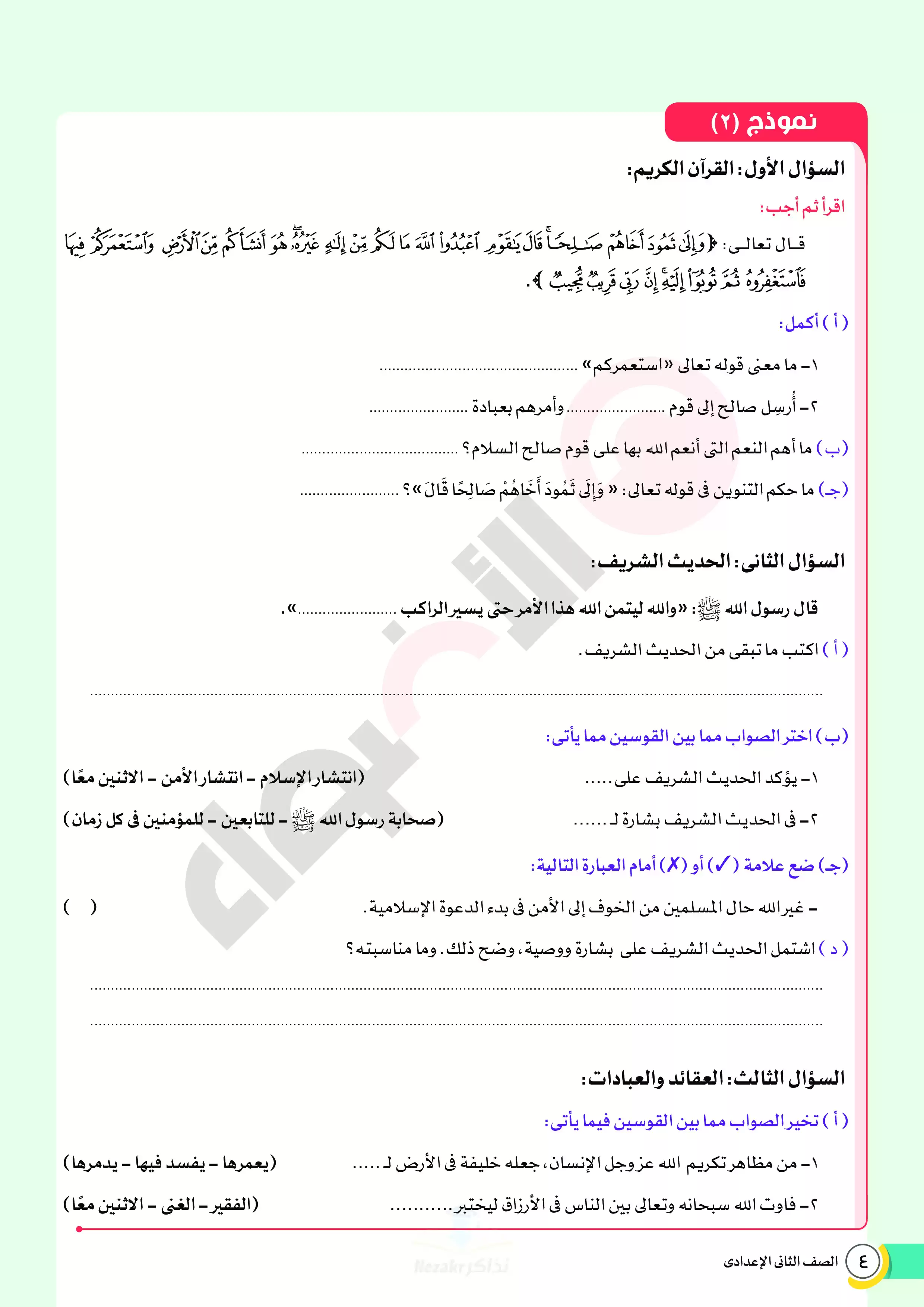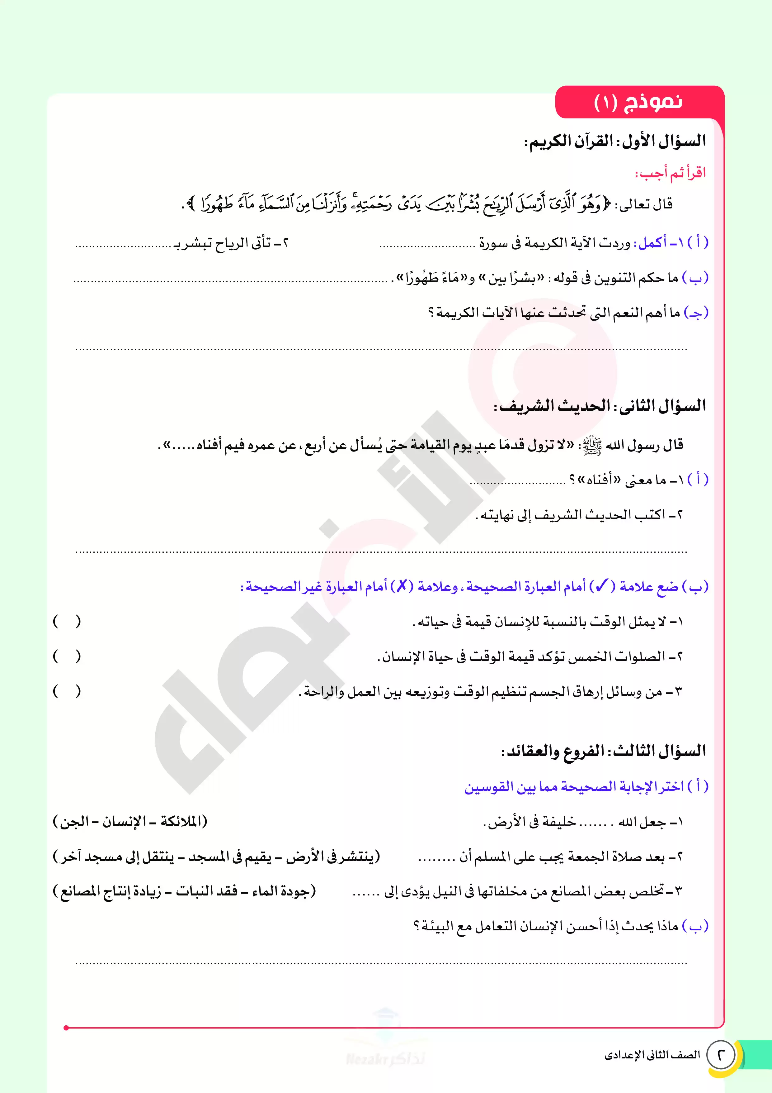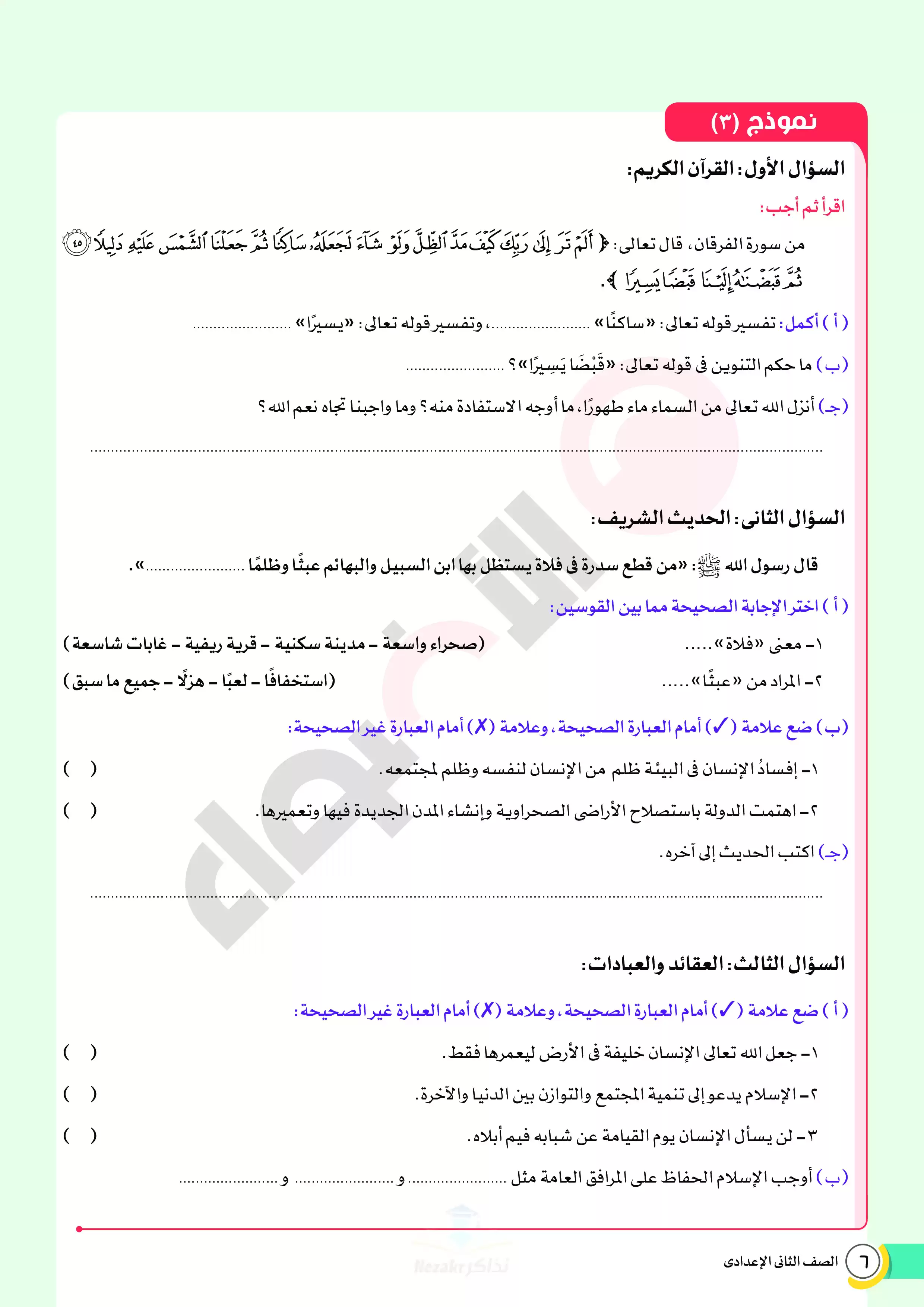 | بيانات الملف: (نماذج اختبارات ومراجعة الأضواء النهائية في مادة الدين للصف الثاني الإعدادي الترم الثاني 2025 - Nezakr) | |