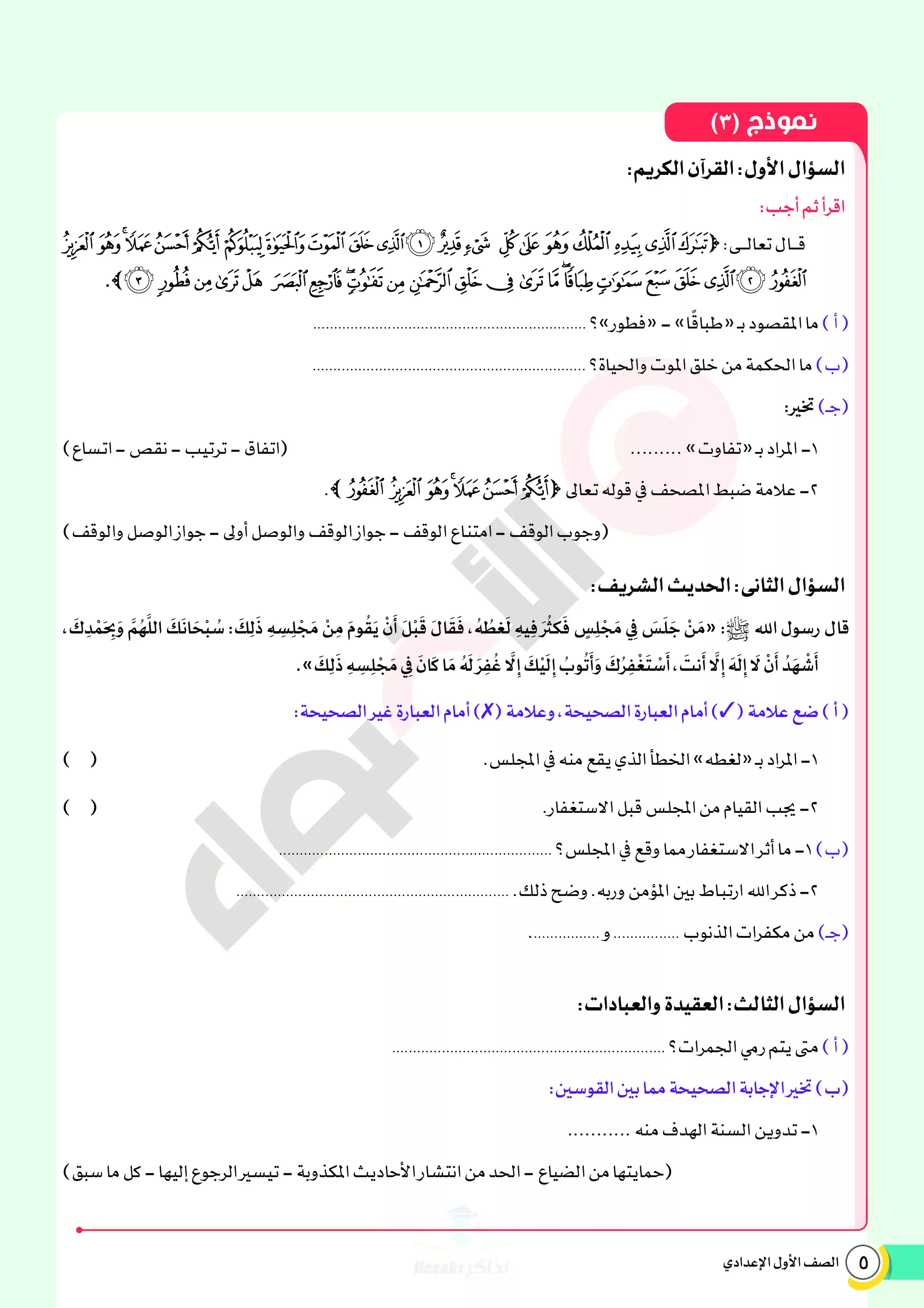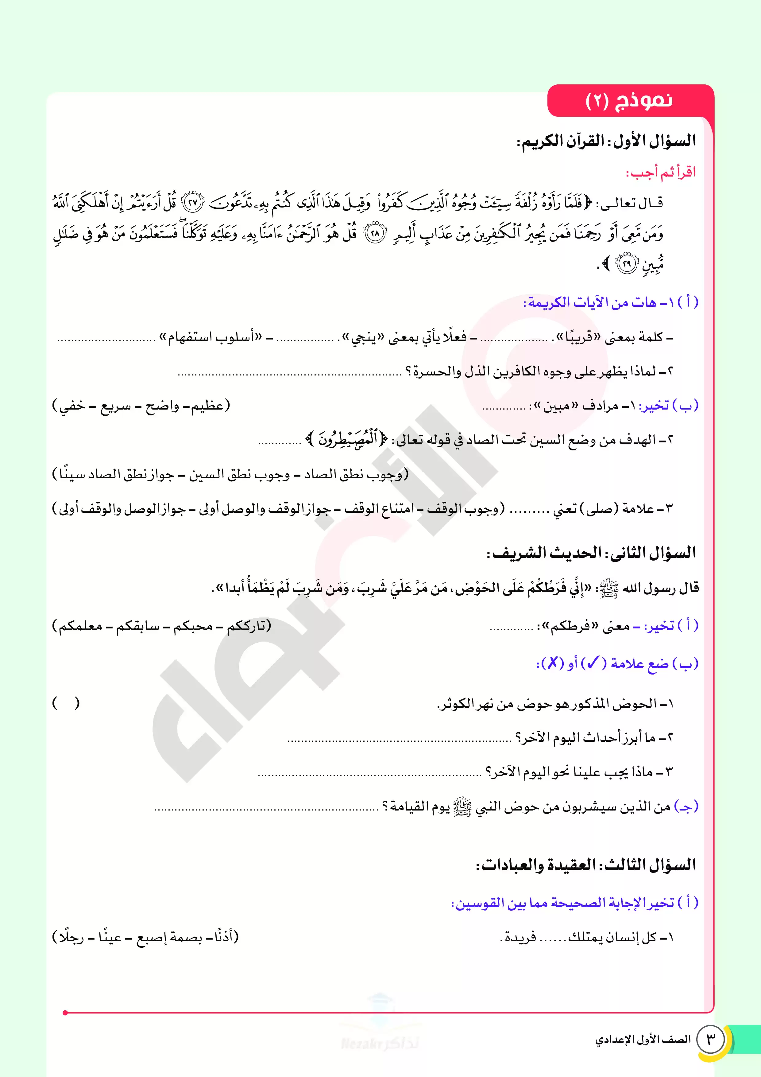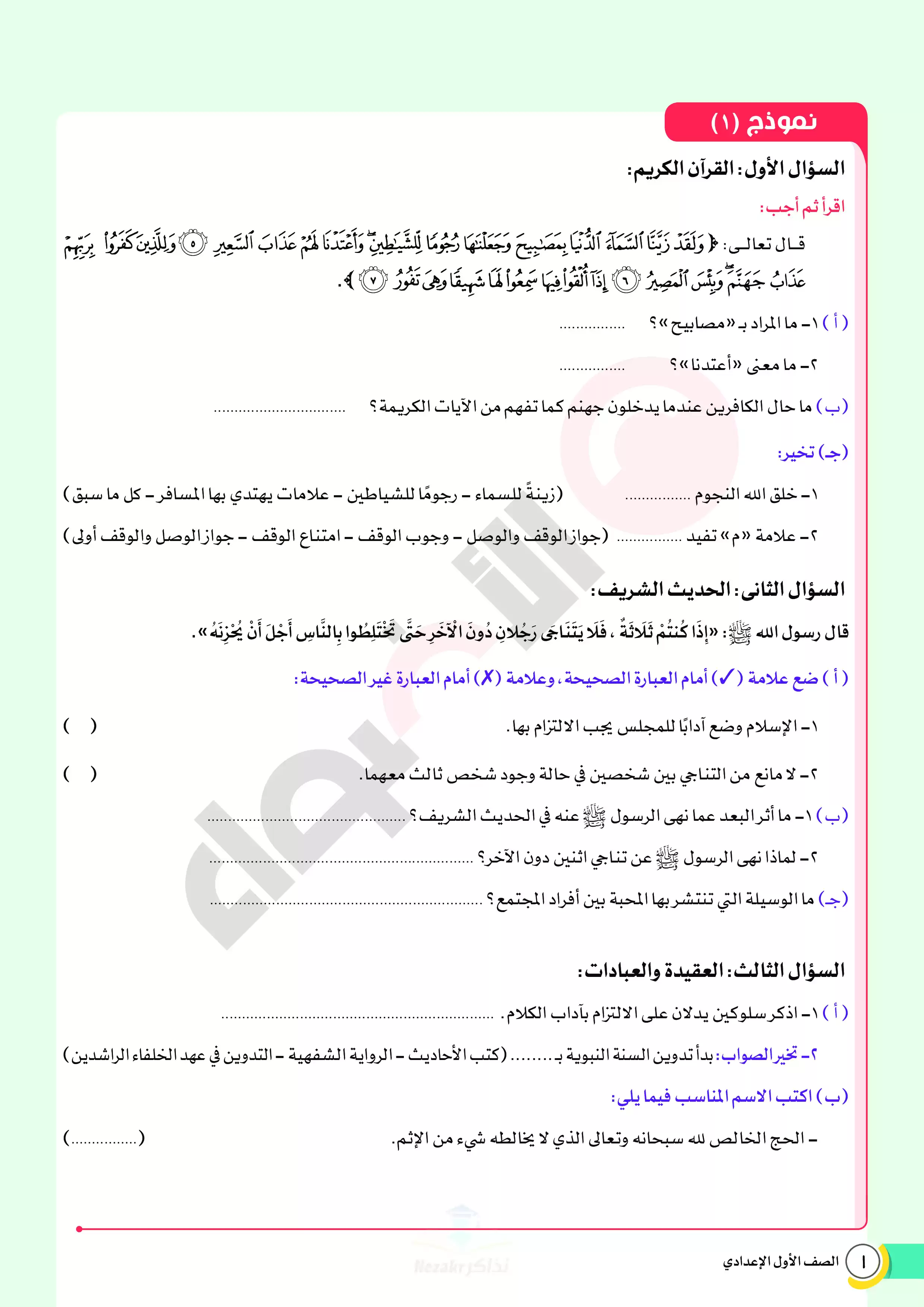 | بيانات الملف: (نماذج اختبارات ومراجعة الأضواء النهائية في مادة الدين للصف الأول الإعدادي الترم الثاني 2025 - Nezakr) | |