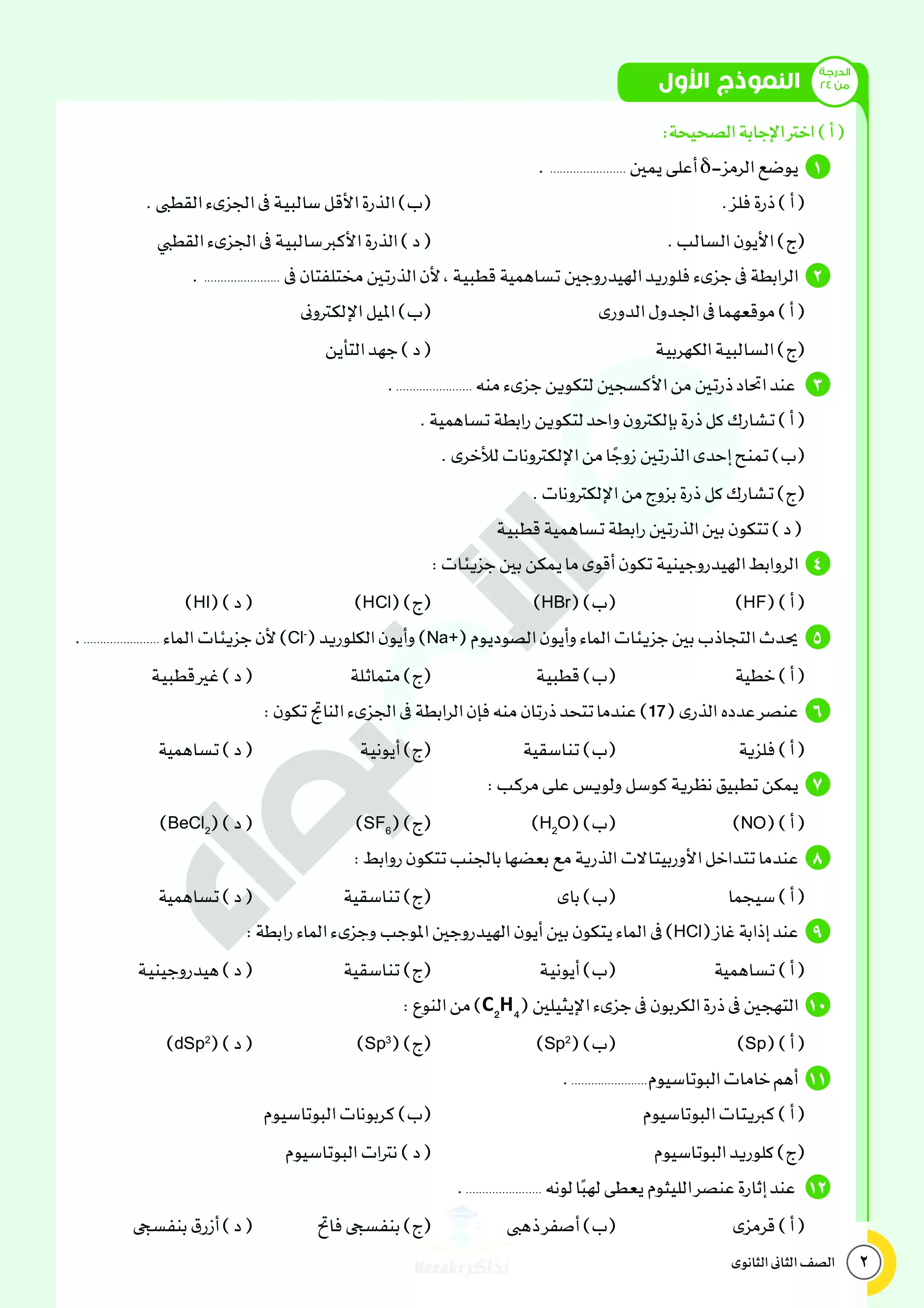 صفحة 2 من 28 صفحة من ملف: نماذج اختبارات ومراجعة الأضواء النهائية في مادة الكيمياء للصف الثاني الثانوي الترم الثاني 2025 - Nezakr