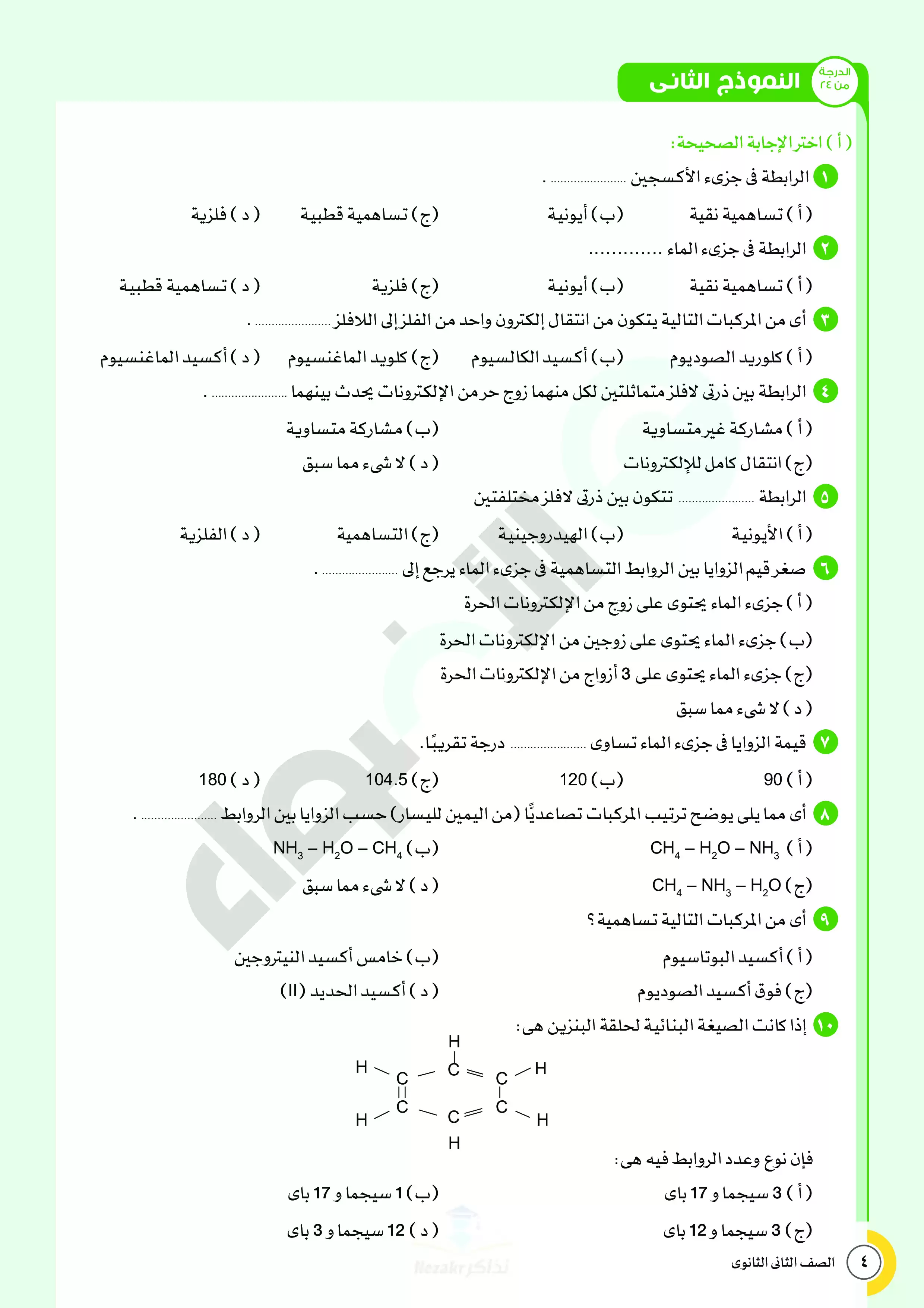 صفحة 4 من 28 صفحة من ملف: نماذج اختبارات ومراجعة الأضواء النهائية في مادة الكيمياء للصف الثاني الثانوي الترم الثاني 2025 - Nezakr
