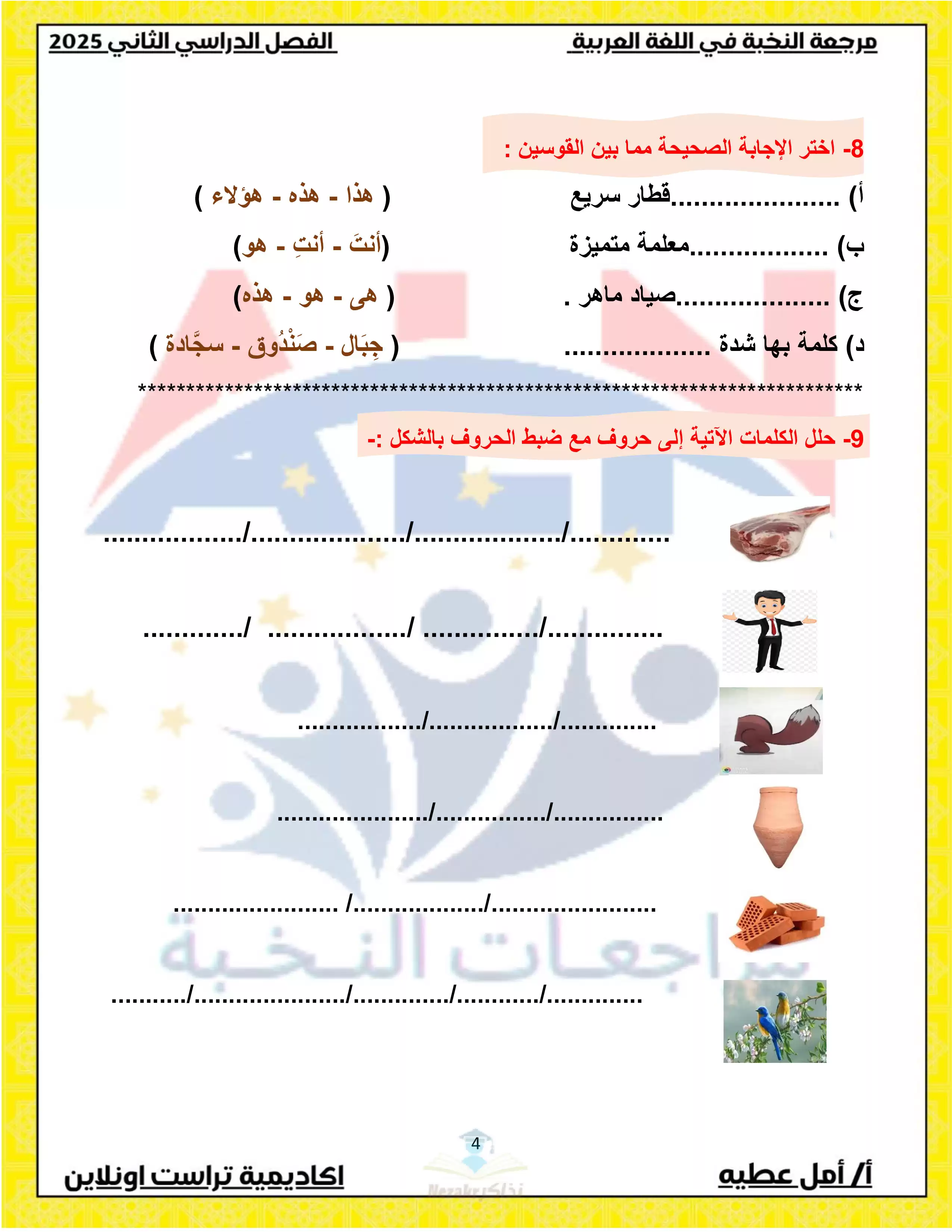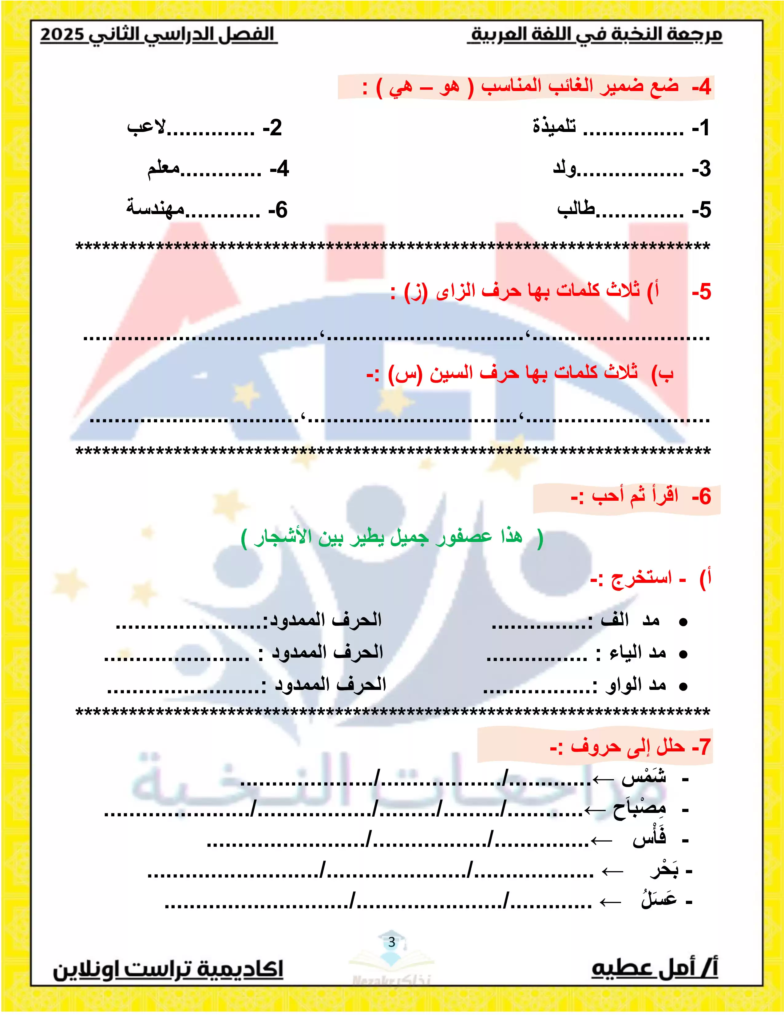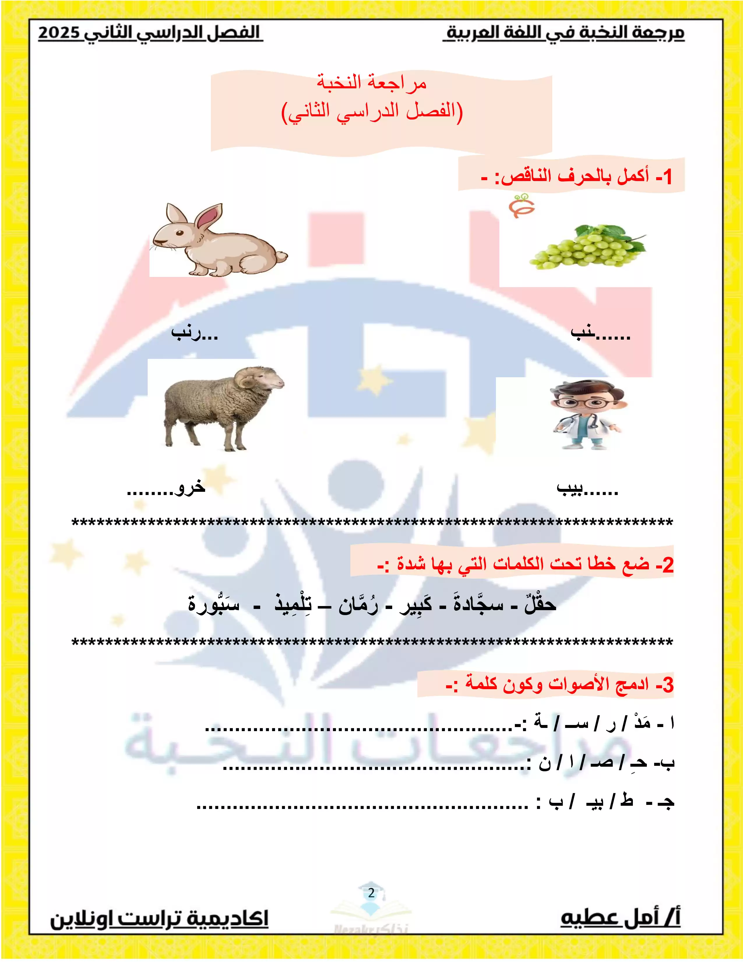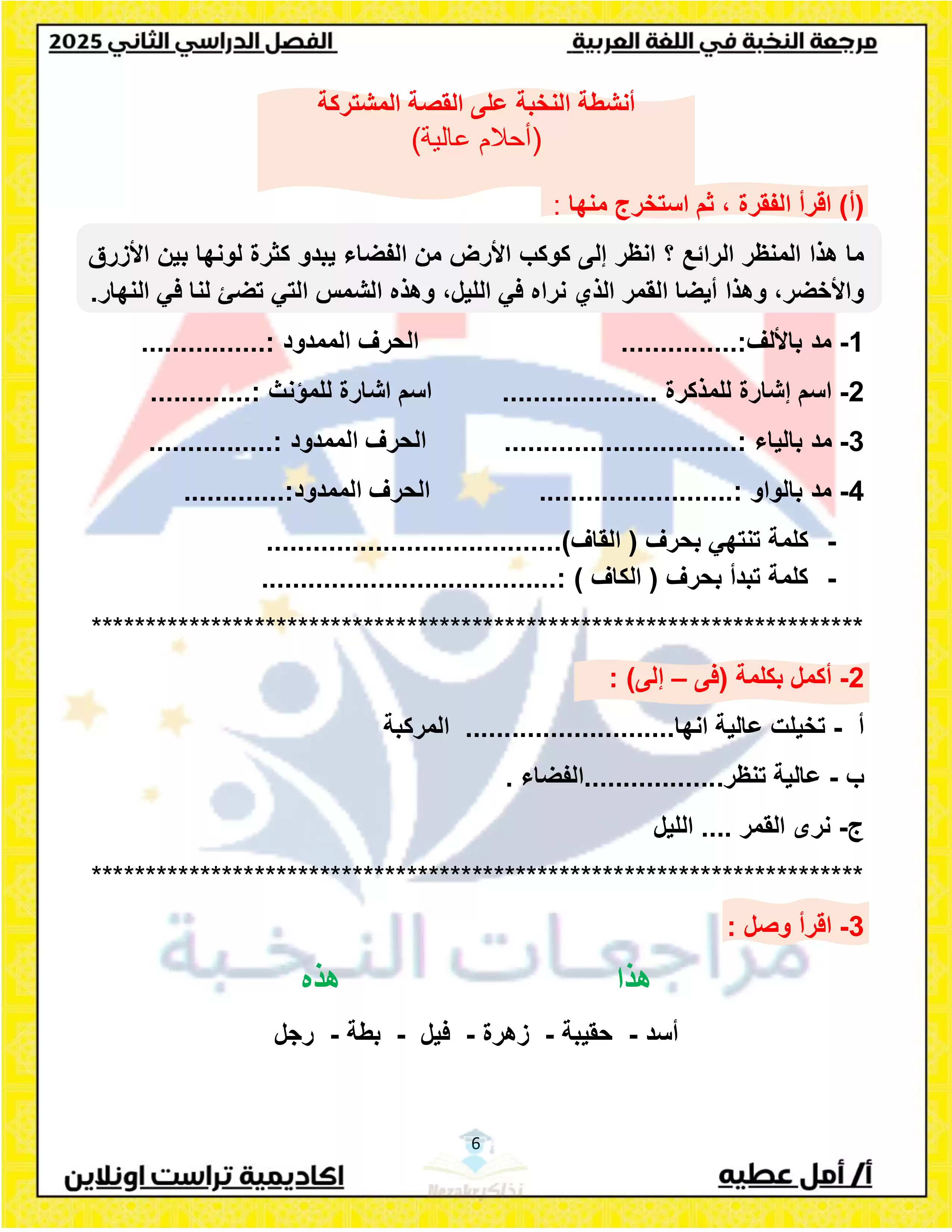 نقدم لكم لكم ملف مراجعة مميز بصيغة PDF، يمكن تحميله بسهولة وطباعته بجودة ممتازة بكل بساطة، وذلك في المراجعة النهائية لمنهج اللغة العربية للصف الاول الابتدائي الترم الثاني.