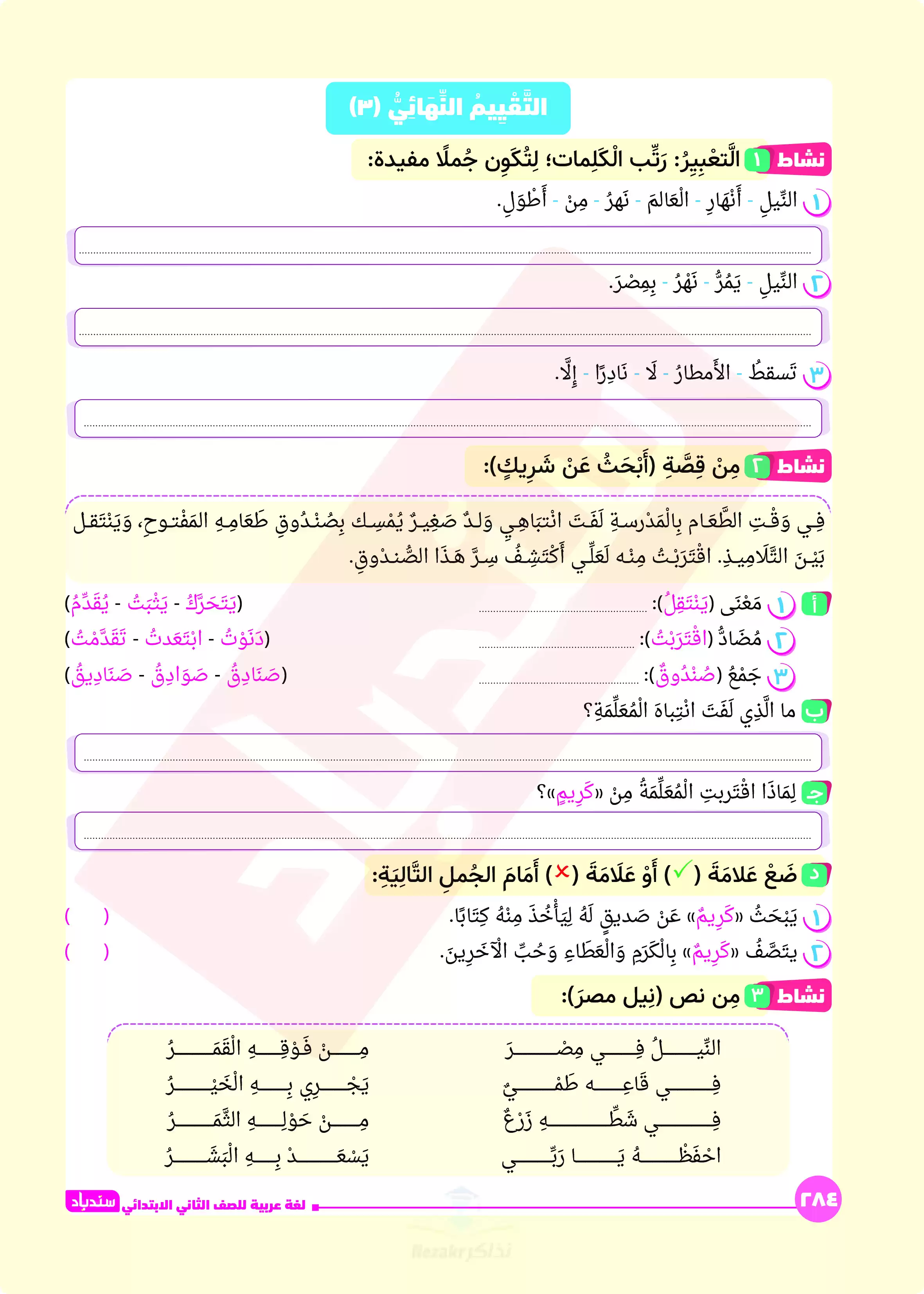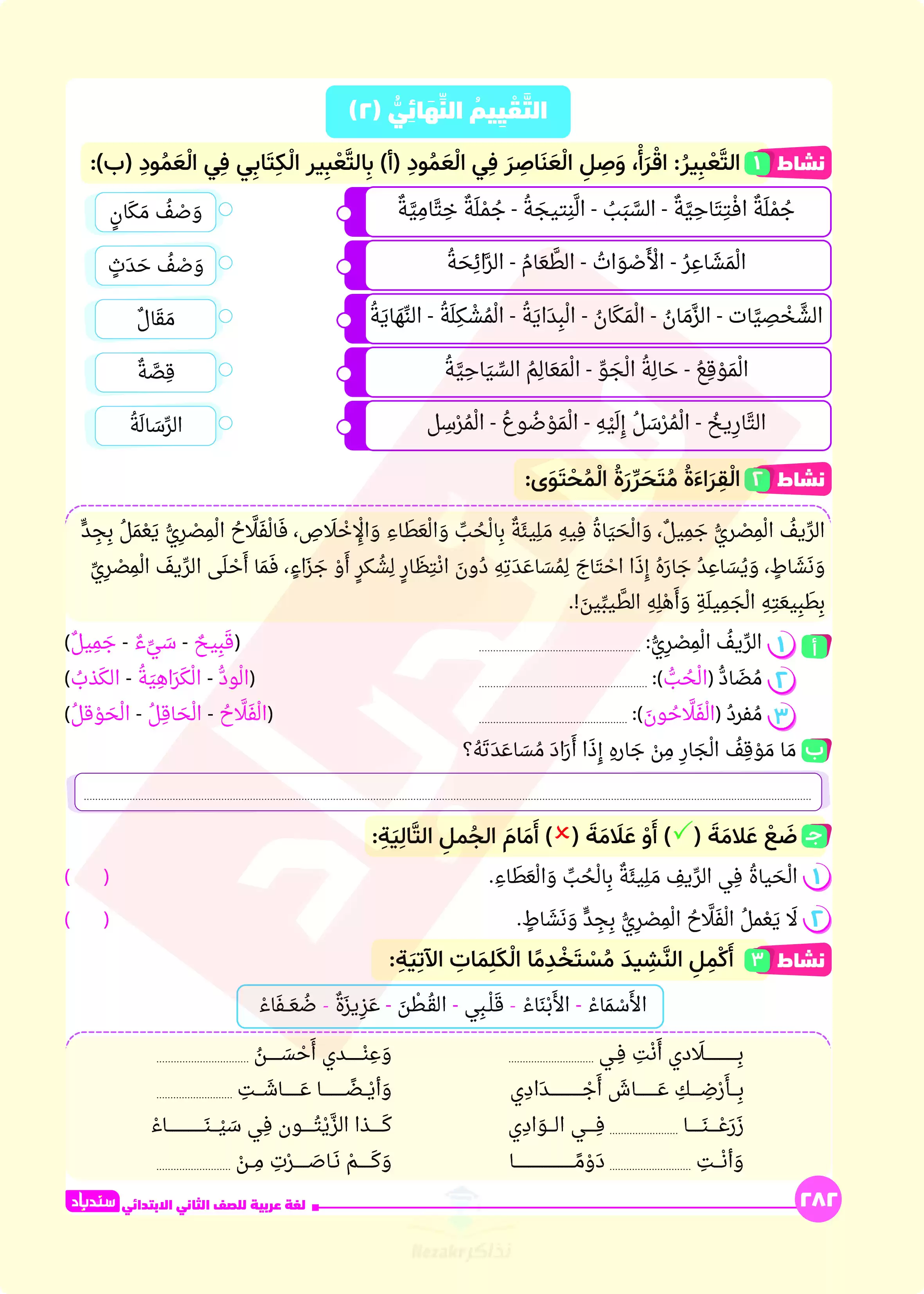 نقدم لكم تجربة مراجعة نهائية مميزةا مع مراجعة السندباد النهائية في اللغة العربية للصف الثاني الابتدائي للترم الثاني، وقد صُممت هذه المراجعة بواسطة فريق من الخبراء لتكون الرفيق الأمثل لولي الأمر والتلميذ في رحلة الاستعداد لامتحان نهاية العام.