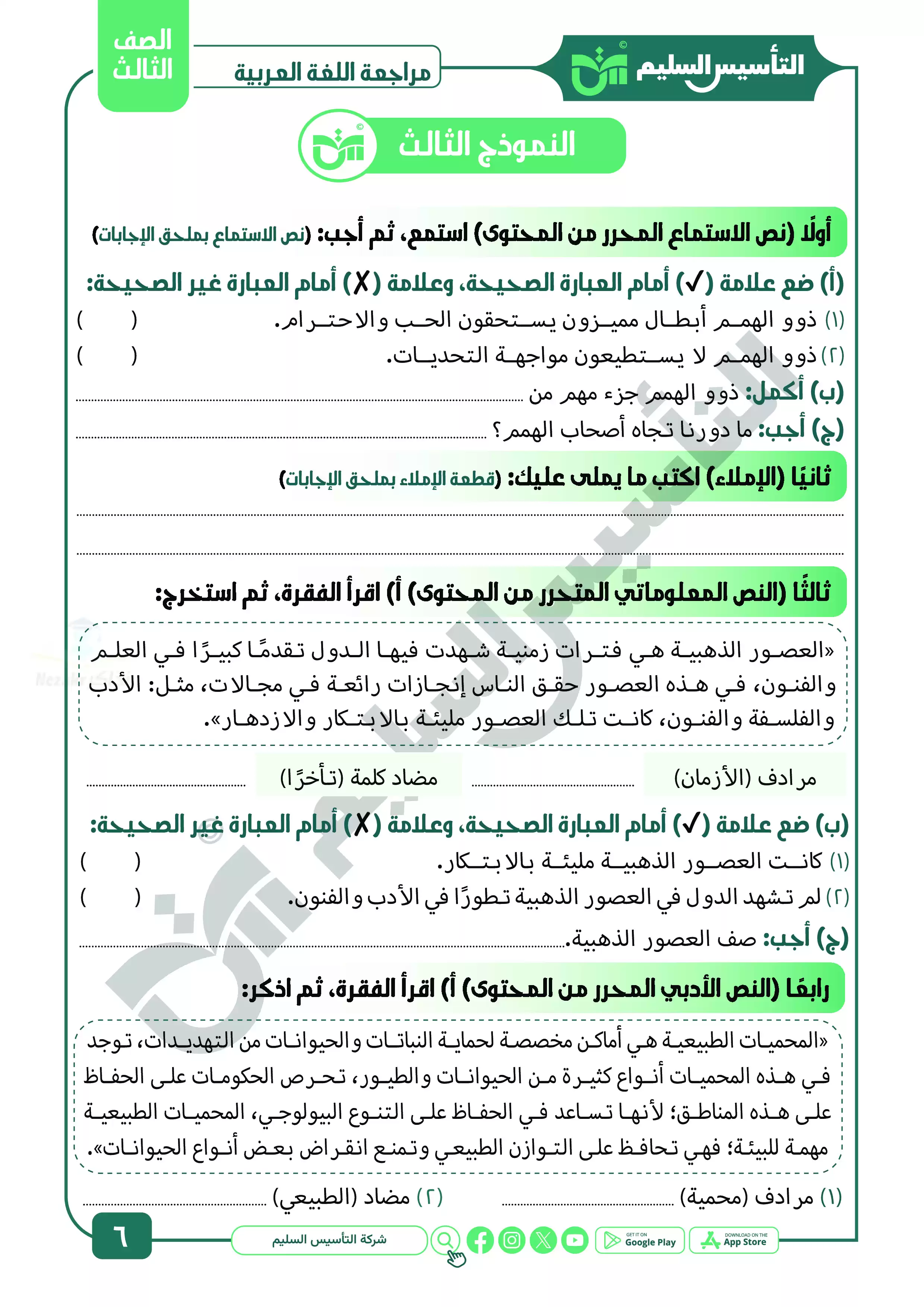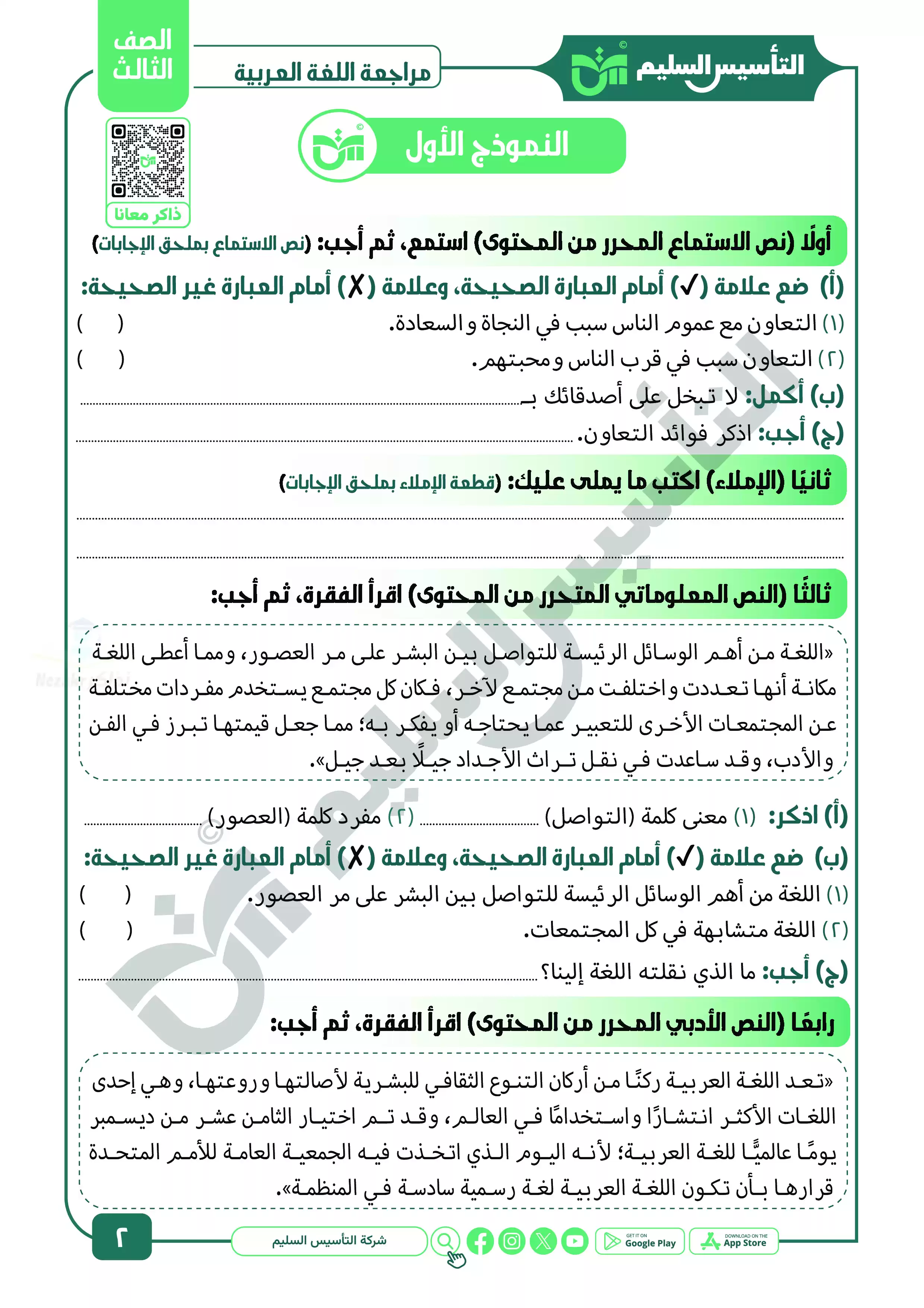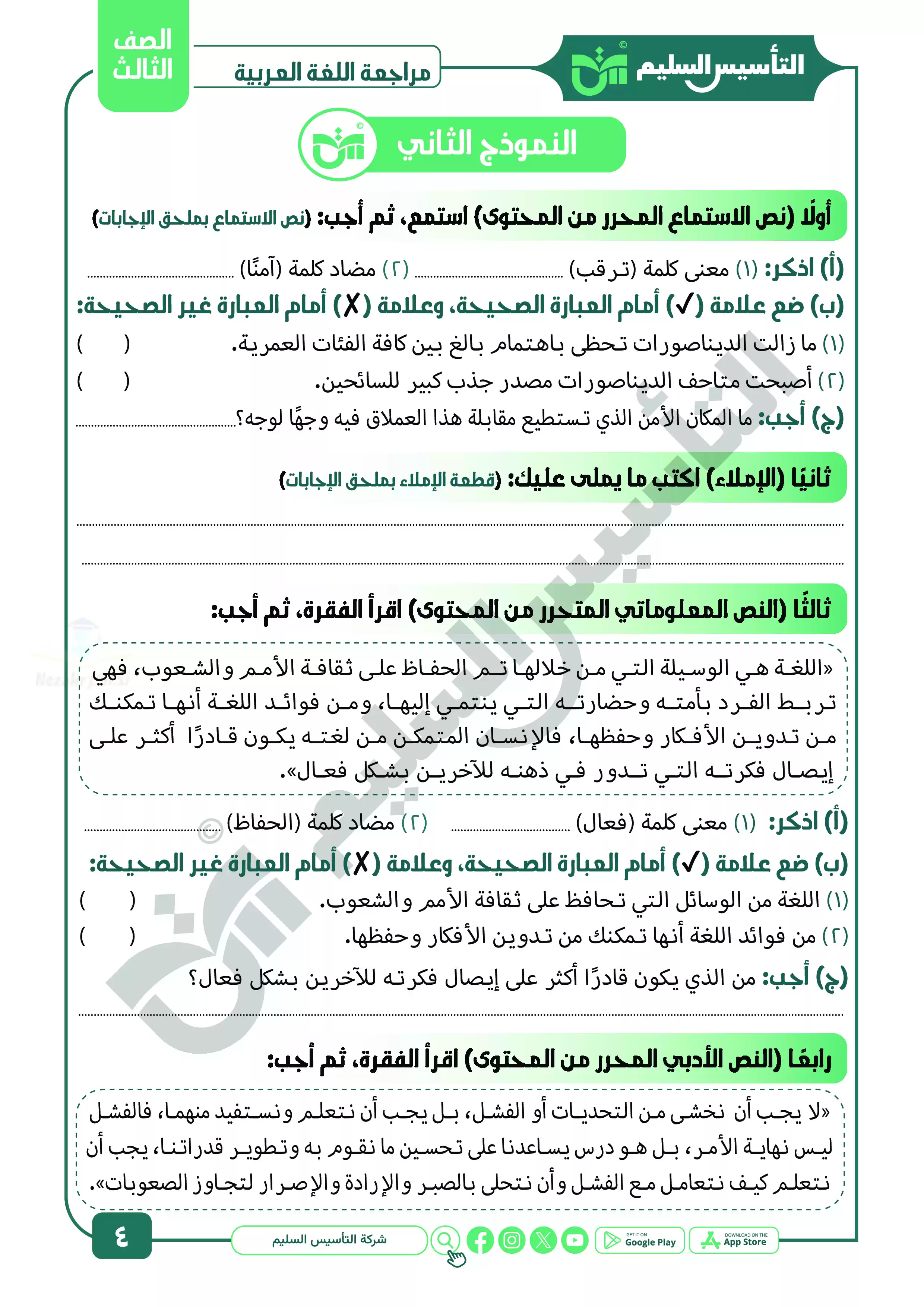 يقدم كتاب التأسيس السليم مجموعة متميزة ومختلفة من نماذج الاختبارات الشاملة في مادة اللغة العربية للصف الثالث الابتدائي الترم الثاني، ولهذه النماذج أهمية كبيرة في مراجعة المنهج المقرر في الترم الثاني بشكل منظم ومبسط.