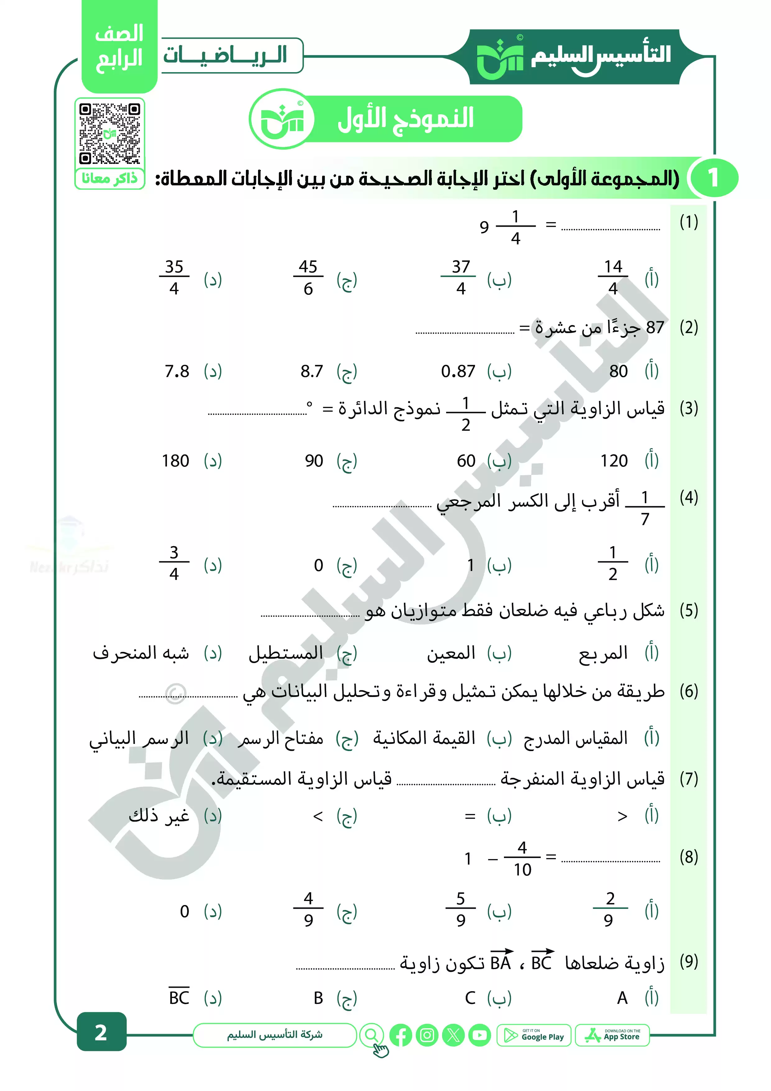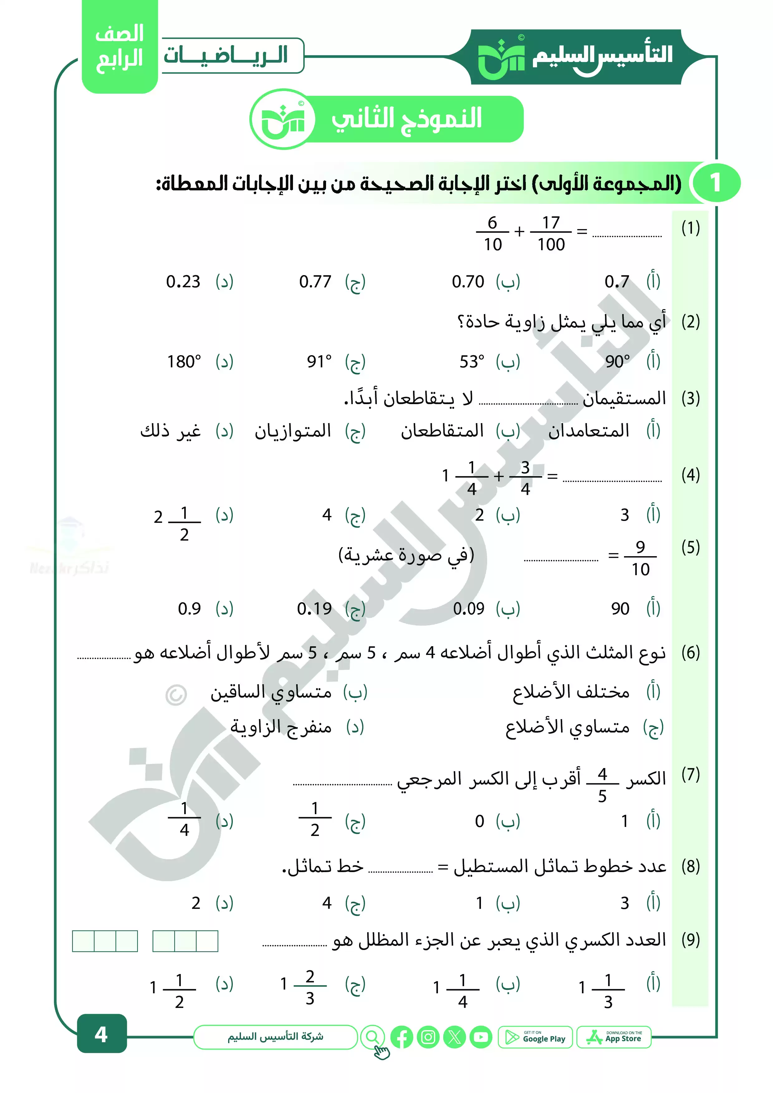 يُعد كتاب التأسيس السليم في الرياضيات للصف الرابع الابتدائي (الترم الثاني) من أفضل المصادر القوية في المادة العلمية، والتي توفر نماذج اختبارات متنوعة تغطي جميع دروس منهج الرياضيات للصف الرابع الابتدائي بشكل مبسط ومنظم.