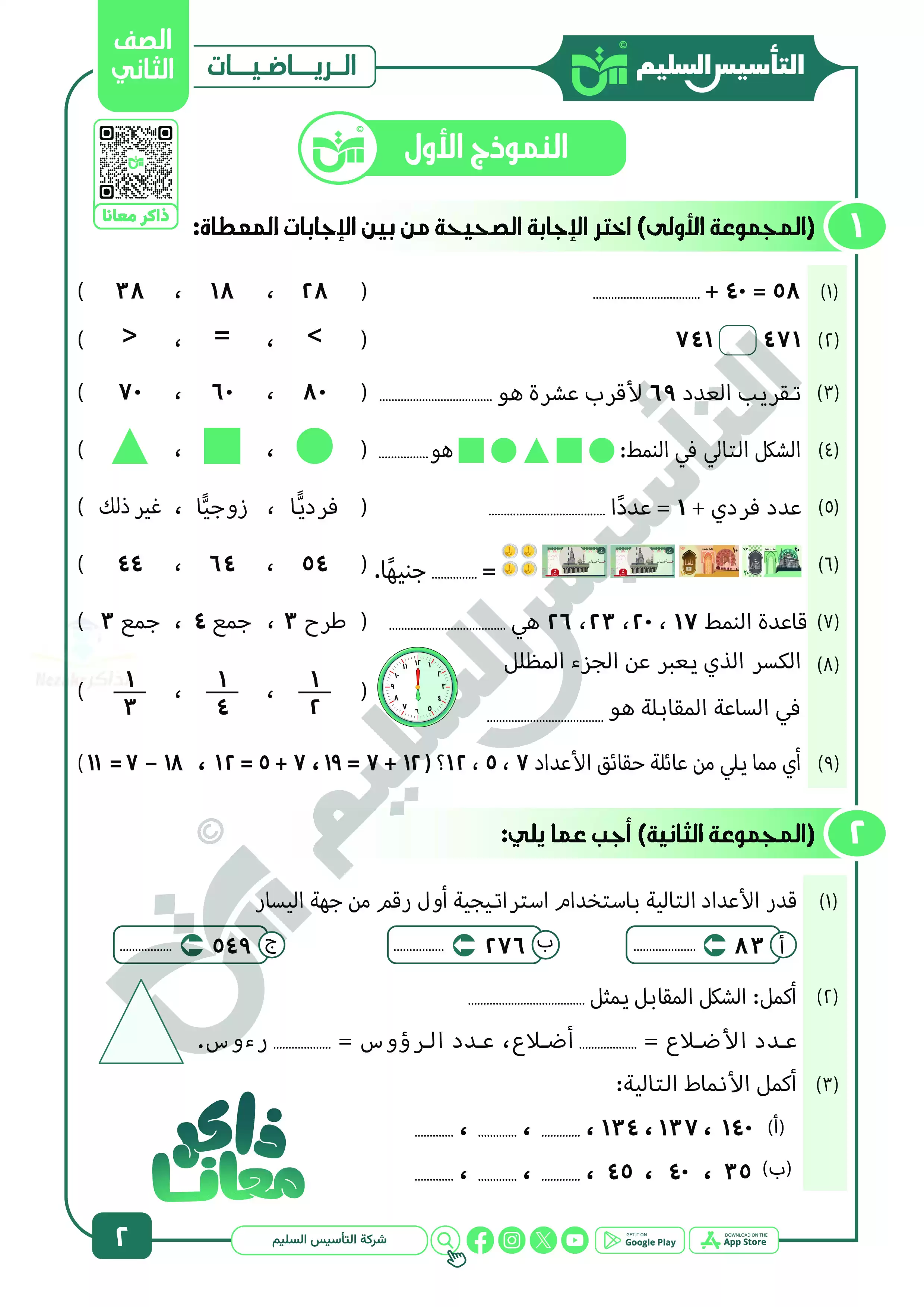 • امتحانات التأسيس السليم في الرياضيات للصف الثاني الابتدائي بالاجابات