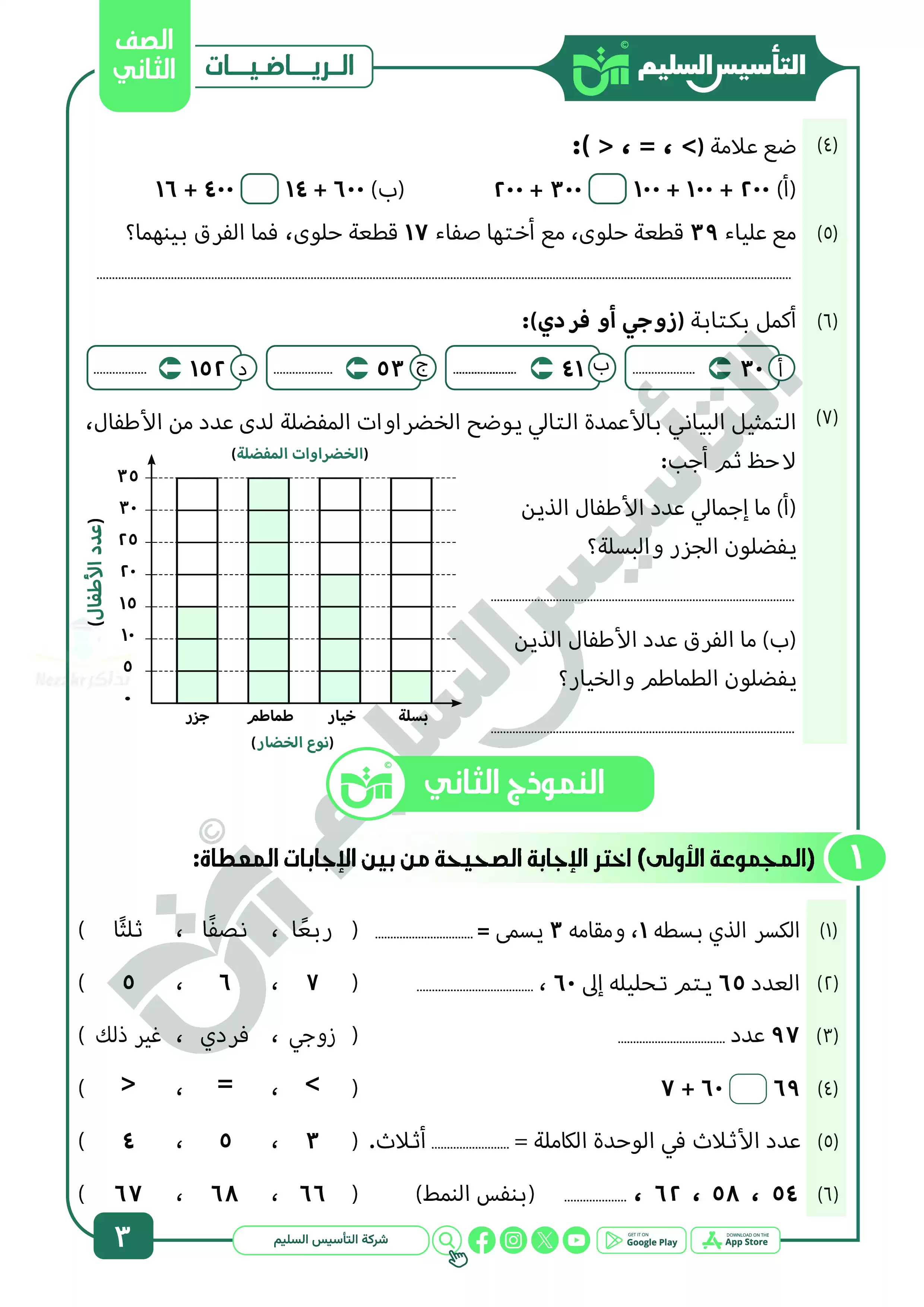 صفحة 3 من 20 صفحة من ملف: نماذج المراجعة النهائية في الحساب للصف الثاني الابتدائي ترم ثاني بالاجابات - Nezakr