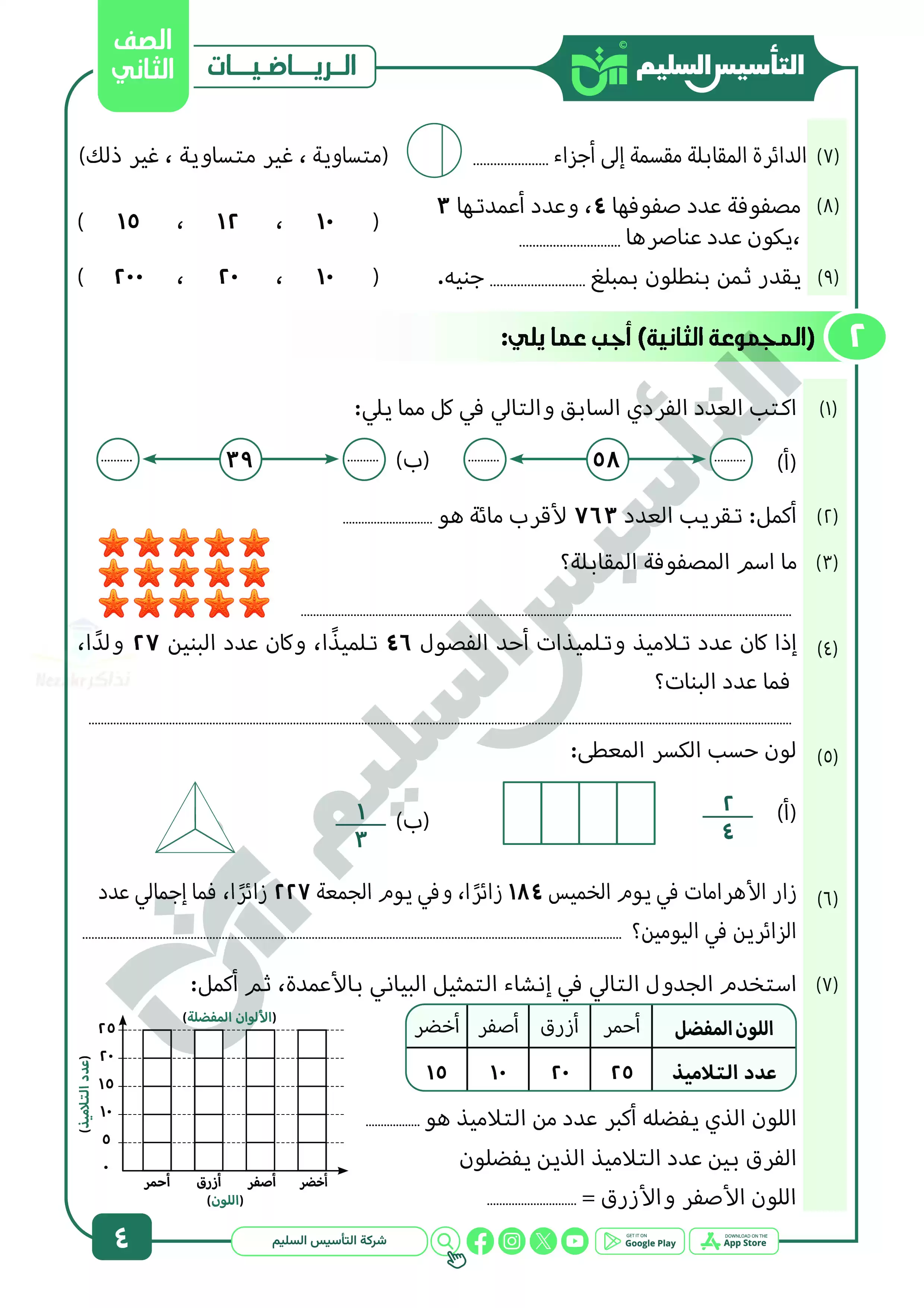 اختبارات التأسيس السليم في الحساب للصف الثاني الابتدائي الترم الثاني 2025 PDF بالاجابات