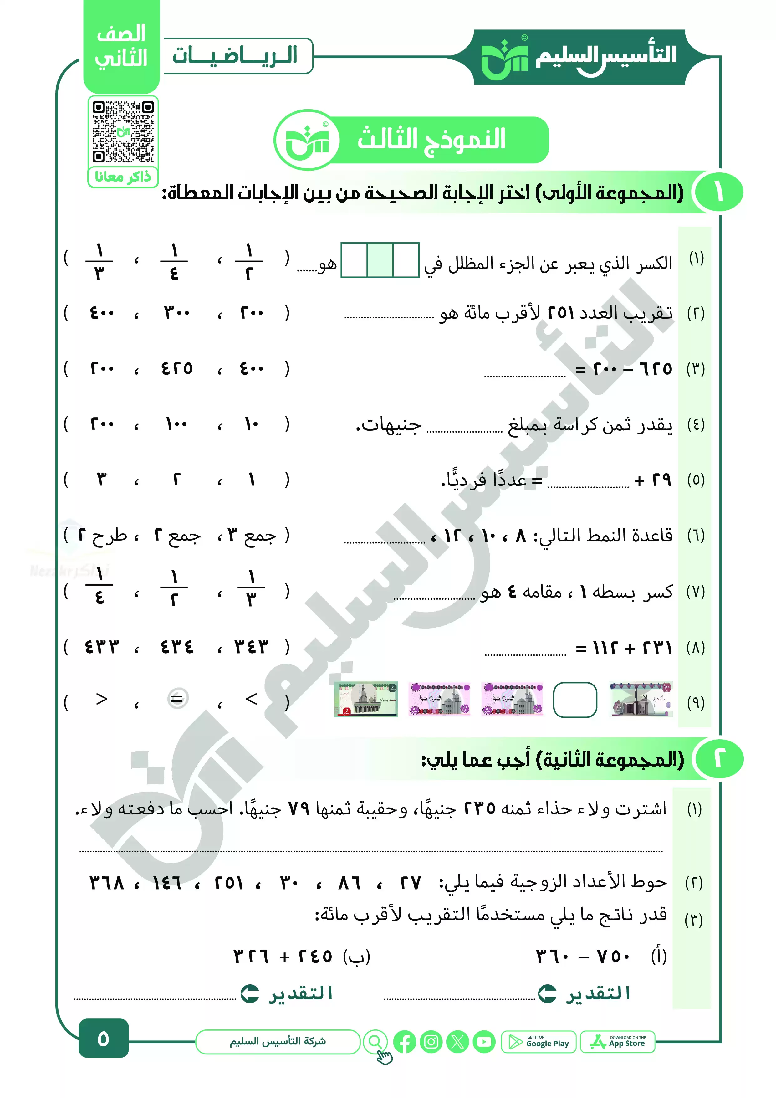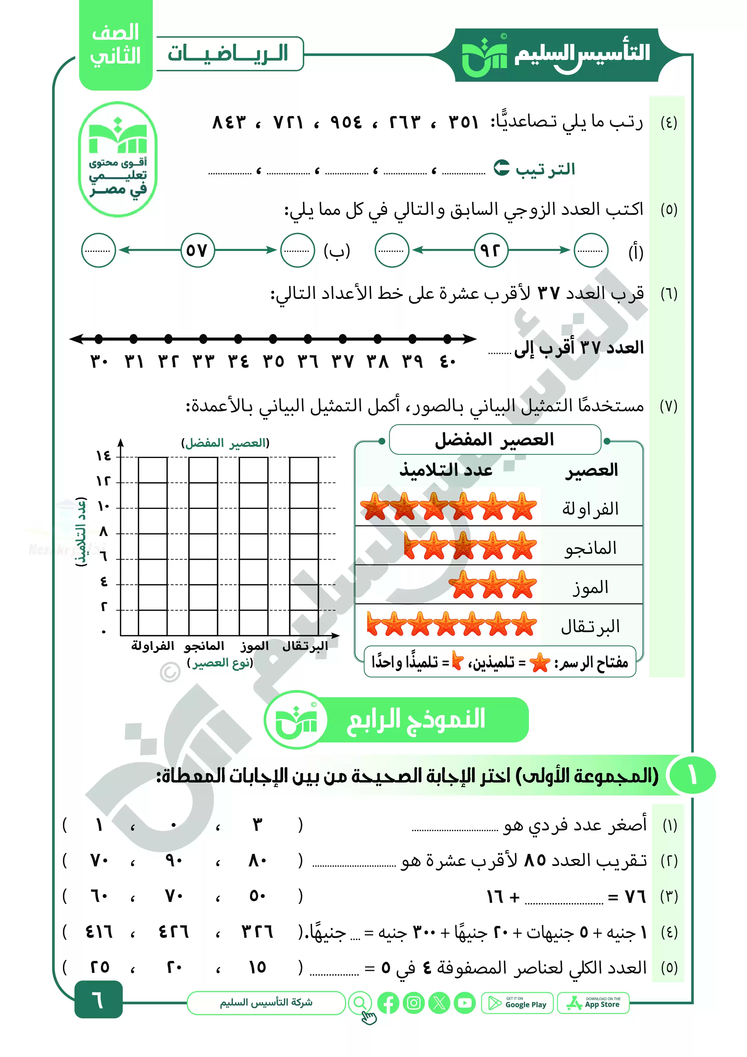 • نماذج اختبارات نهائية شاملة من كتاب التأسيس السليم على منهج الحساب للصف الثاني الابتدائي الترم الثاني