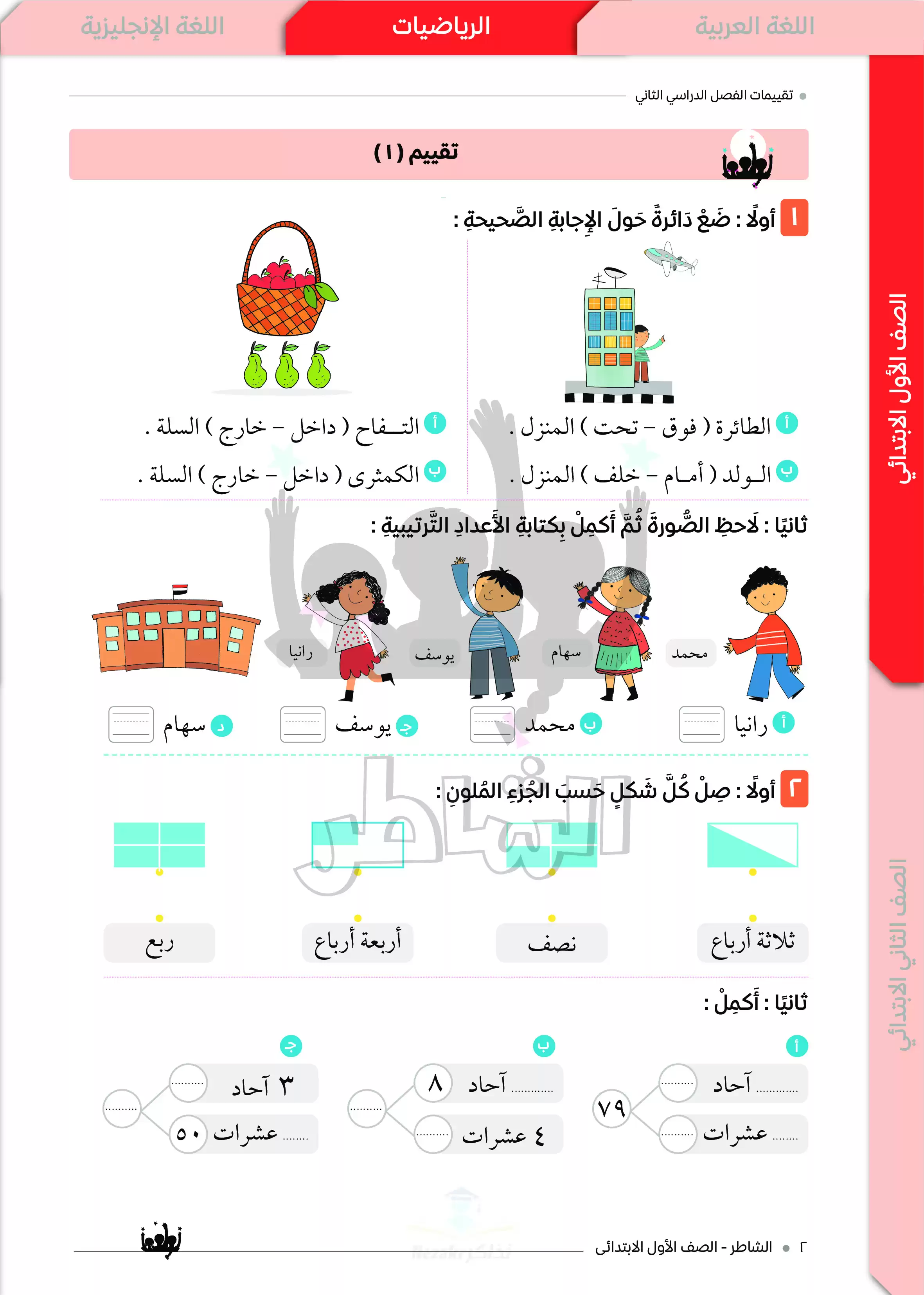 تأتي تقييمات الرياضيات في كتاب الشاطر للصف الأول الابتدائي الترم الثاني، بطريقة ذكية تمزج بين البساطة والتفكير، والأسلوب المميز.