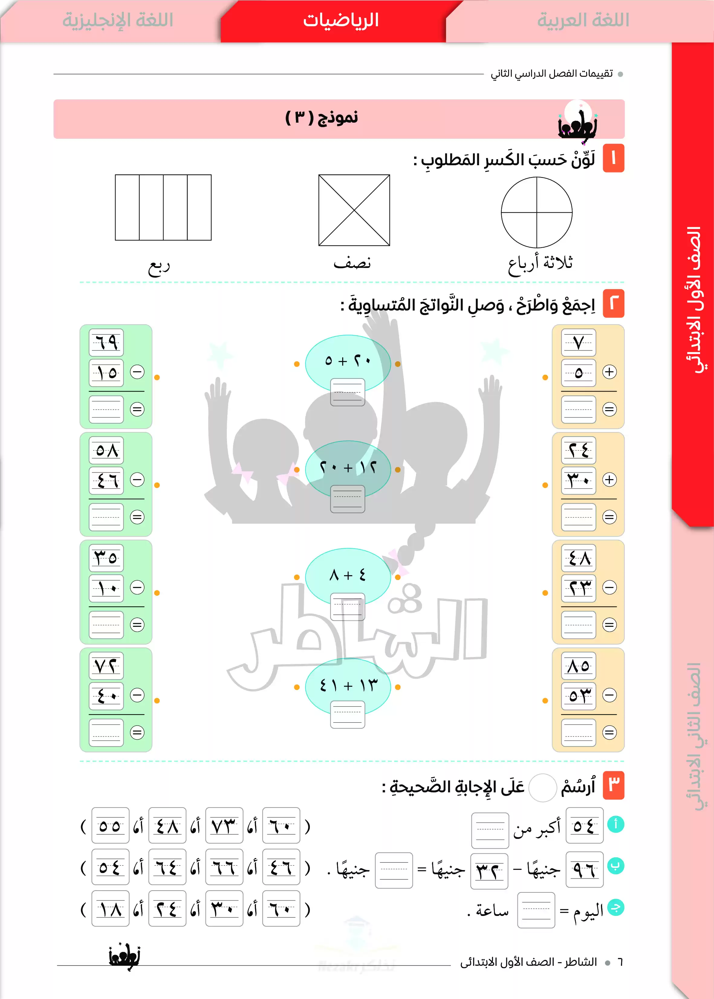 • تقييمات الرياضيات للصف الاول الابتدائي الترم الثاني من كتاب الشاطر