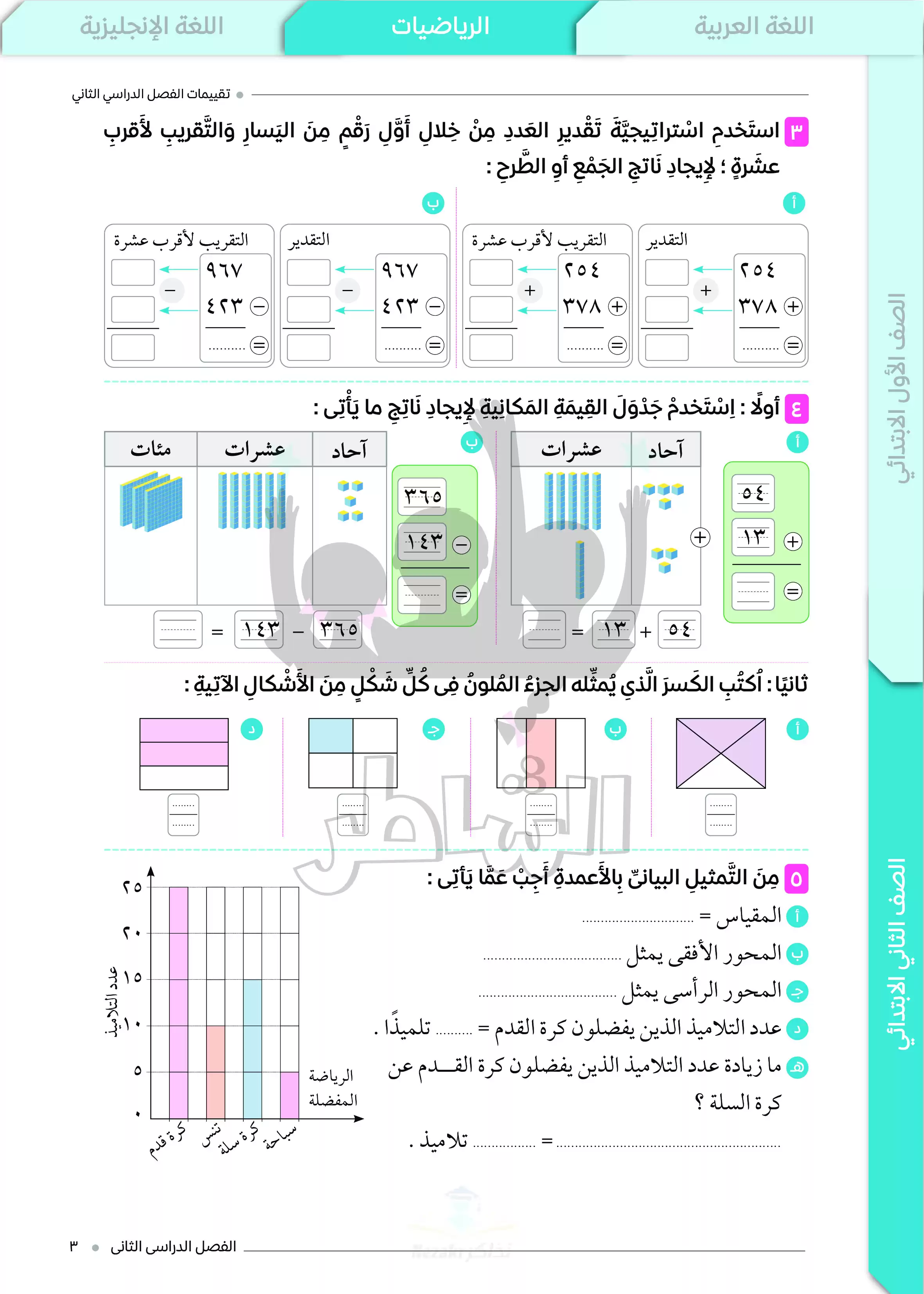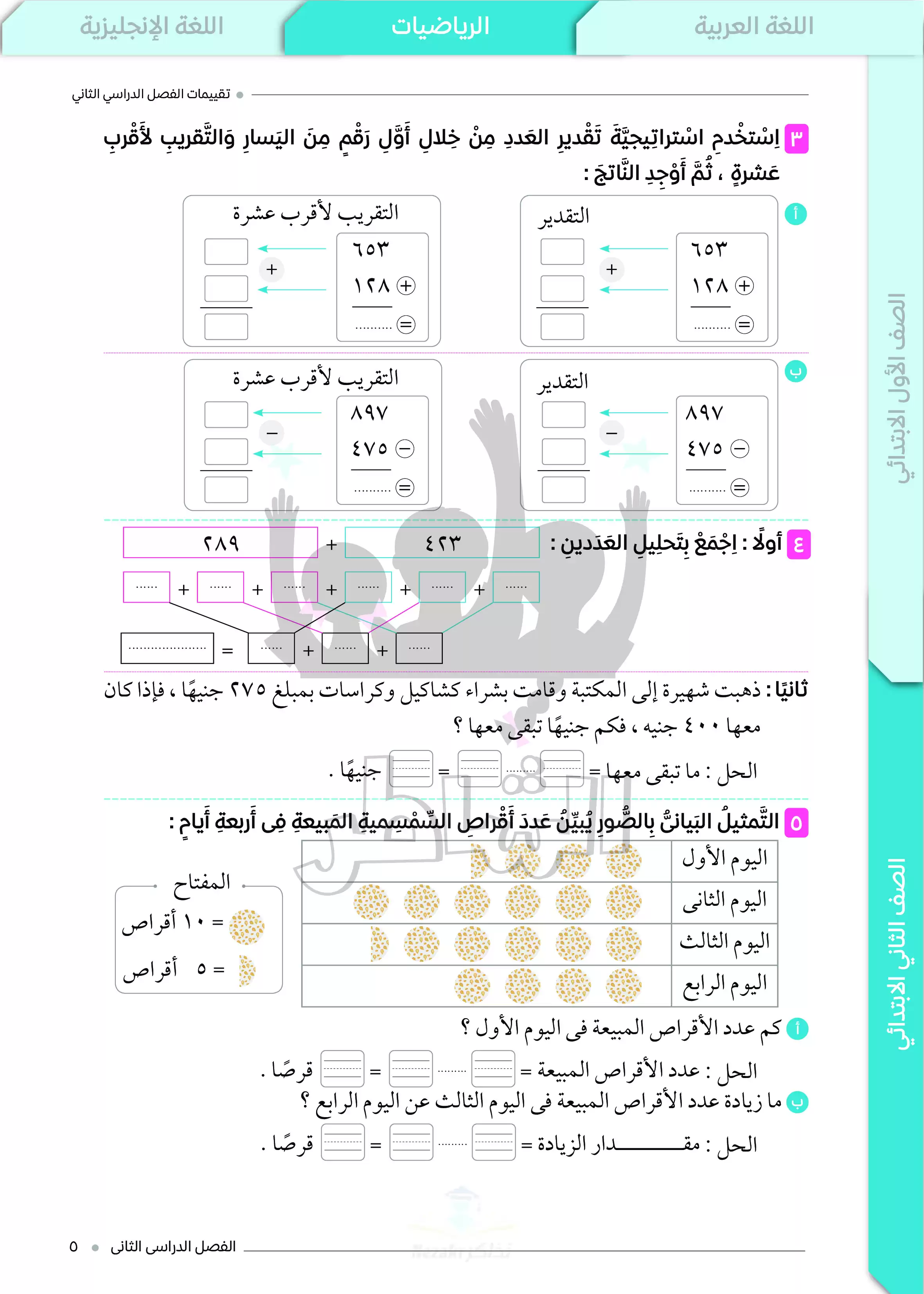 تقييمات الرياضيات في كتاب الشاطر للصف الثاني الابتدائي الترم الثاني، تقدم مراجعة مبتكرة تساعد الطفل على فهم العمليات الحسابية مثل الجمع والطرح بشكل عملي ومبسط.