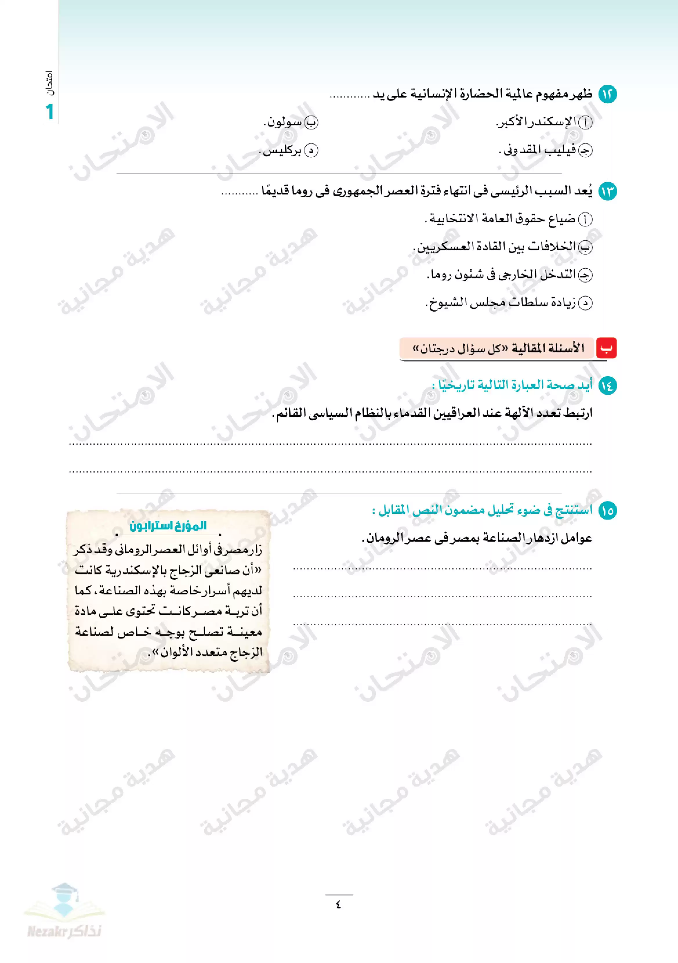 صفحة 4 من 33 صفحة من ملف: اختبارات كتاب الامتحان الاسترشادية في التاريخ للصف الأول الثانوي الترم الثاني - Nezakr