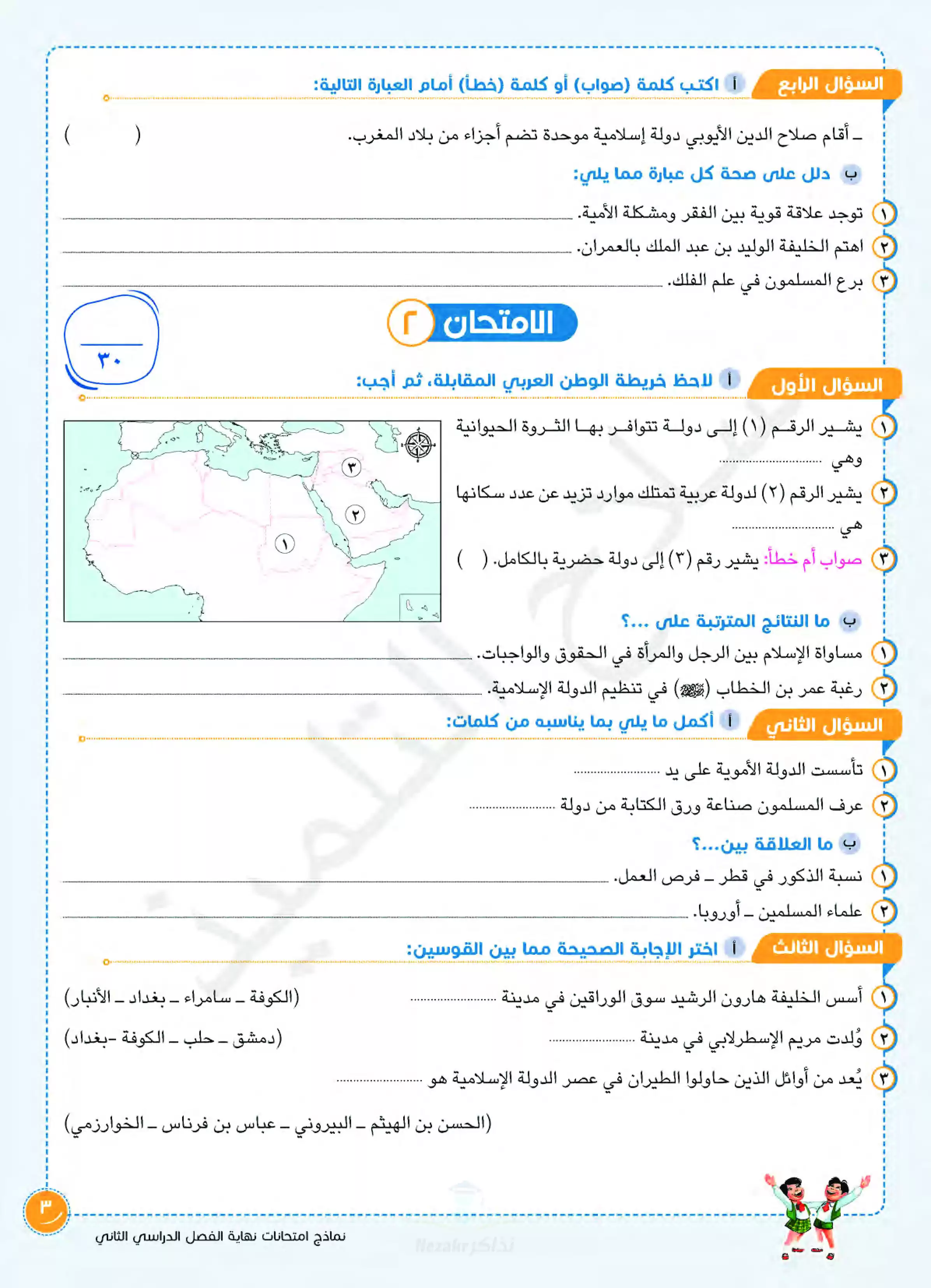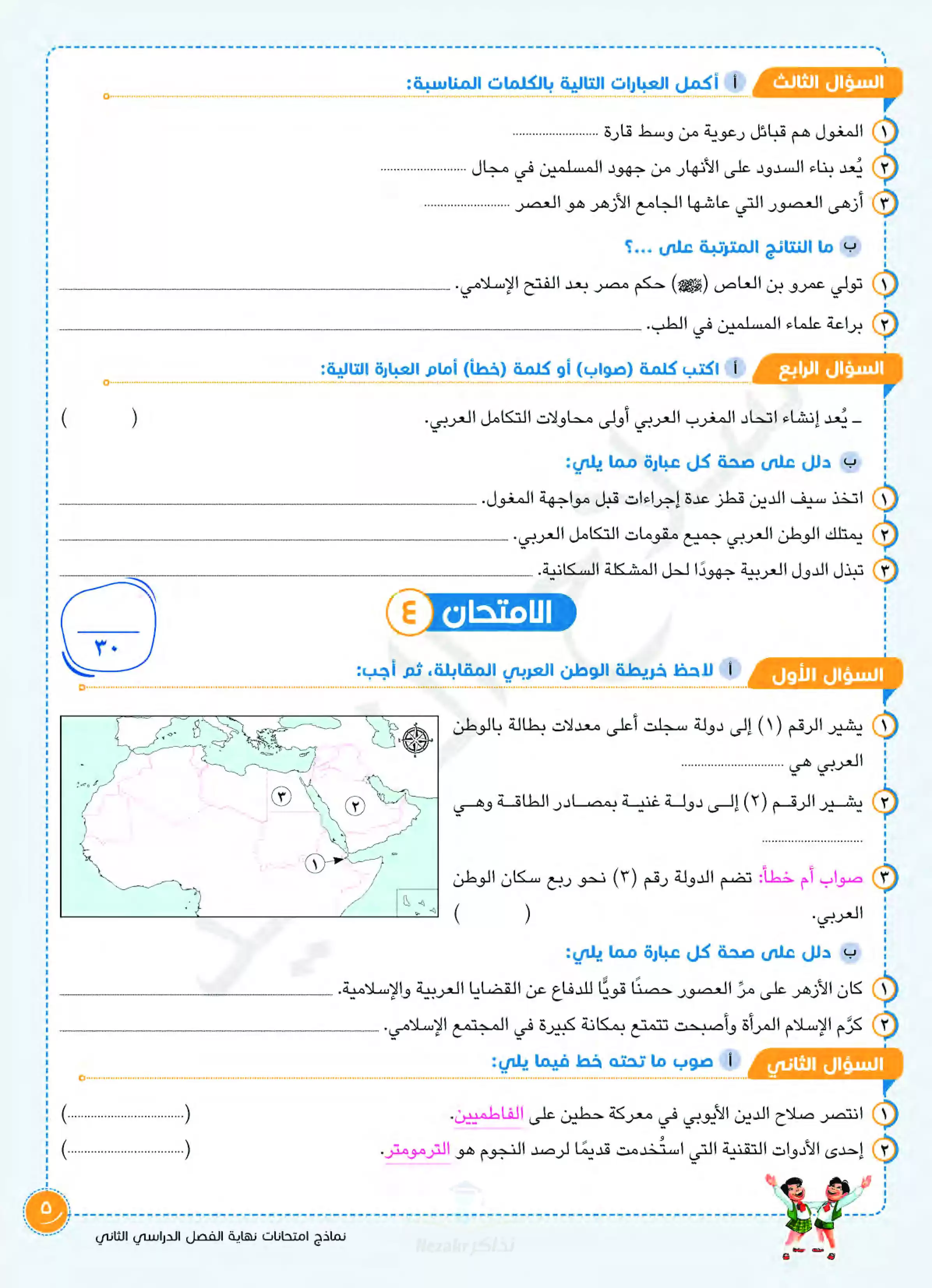 تحتوي المراجعة على 5 نماذج اختبارات استرشادية من سلاح التلميذ مصممة بدقة لتغطية جميع موضوعات المنهج بأسلوب مبسط ومنظم. تتنوع الأسئلة بين الحقائق الجغرافية والتاريخية والمفاهيم العامة، مما يتيح للطالب فرصة فهم أعمق وتدريب فعلي على شكل الامتحان الرسمي.