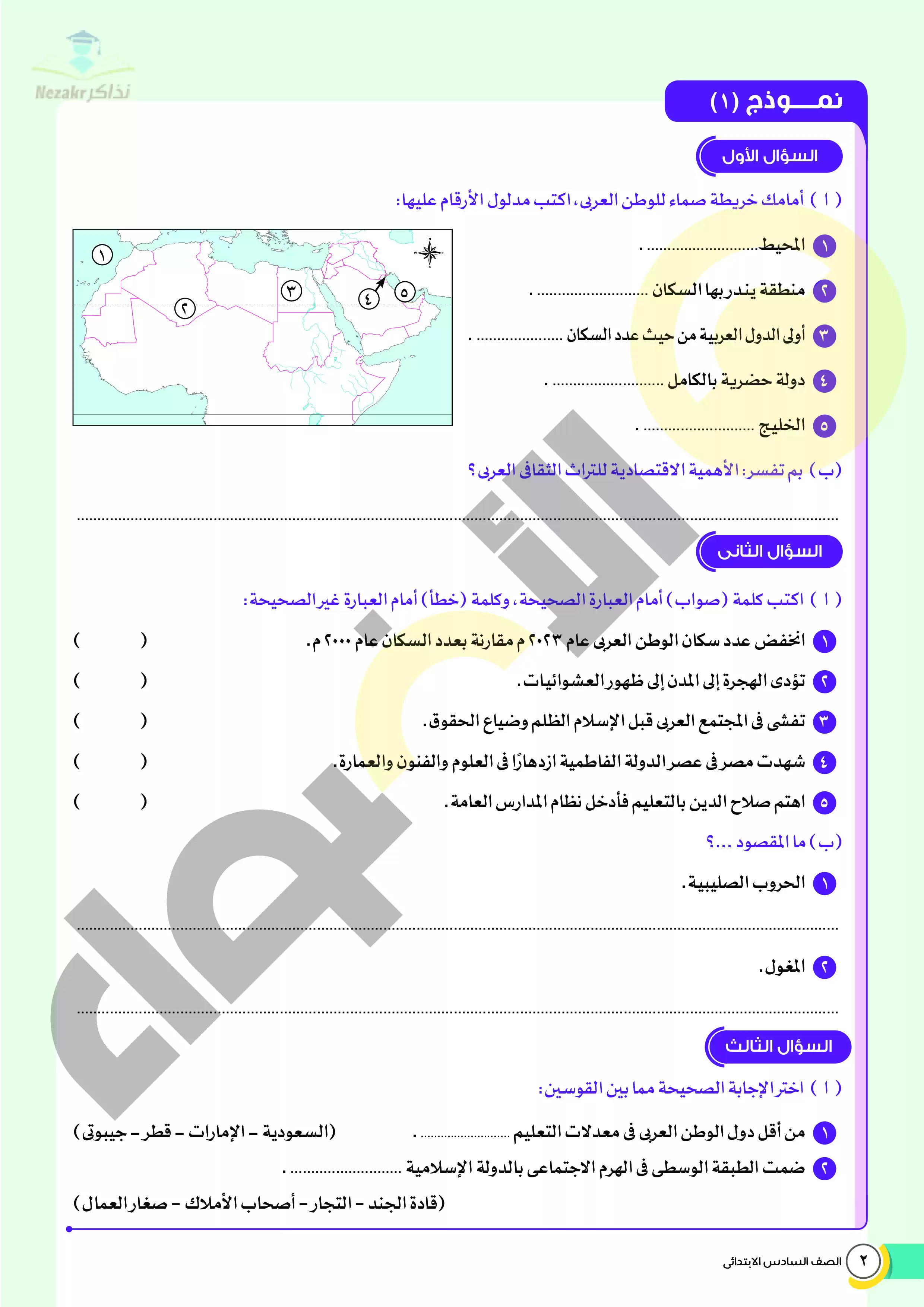 صفحة 2 من 20 صفحة من ملف: نماذج اختبارات ومراجعة الأضواء النهائية في مادة الدراسات الاجتماعية للصف السادس الابتدائي الترم الثاني - Nezakr