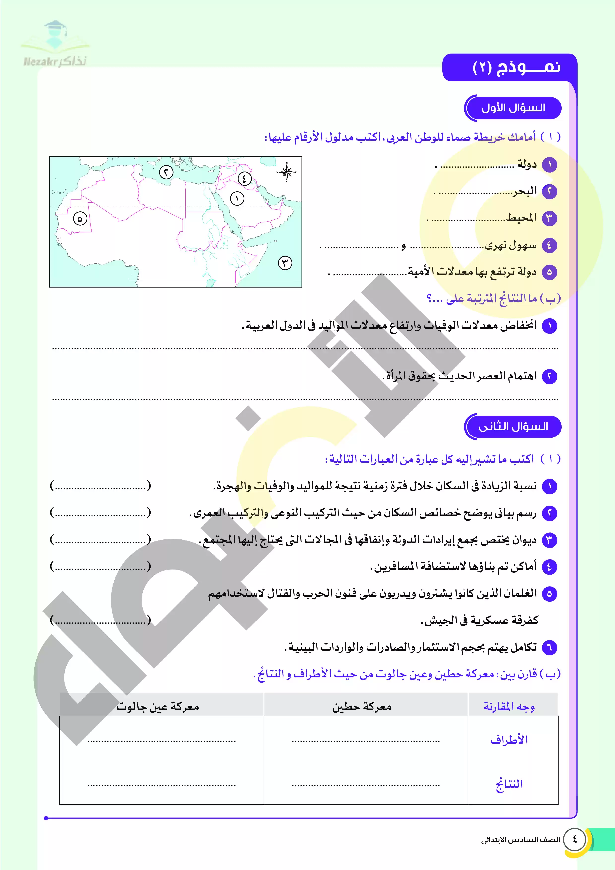 صفحة 4 من 20 صفحة من ملف: نماذج اختبارات ومراجعة الأضواء النهائية في مادة الدراسات الاجتماعية للصف السادس الابتدائي الترم الثاني - Nezakr