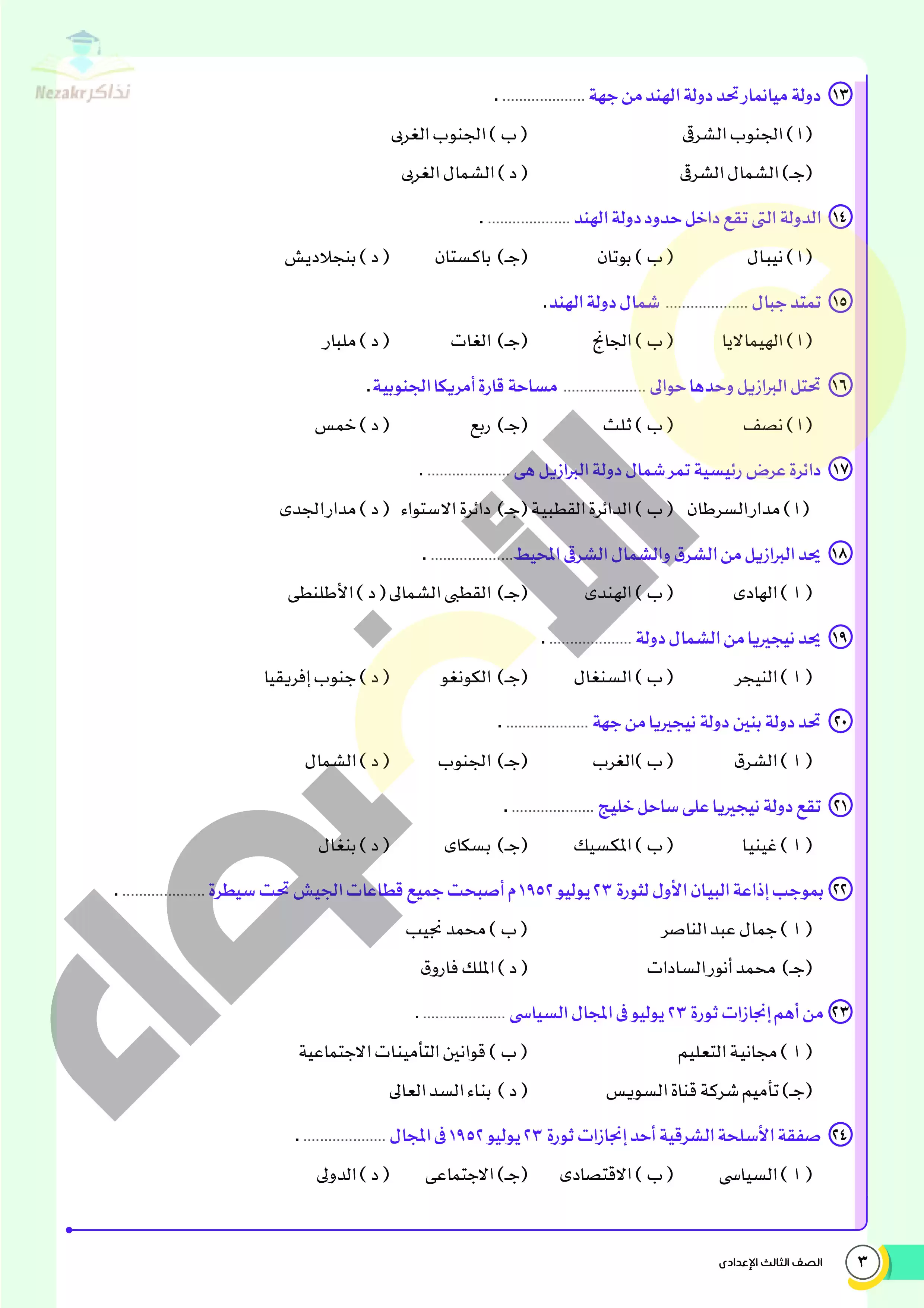 صفحة 3 من 46 صفحة من ملف: نماذج اختبارات ومراجعة الأضواء النهائية في مادة الدراسات الاجتماعية للصف الثالث الإعدادي الترم الثاني - Nezakr