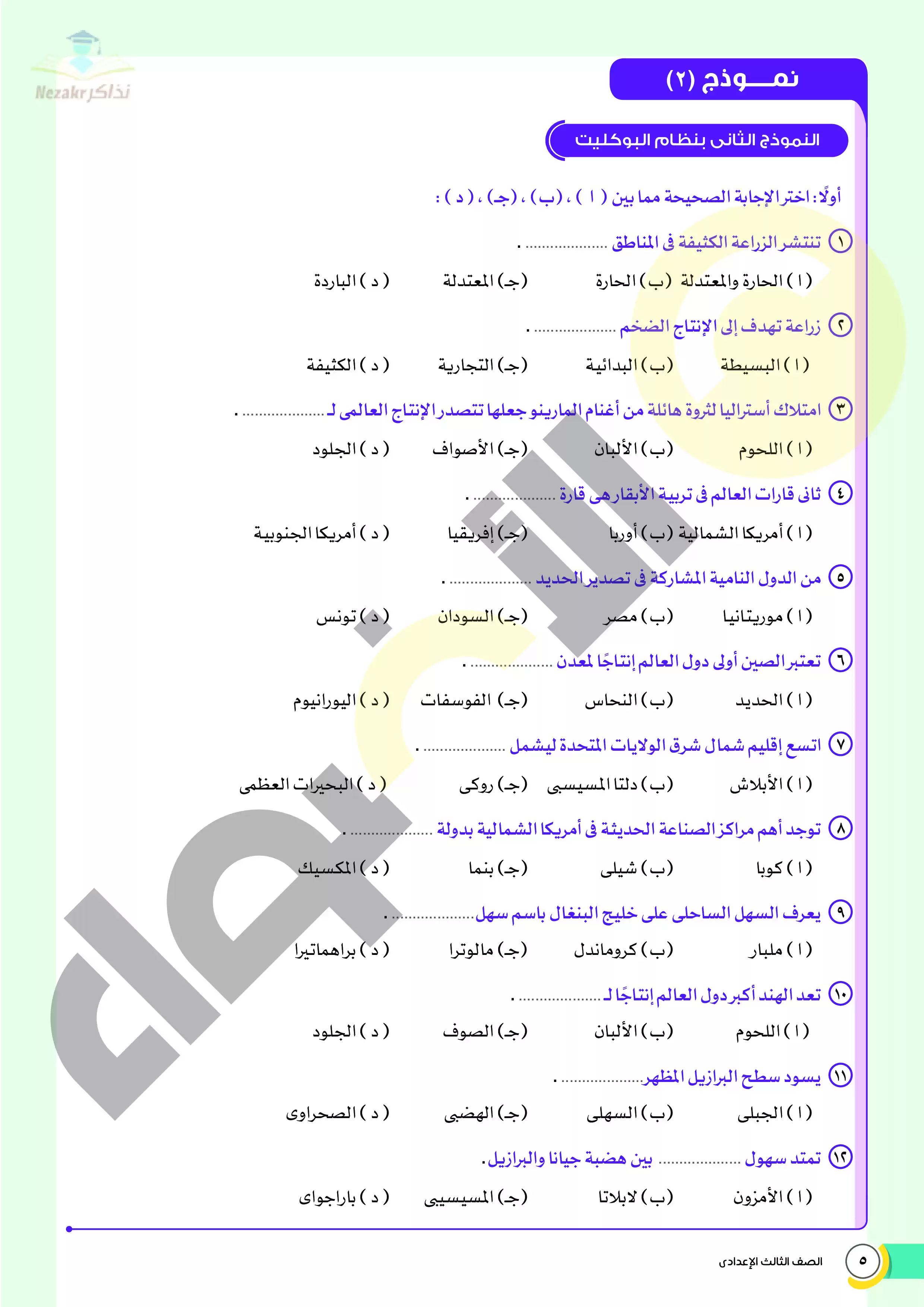 صفحة 5 من 46 صفحة من ملف: نماذج اختبارات ومراجعة الأضواء النهائية في مادة الدراسات الاجتماعية للصف الثالث الإعدادي الترم الثاني - Nezakr