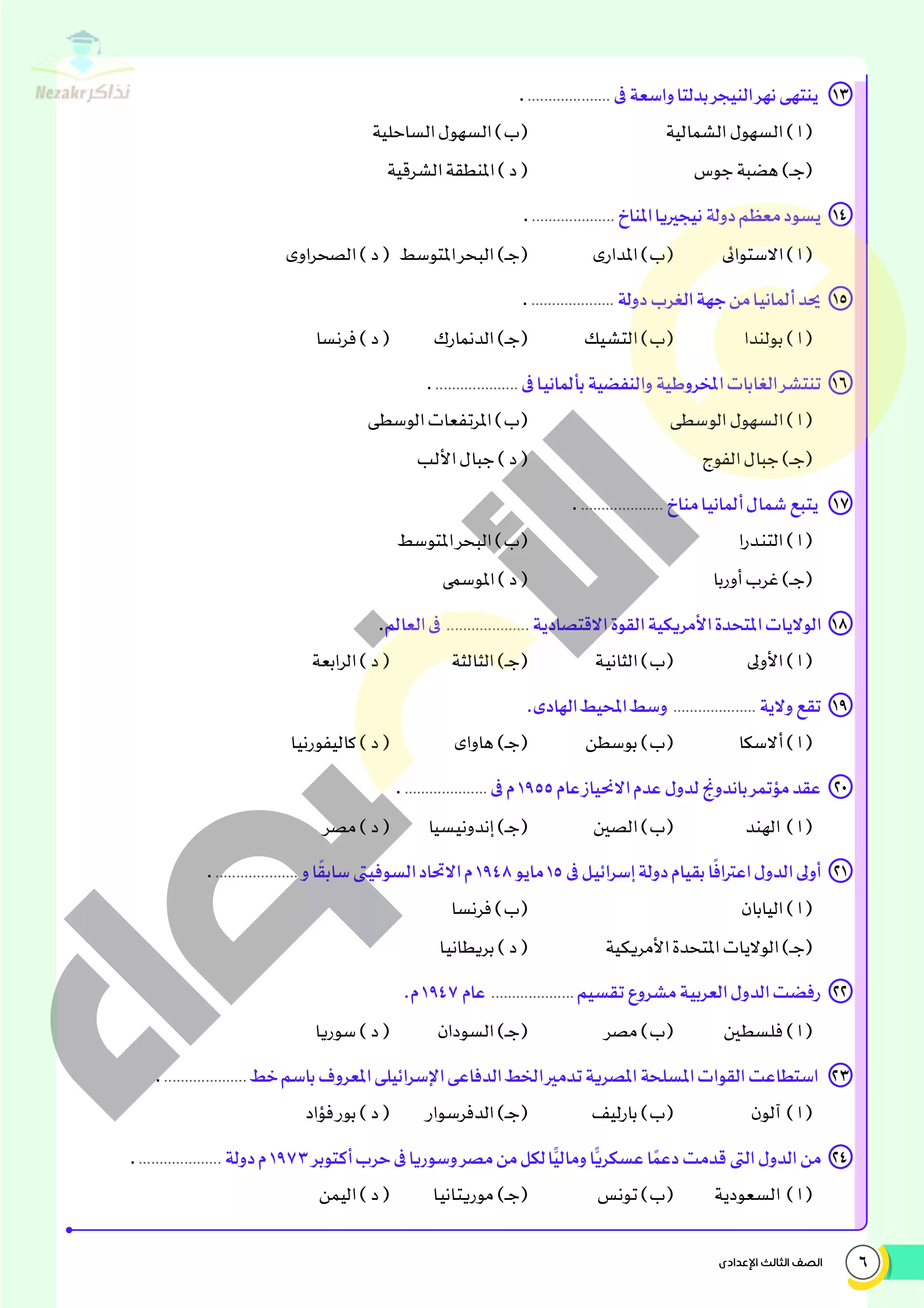 صفحة 6 من 46 صفحة من ملف: نماذج اختبارات ومراجعة الأضواء النهائية في مادة الدراسات الاجتماعية للصف الثالث الإعدادي الترم الثاني - Nezakr