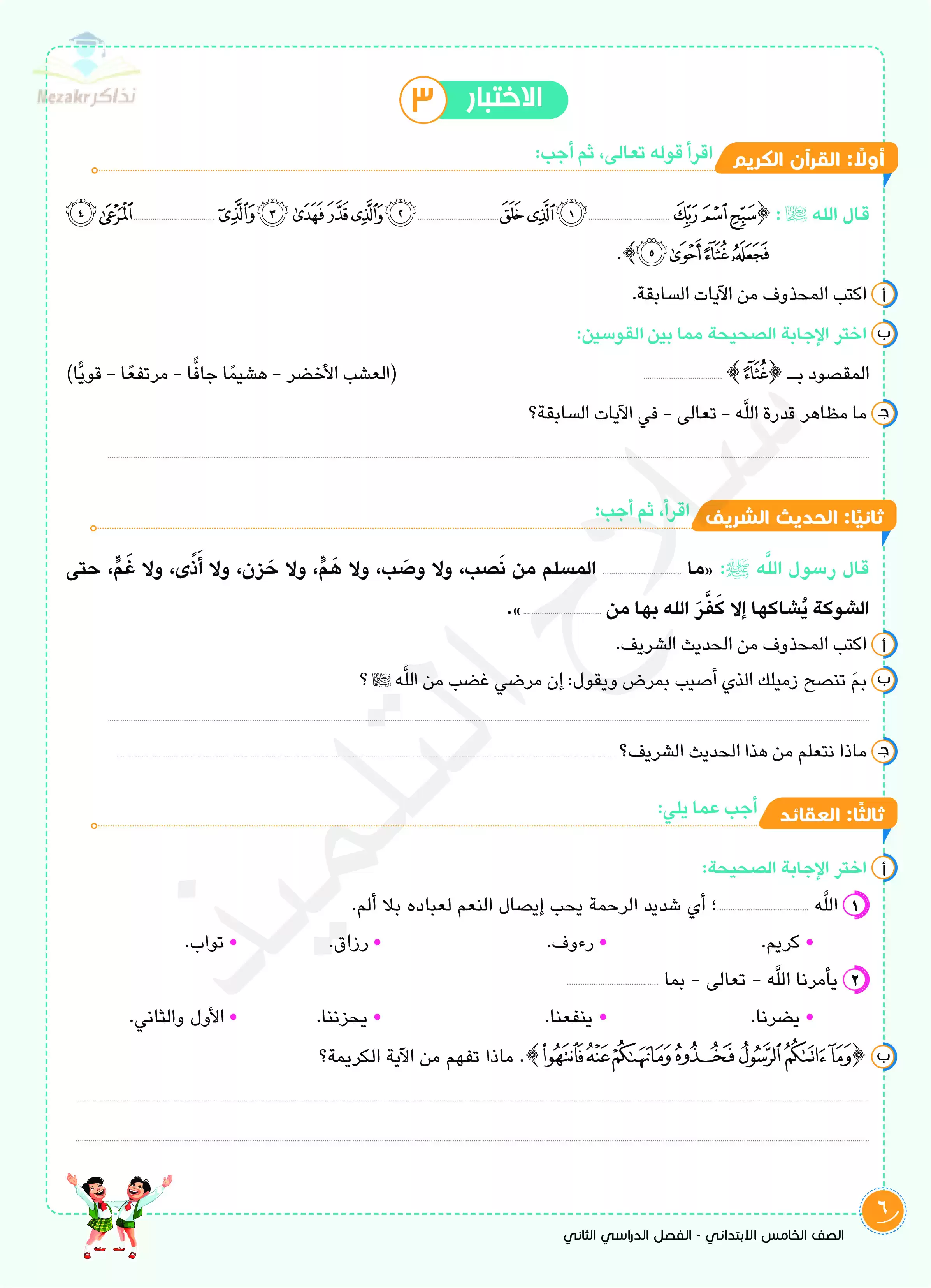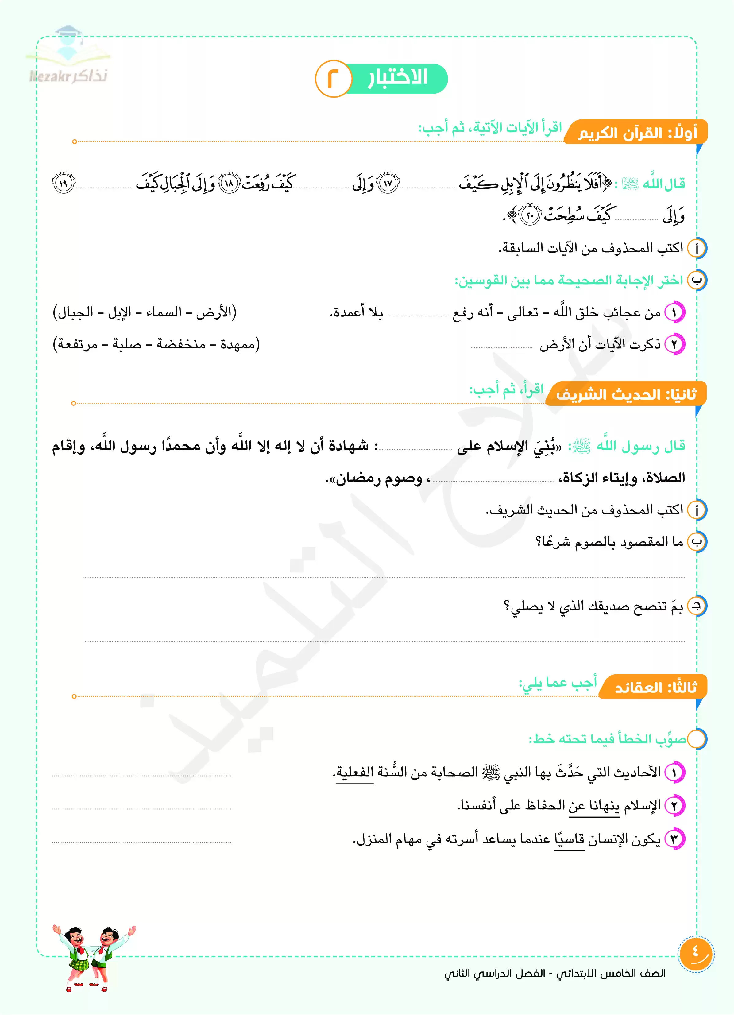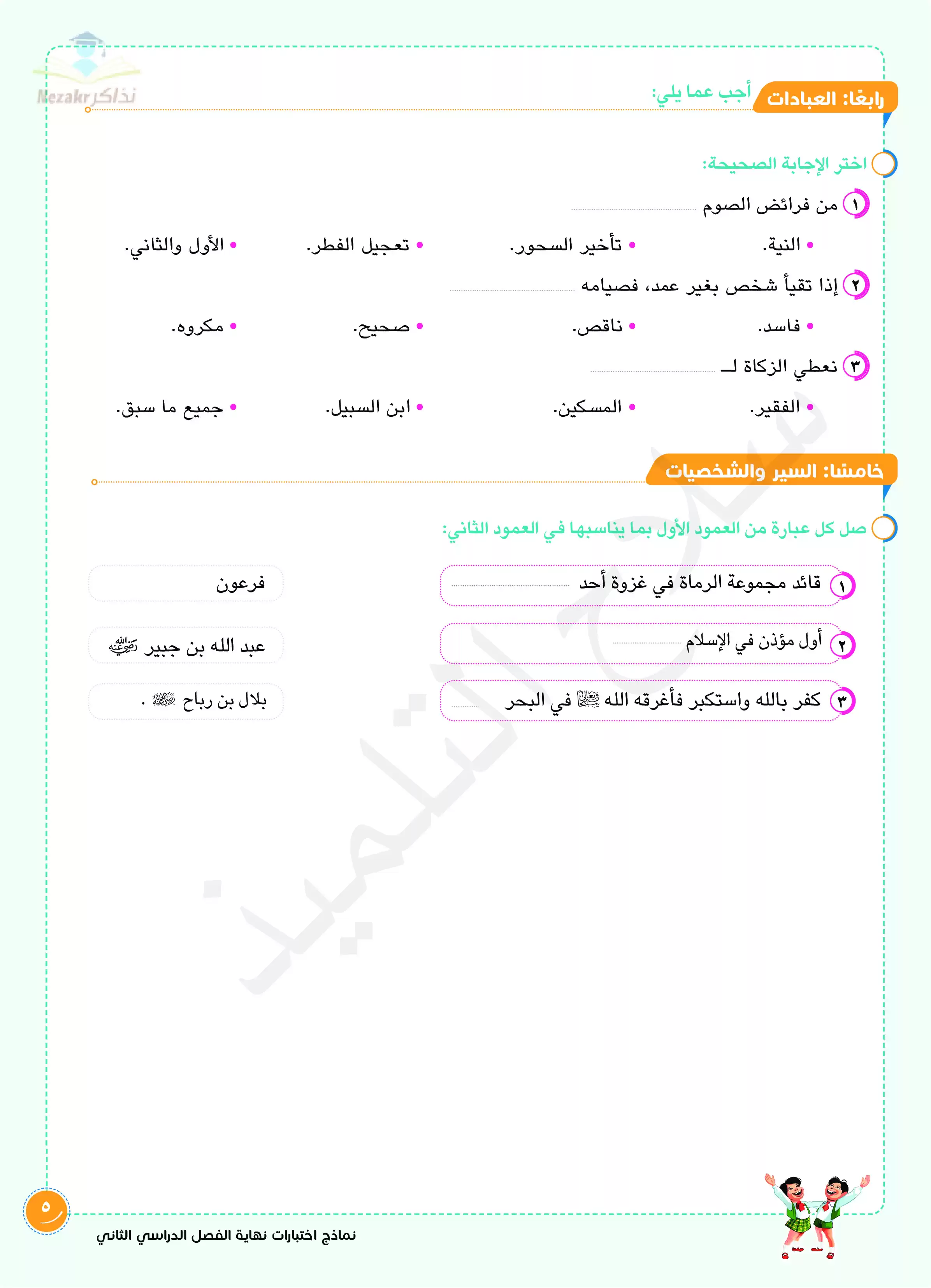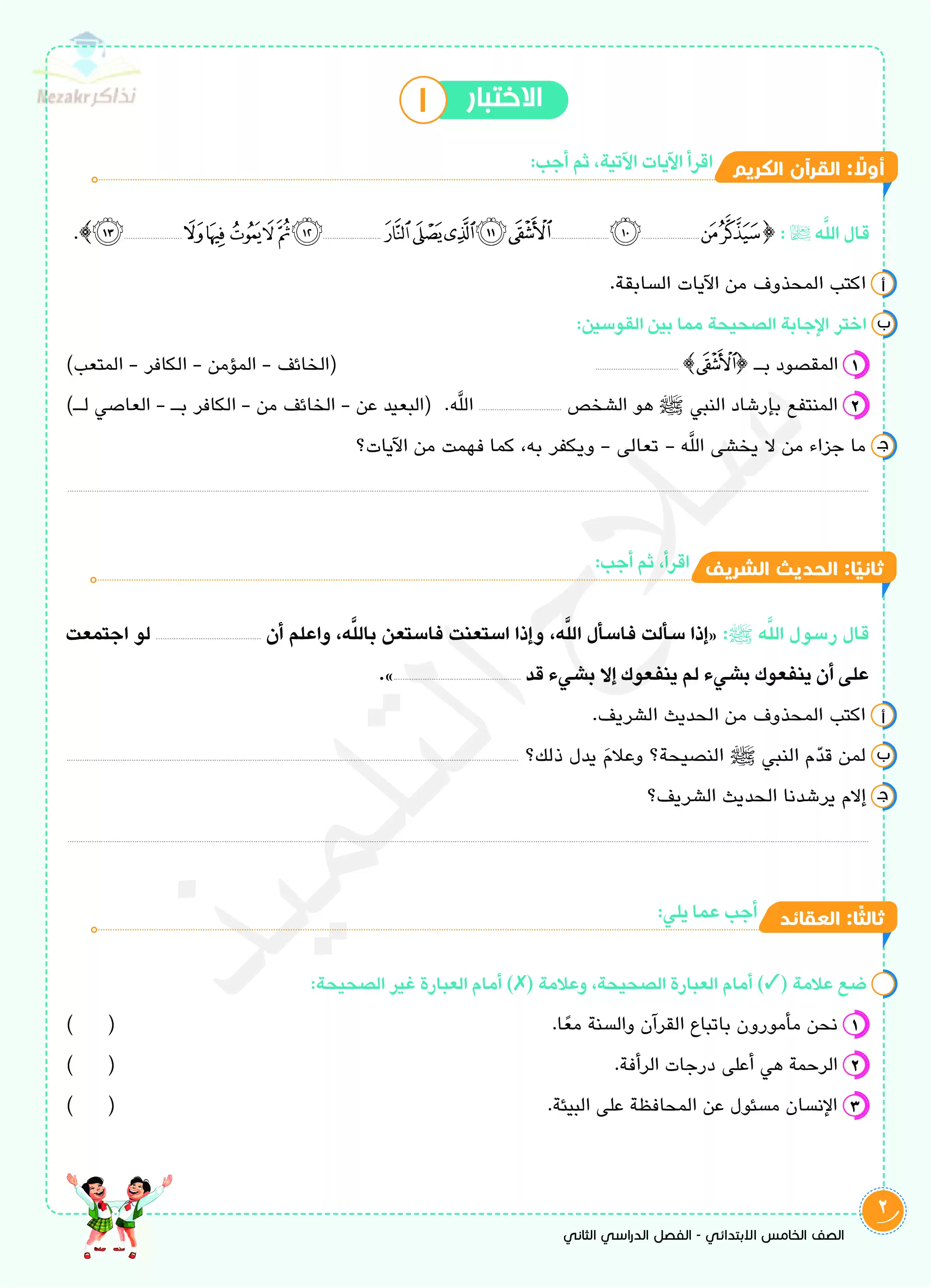 | بيانات الملف: (اختبارات سلاح التلميذ في مادة التربية الدينية الإسلامية الفصل الدراسي الثاني الصف الخامس الابتدائي بالإجابات النموذجية - Nezakr) | |