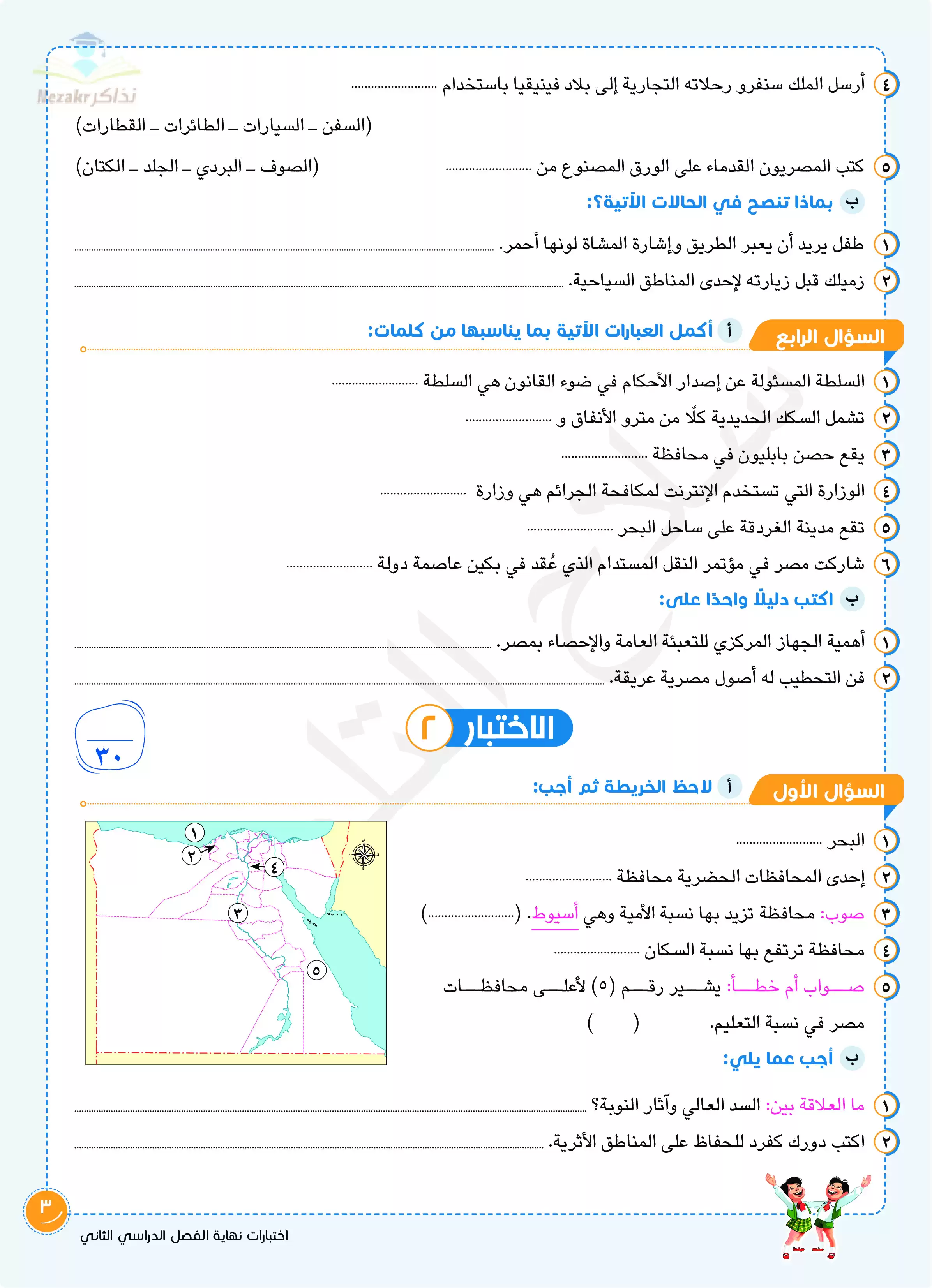 • نموذج الإجابة التفصيلي والدقيق للامتحانات الاسترشادية النهائية لرابعة ابتدائي في الدراسات من إعداد سلاح التلميذ.