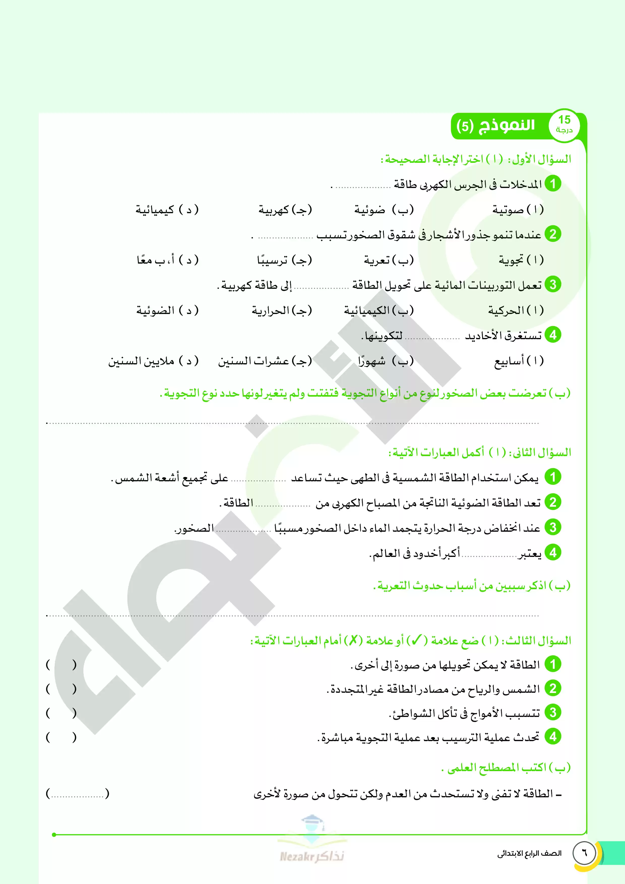 صفحة 6 من 12 صفحة من ملف: نماذج اختبارات ومراجعة الأضواء النهائية في مادة العلوم للصف الرابع الابتدائي الترم الثاني - Nezakr