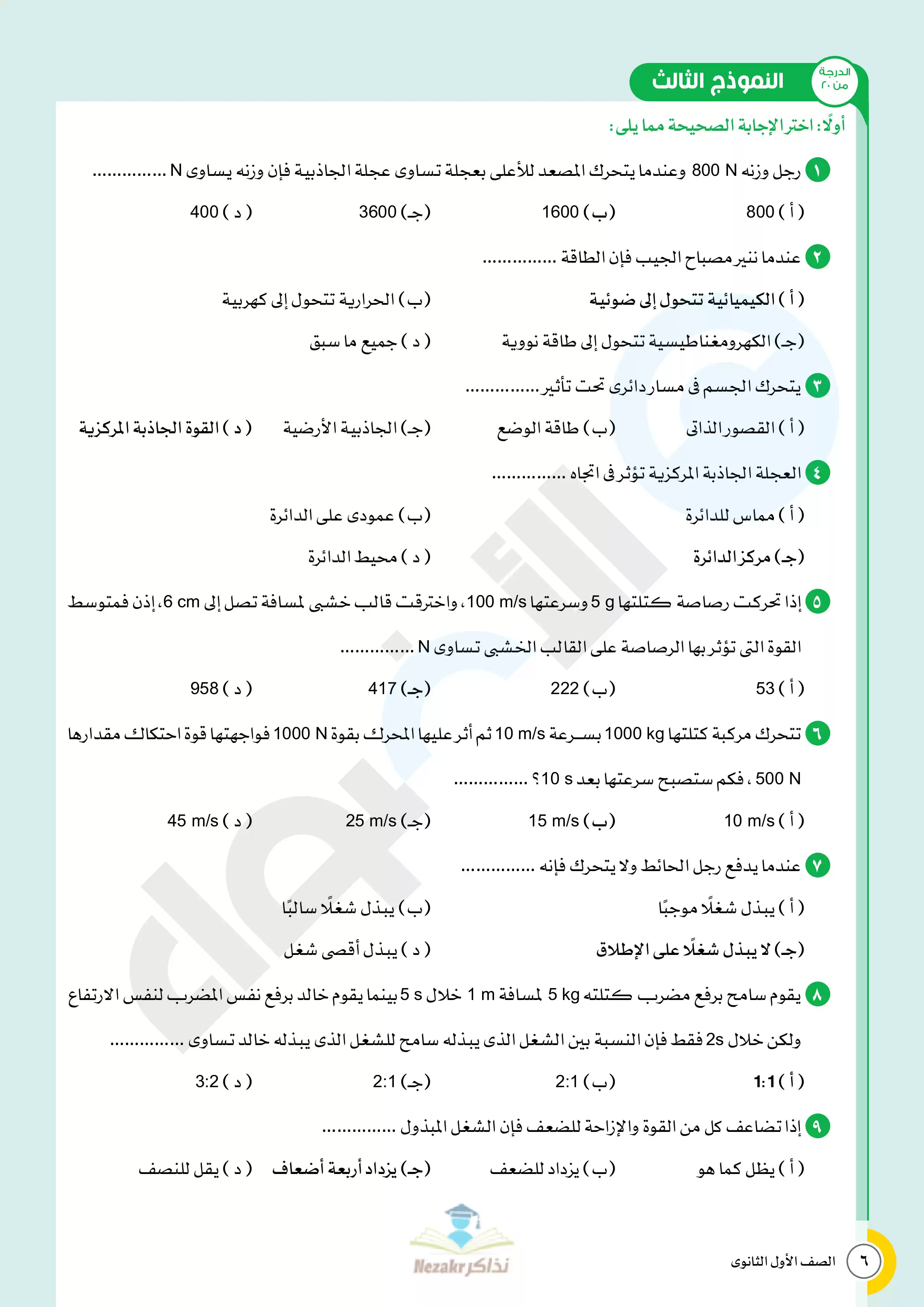 صفحة 6 من 22 صفحة من ملف: نماذج اختبارات الأضواء النهائية في مادة الفيزياء للصف الأول الثانوي الترم الثاني - Nezakr