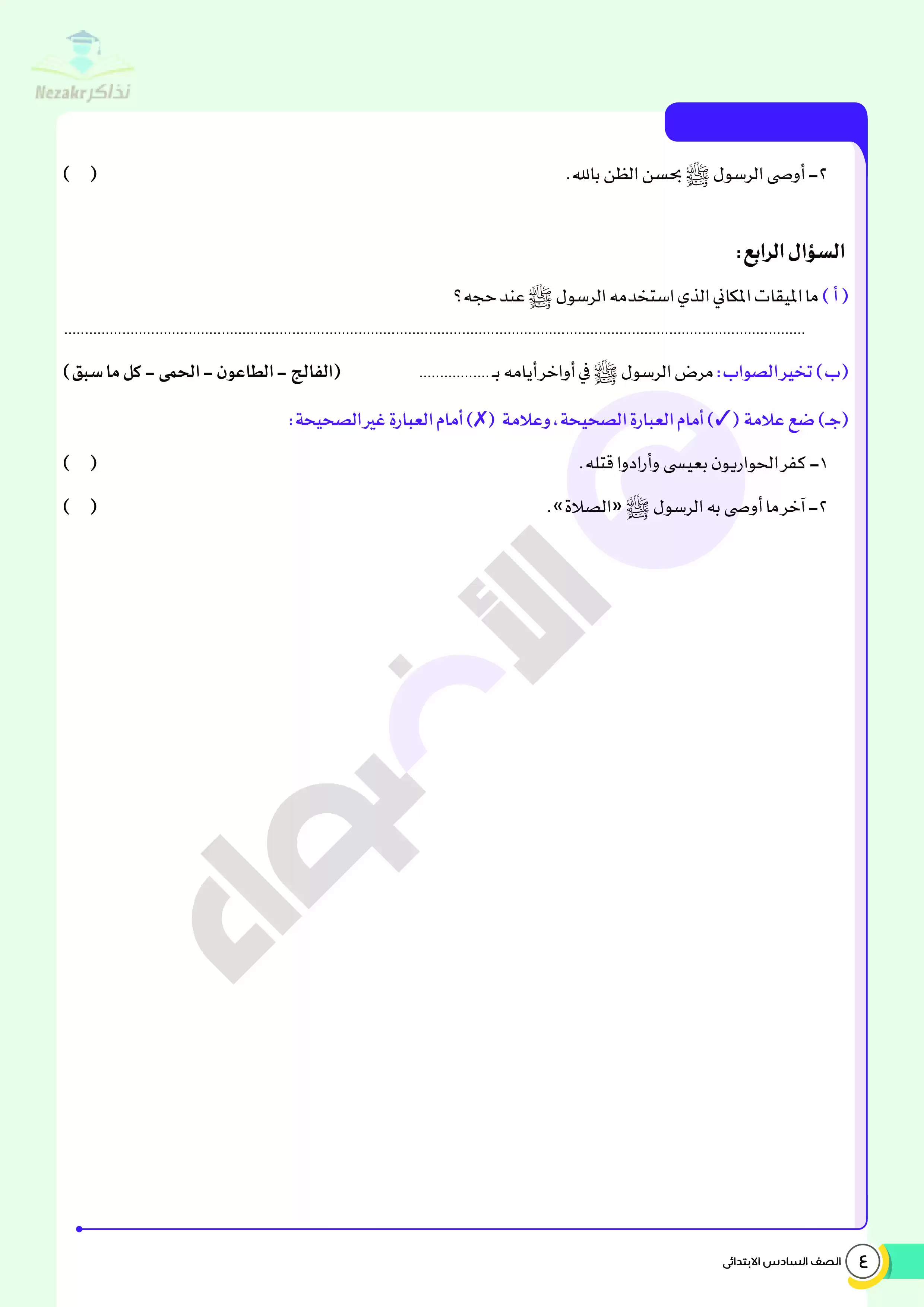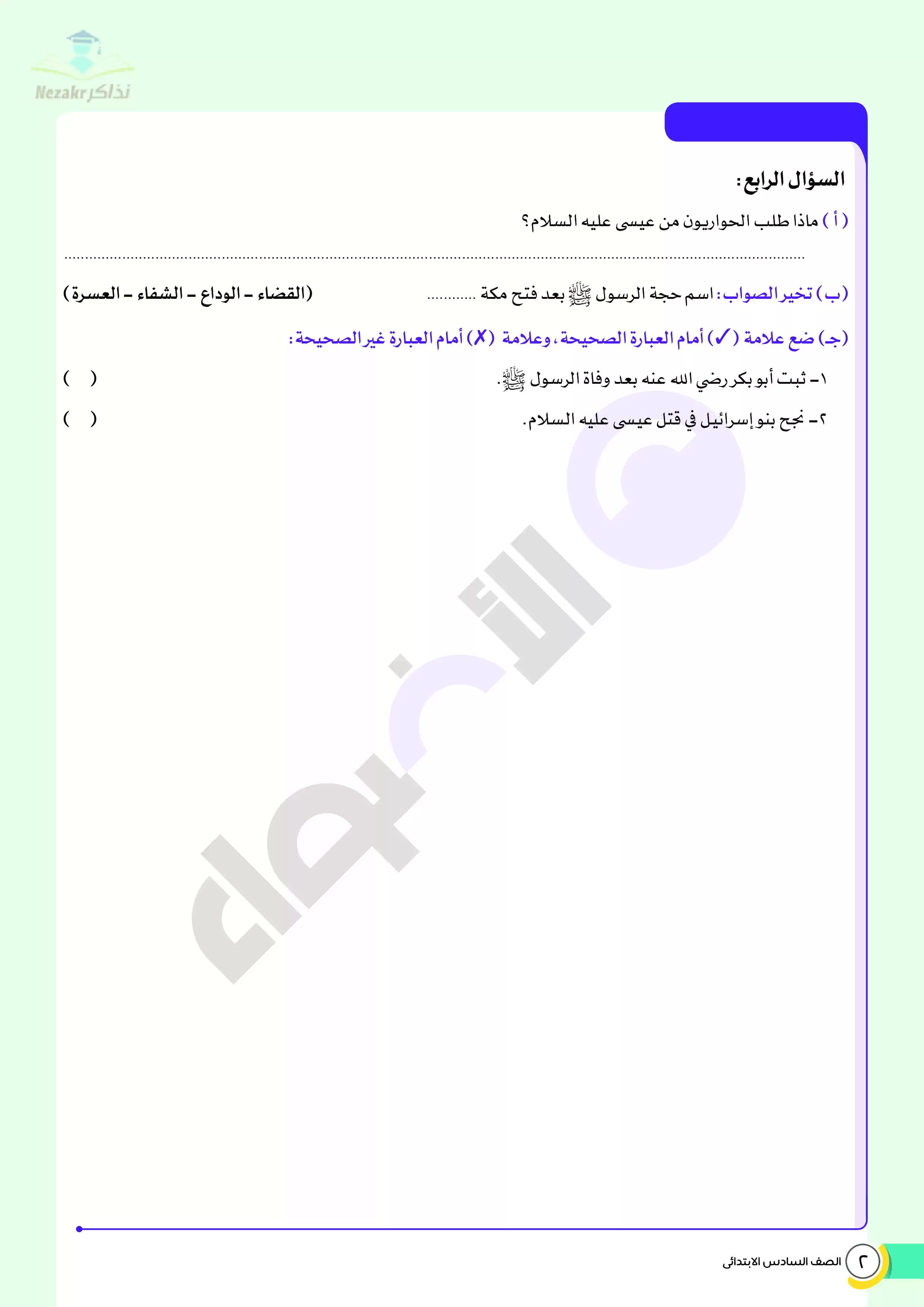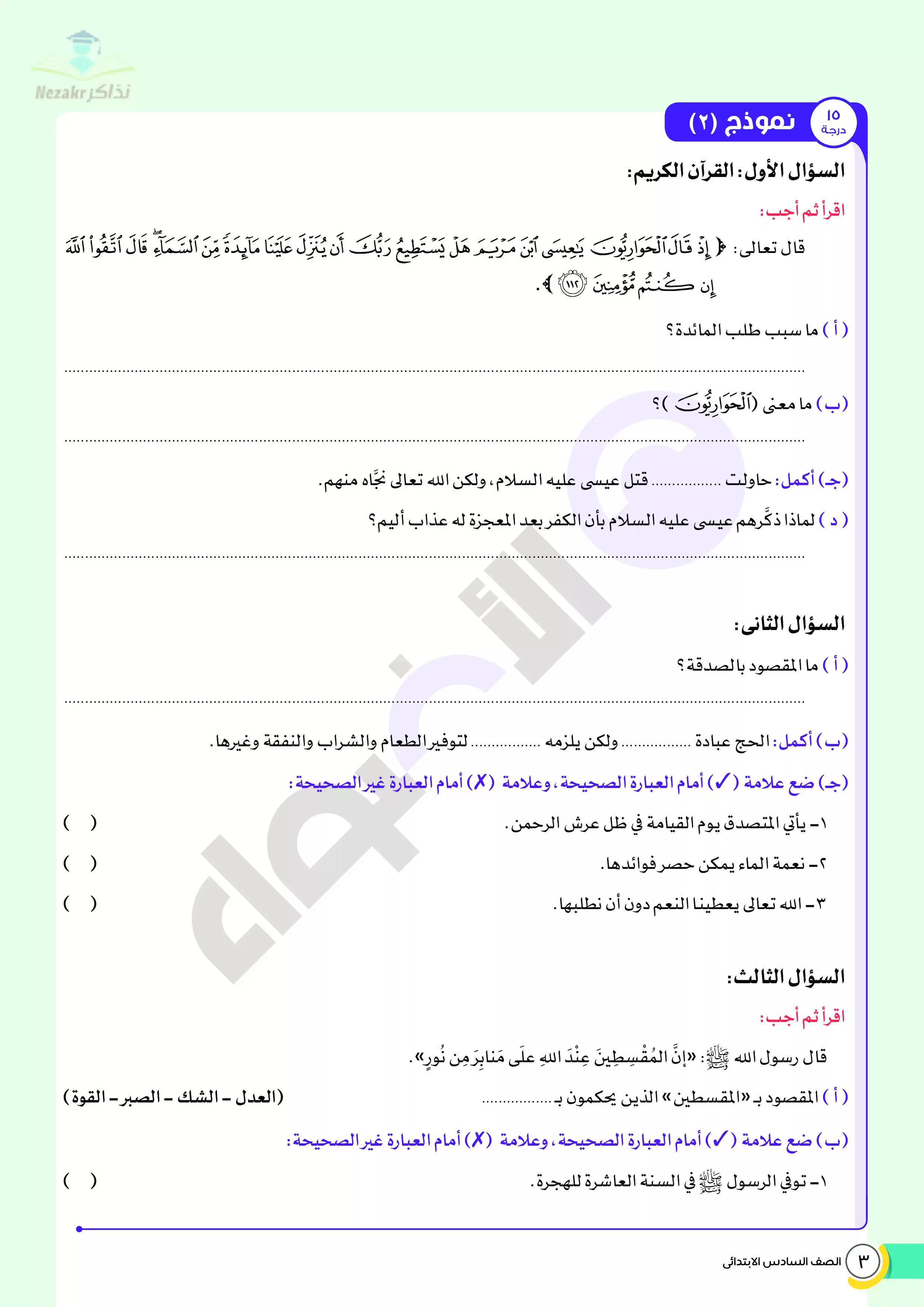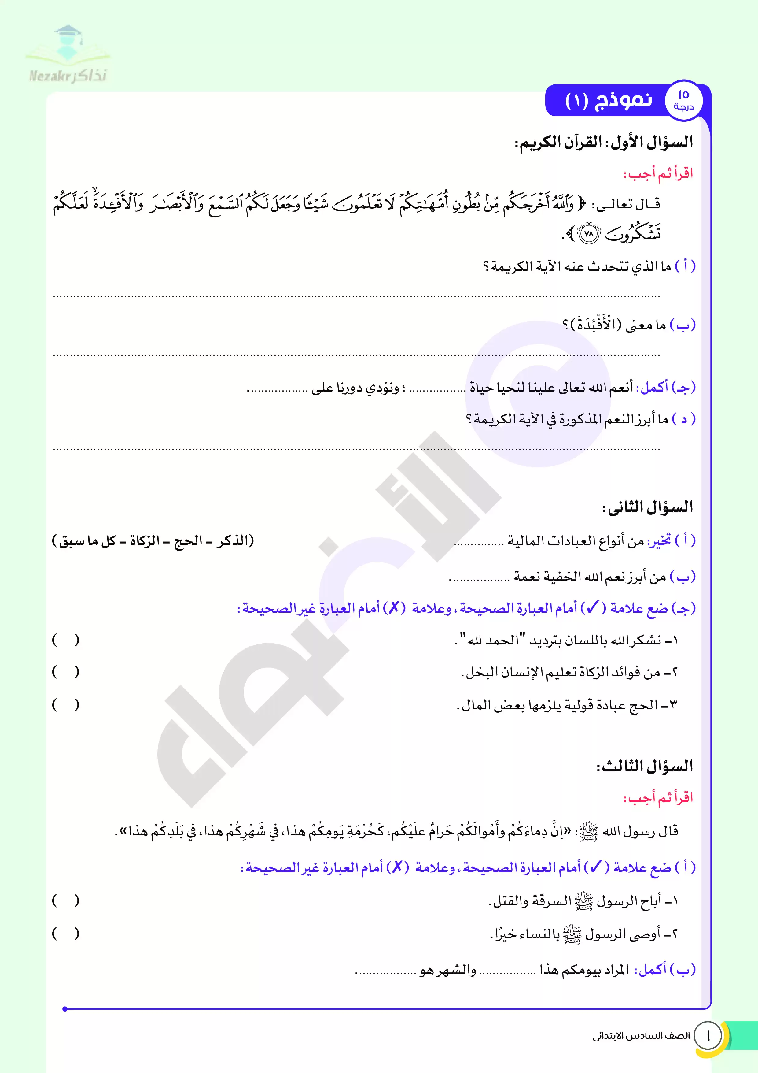 | بيانات الملف: (اختبارات الأضواء في مادة التربية الدينية الإسلامية الفصل الدراسي الثاني الصف السادس الابتدائي بالإجابات النموذجية - Nezakr) | |