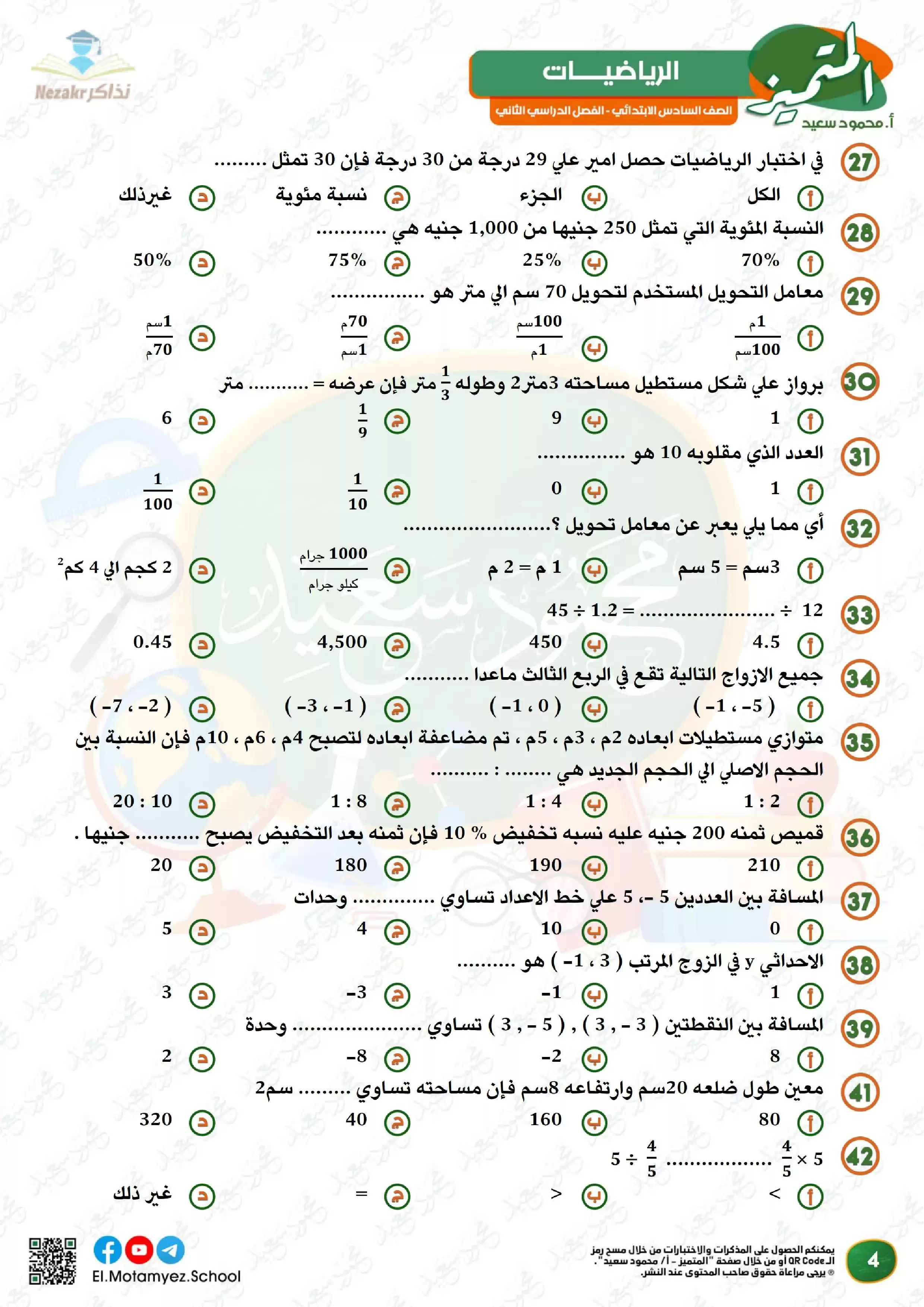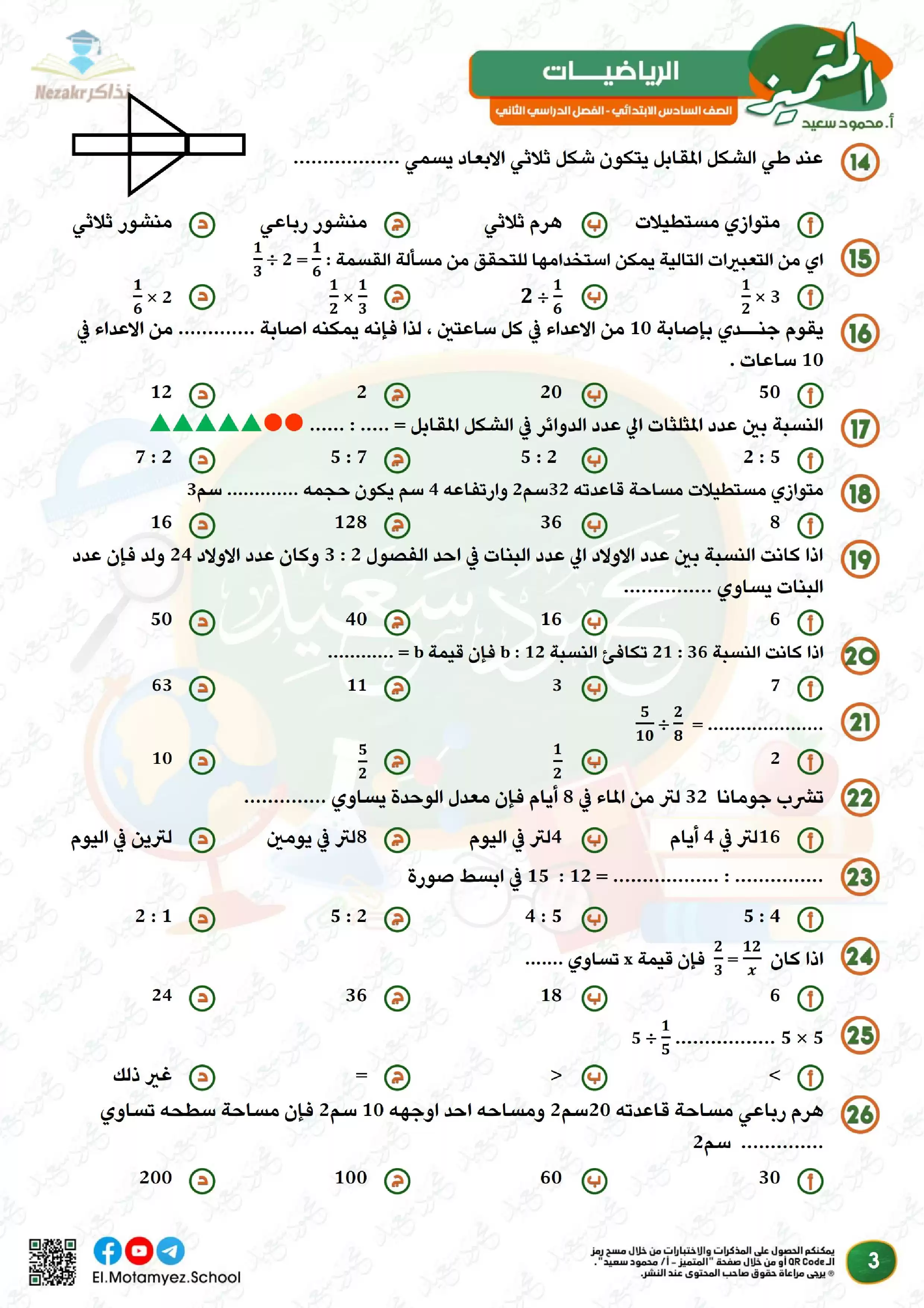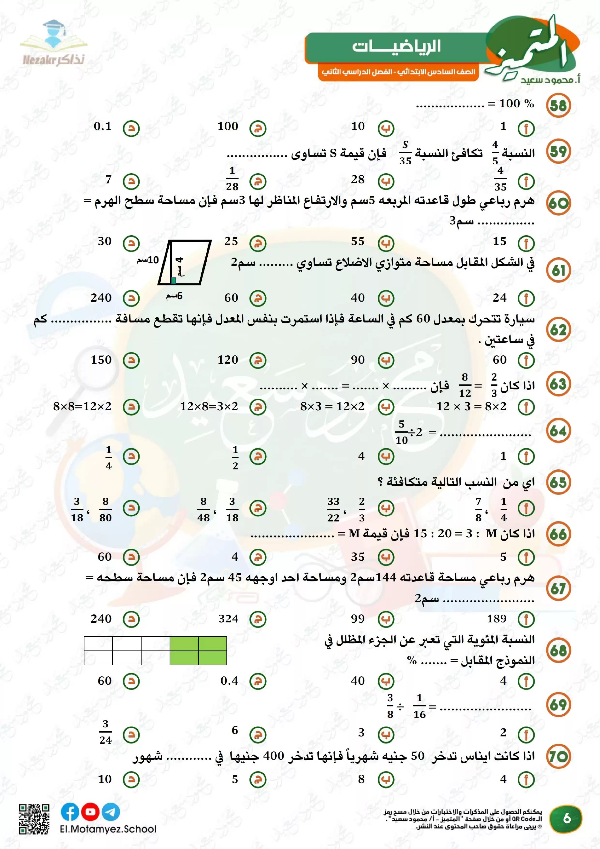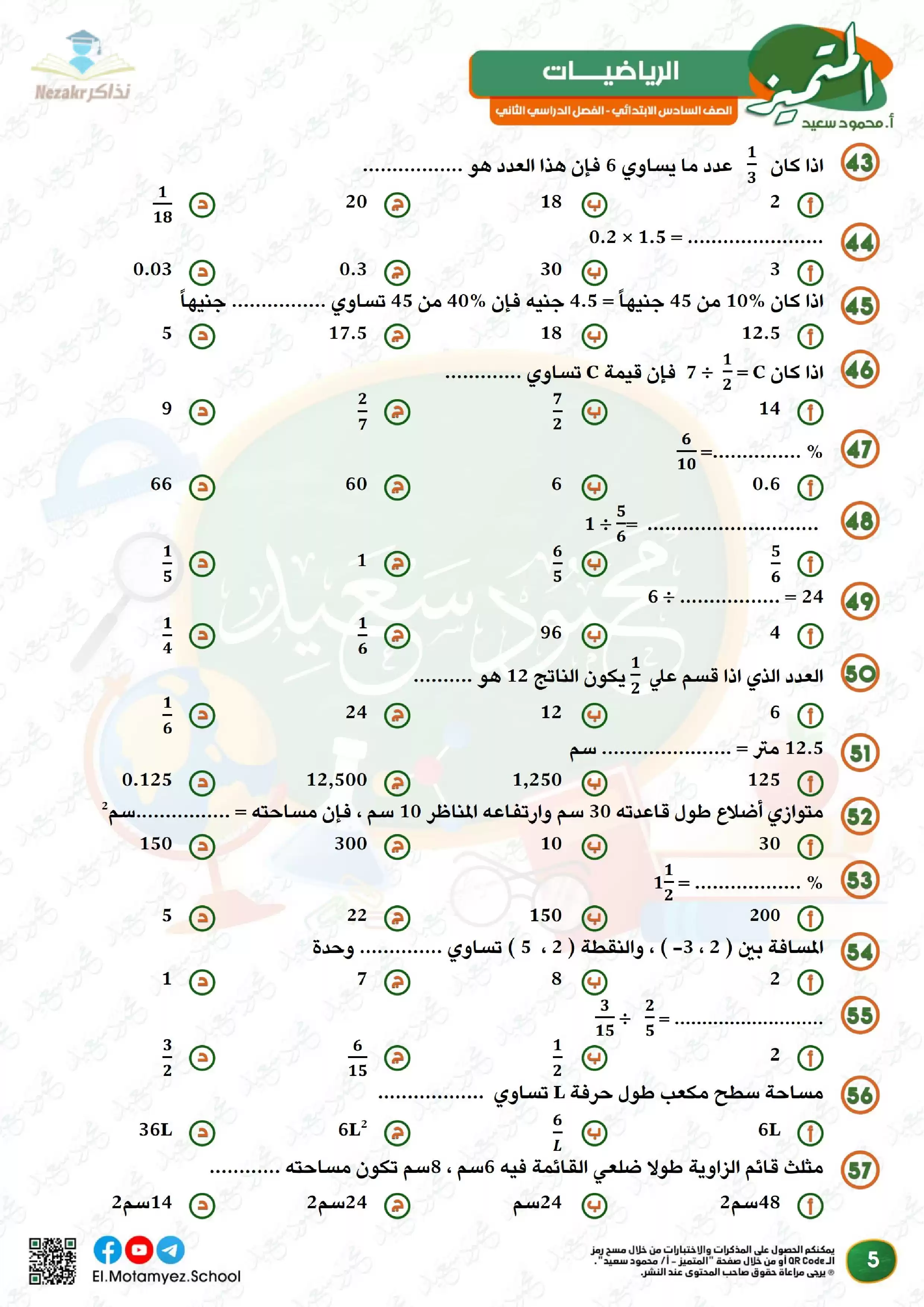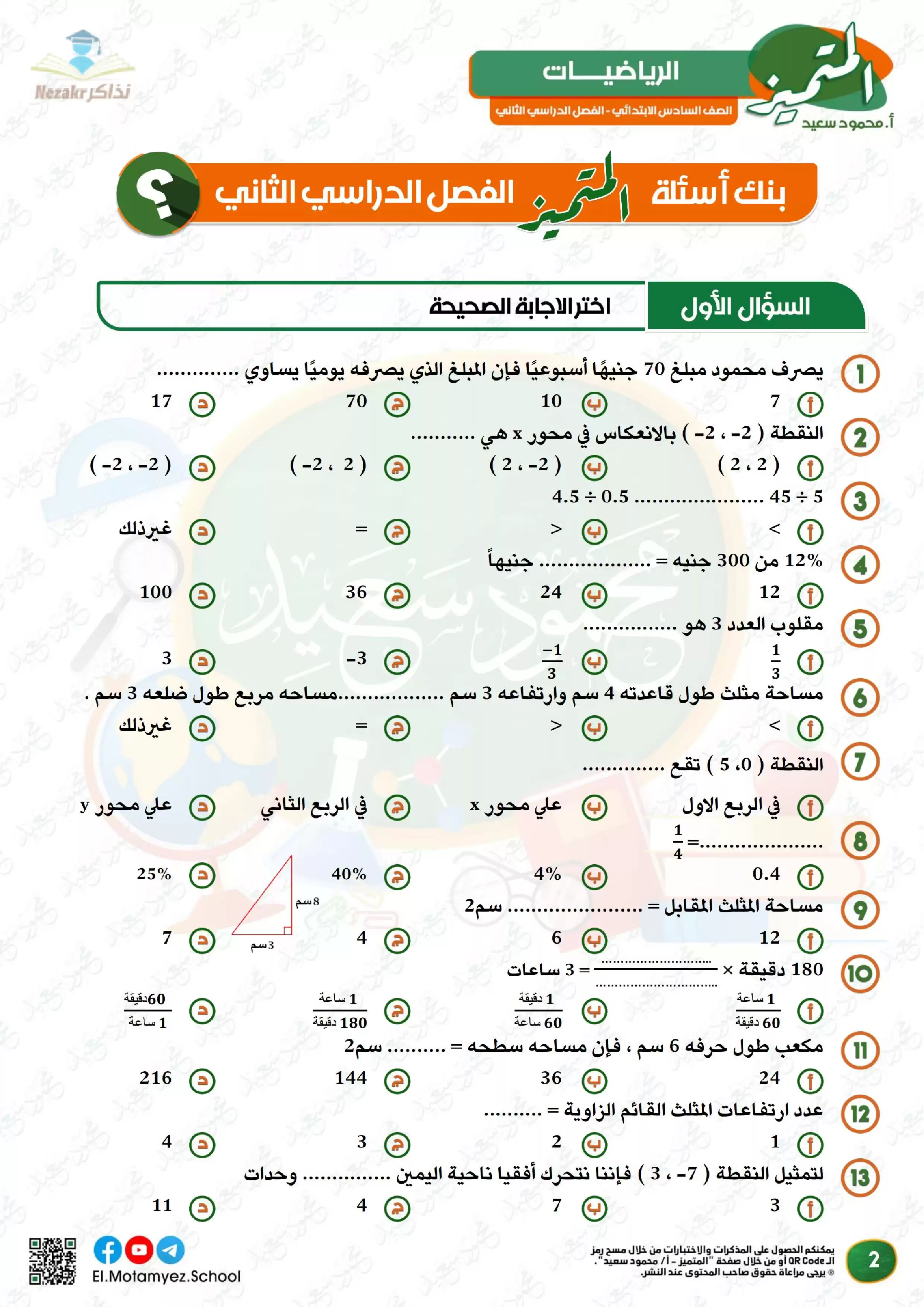 | بيانات الملف: (مراجعة وبنك أسئلة المتميز في مادة الرياضيات للصف السادس الابتدائي الترم الثاني - Nezakr) | |
