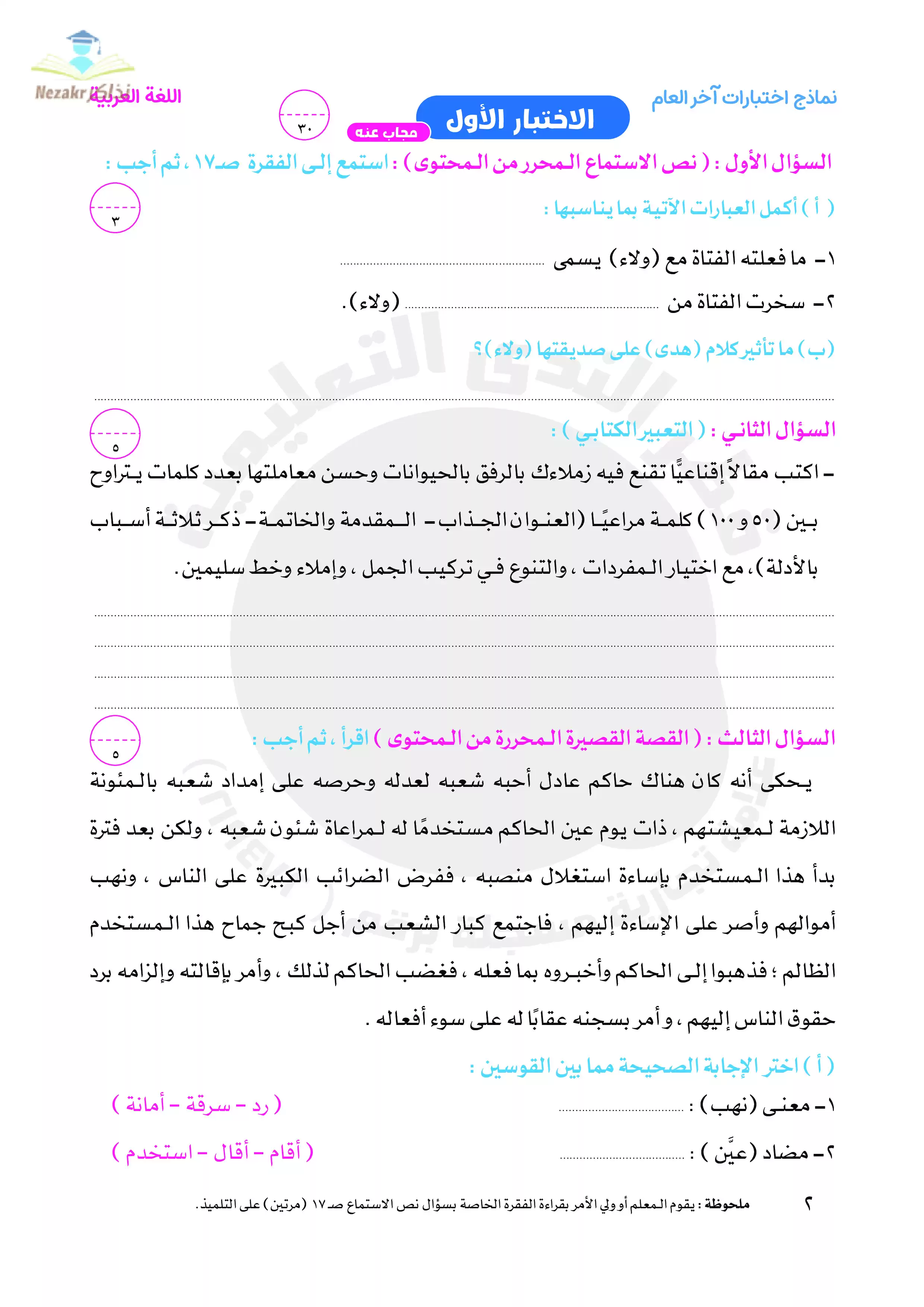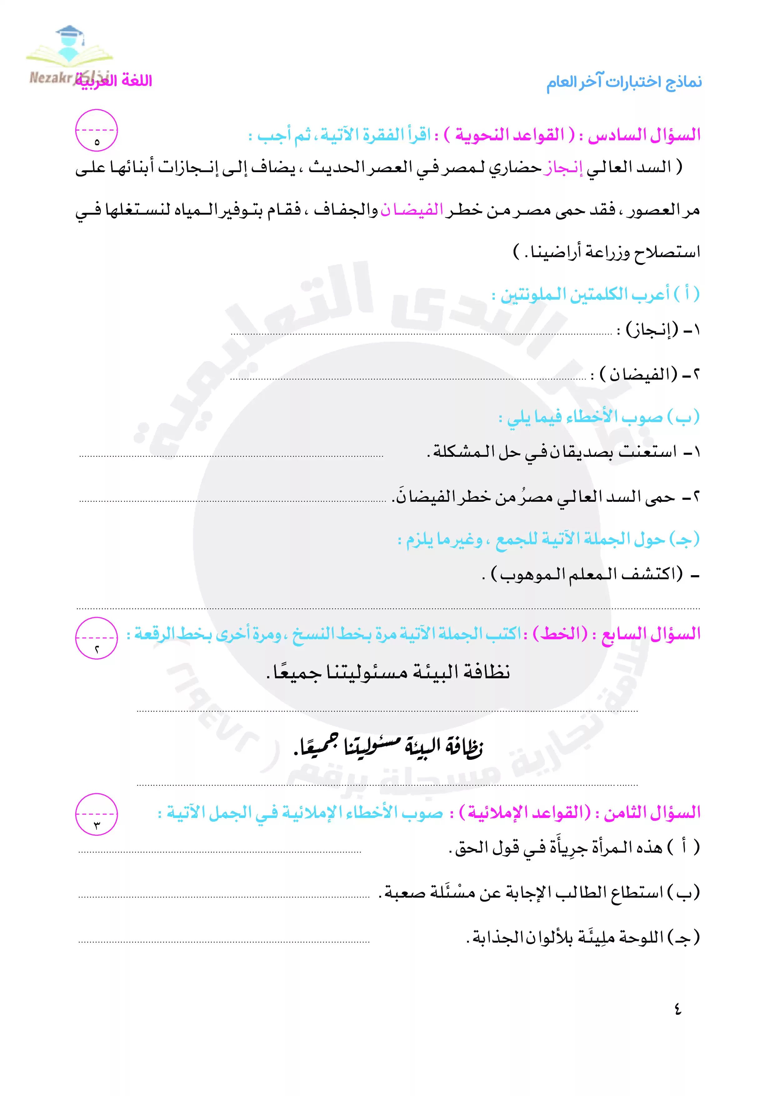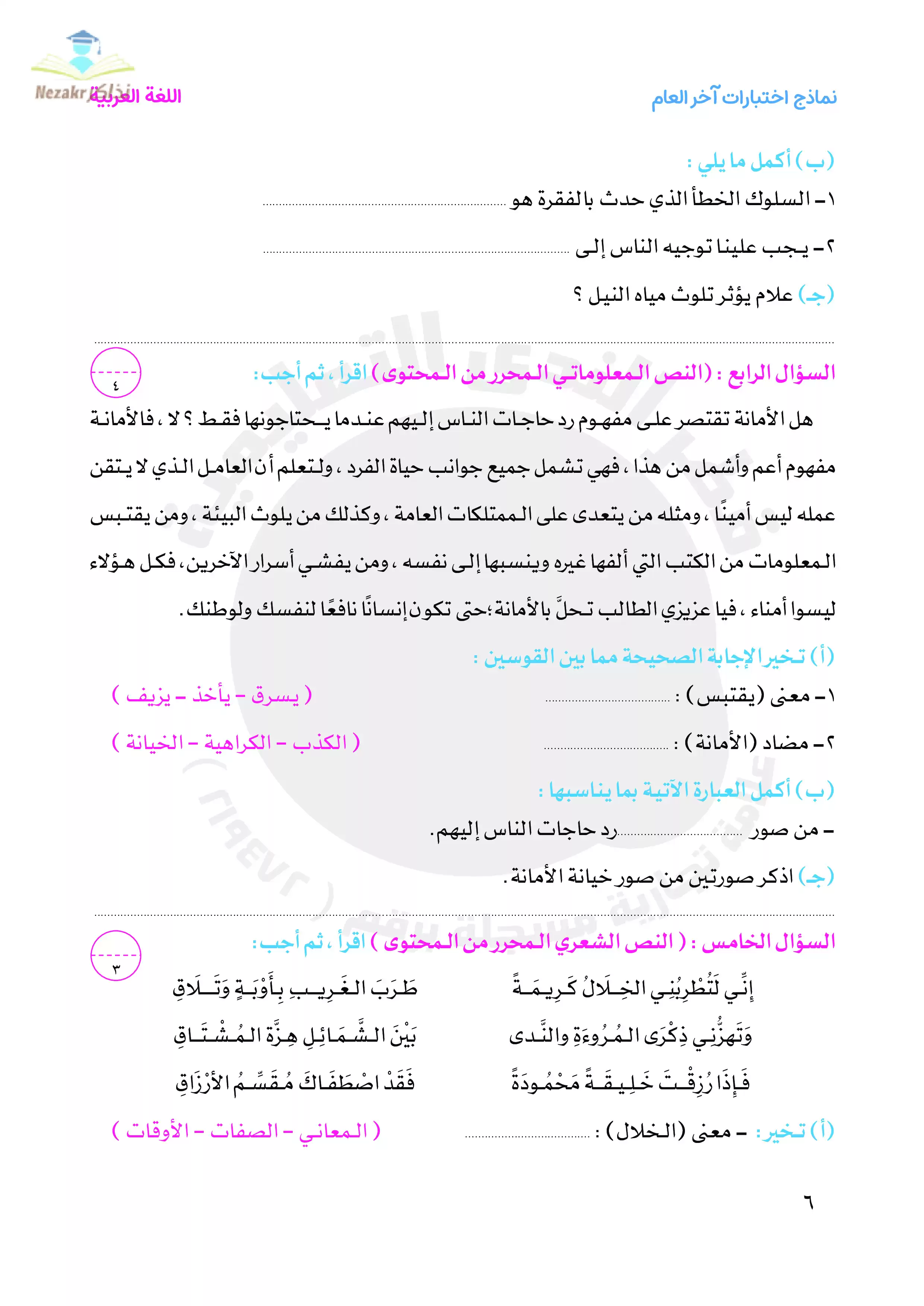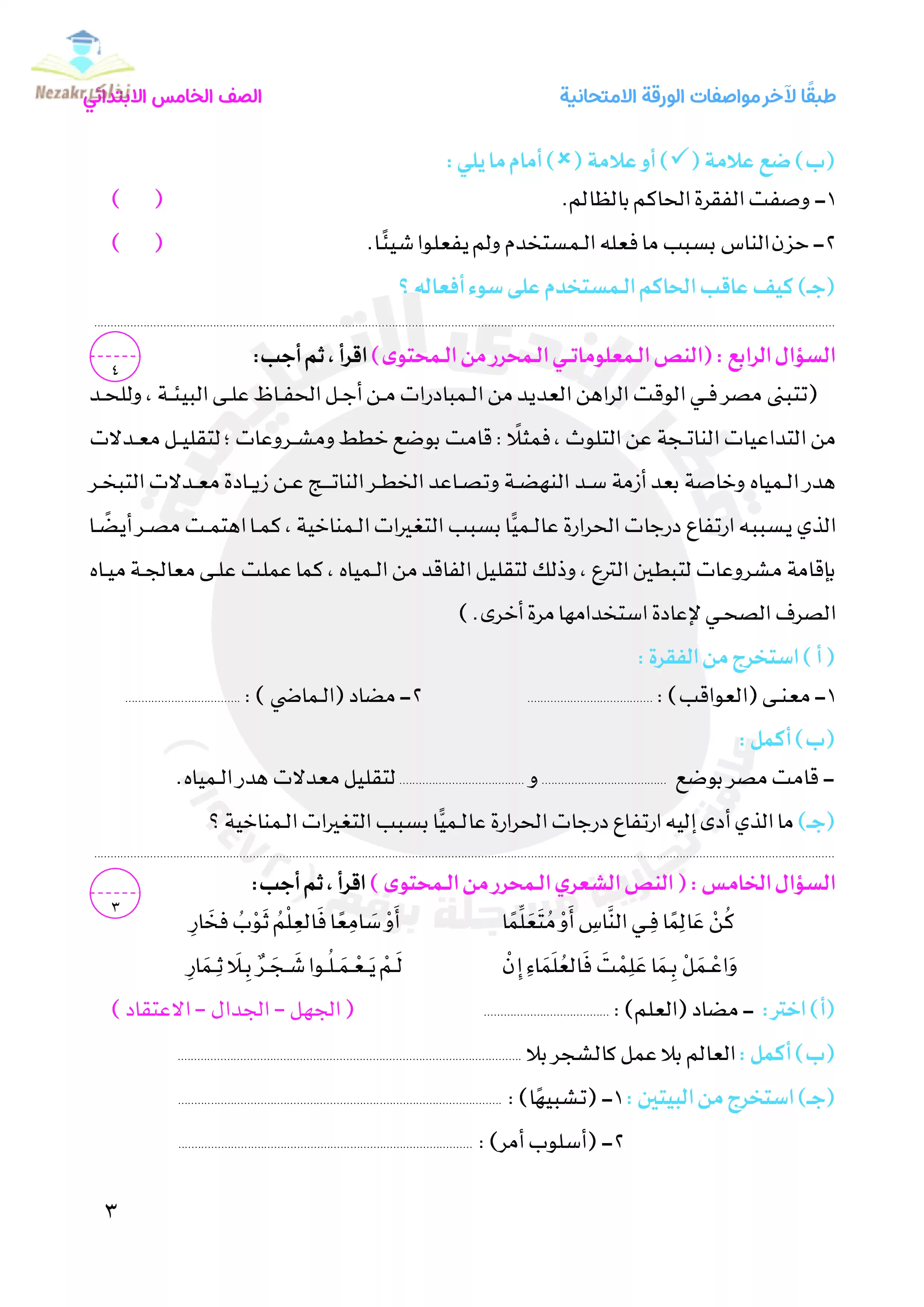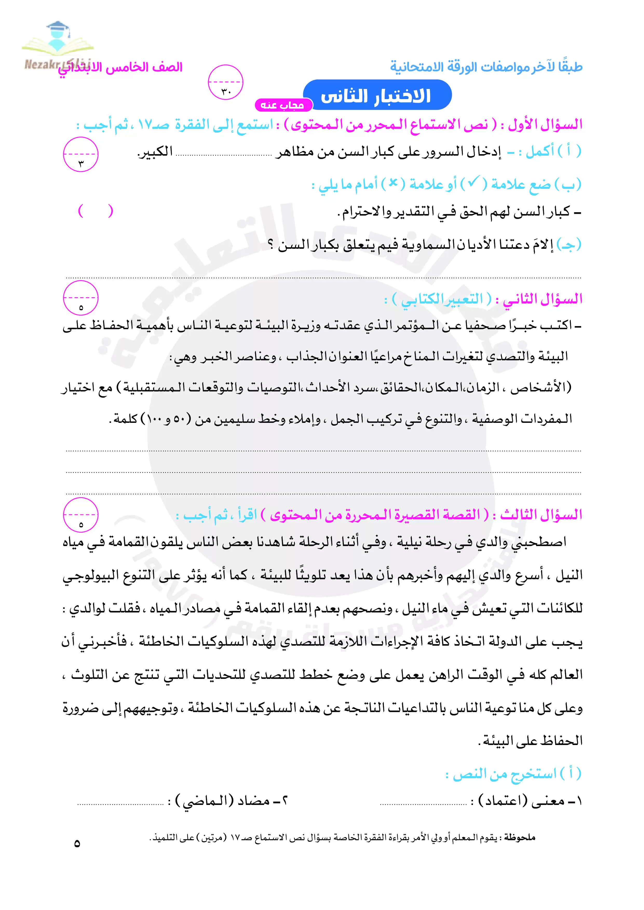 | بيانات الملف: (نماذج امتحانات اللغة العربية للصف الخامس الابتدائي الترم الثاني من قطر الندى - Nezakr) | |