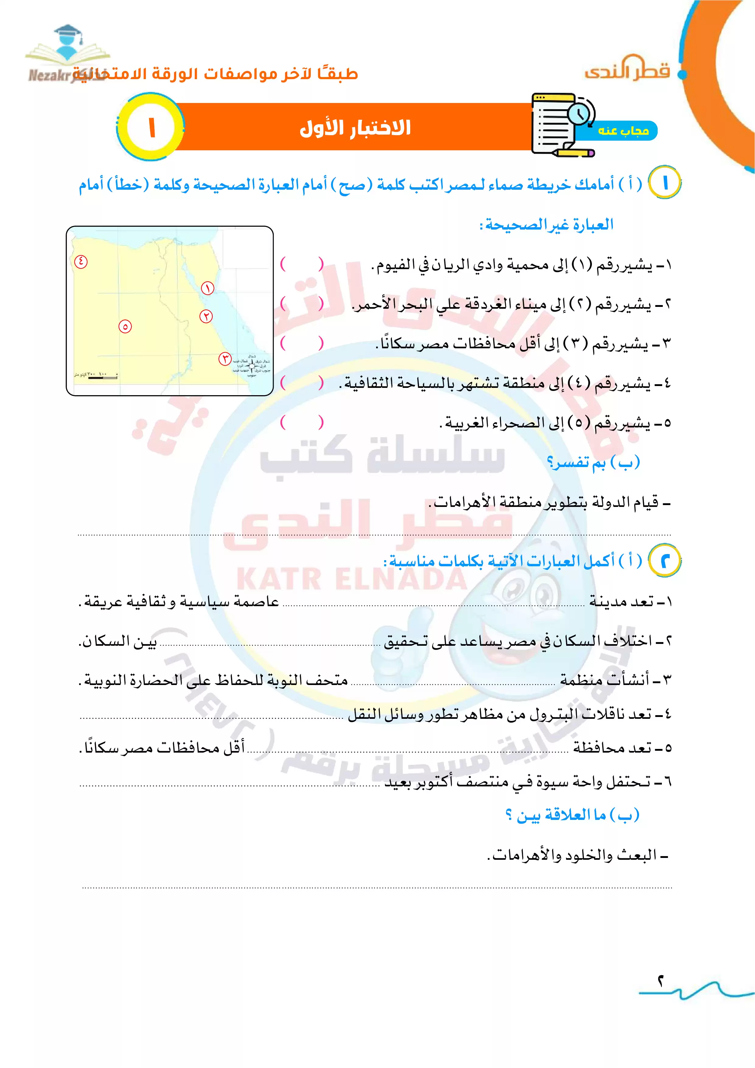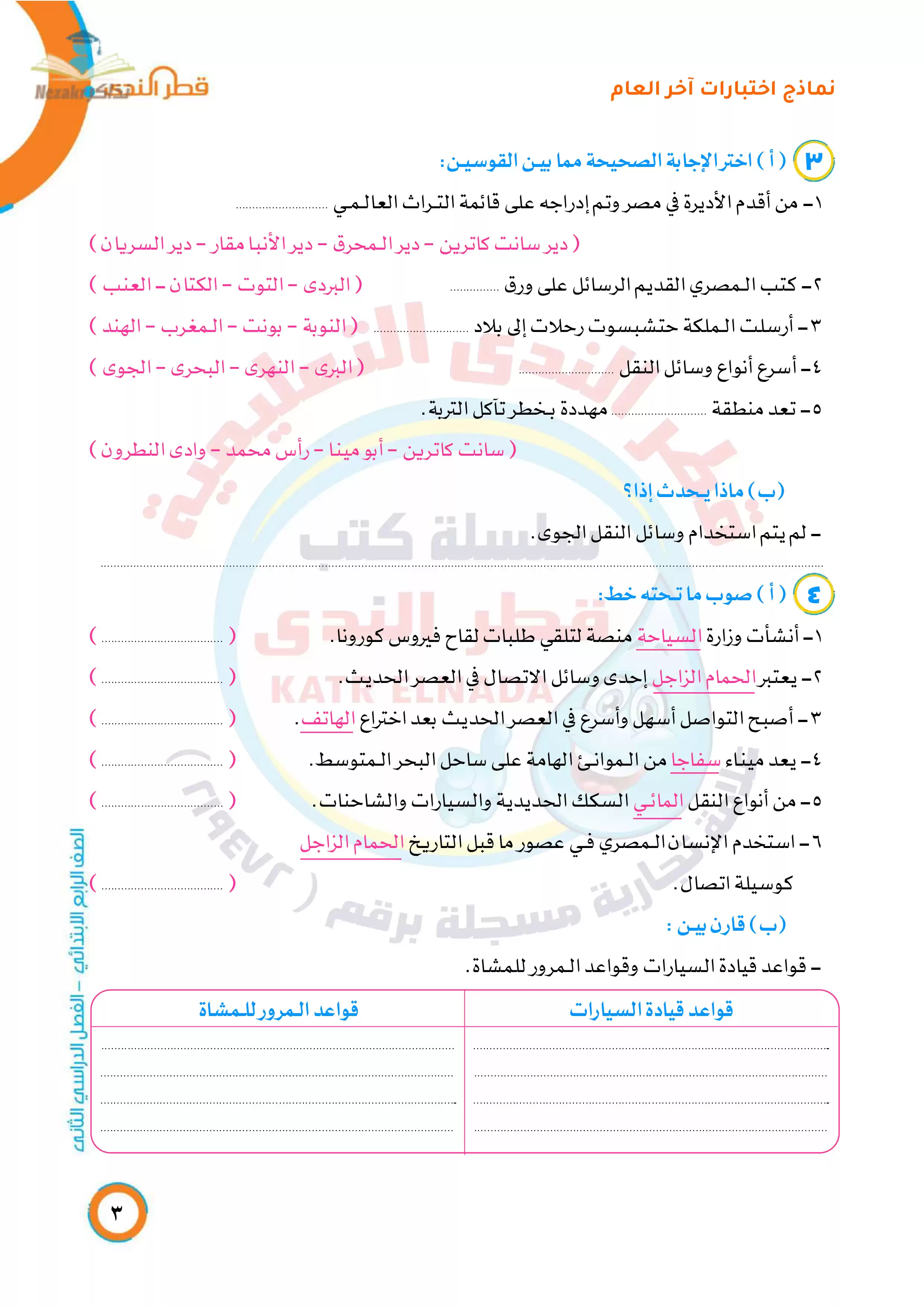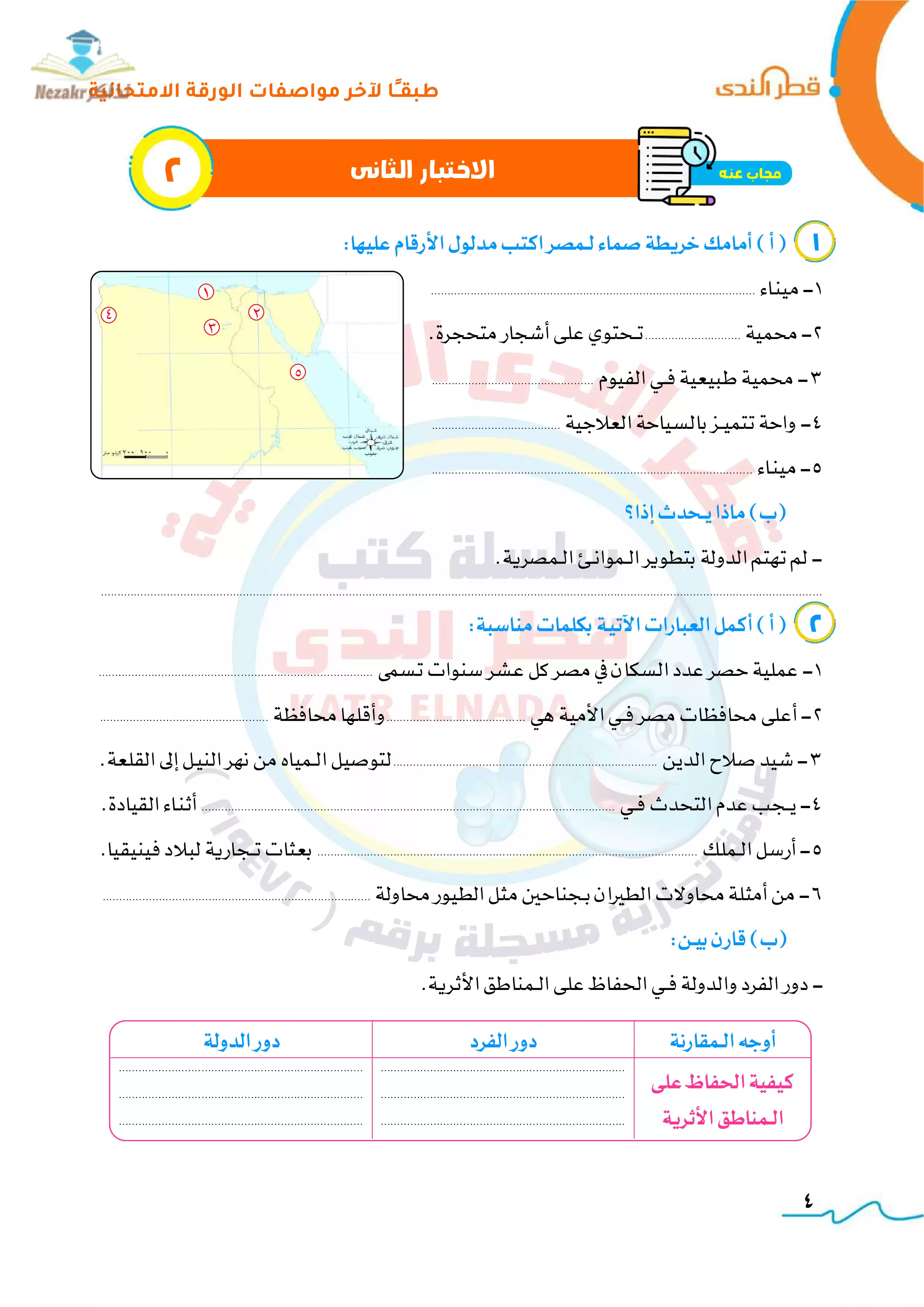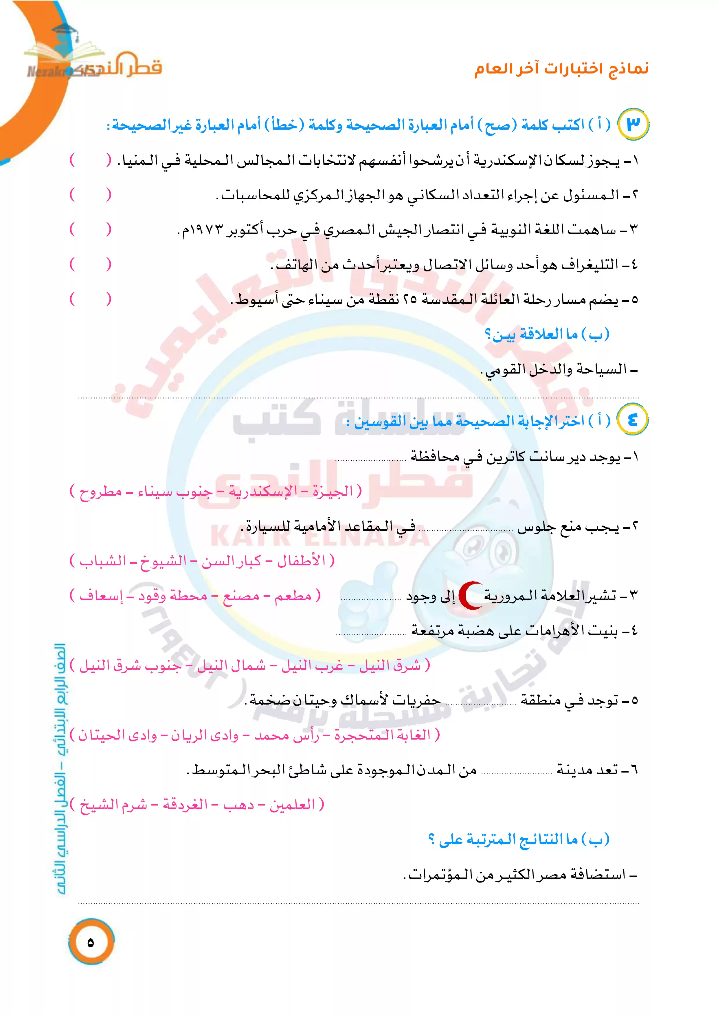 • نموذج الإجابة التفصيلي والدقيق للامتحانات الاسترشادية النهائية لرابعة ابتدائي في الدراسات من إعداد قطر الندى.
