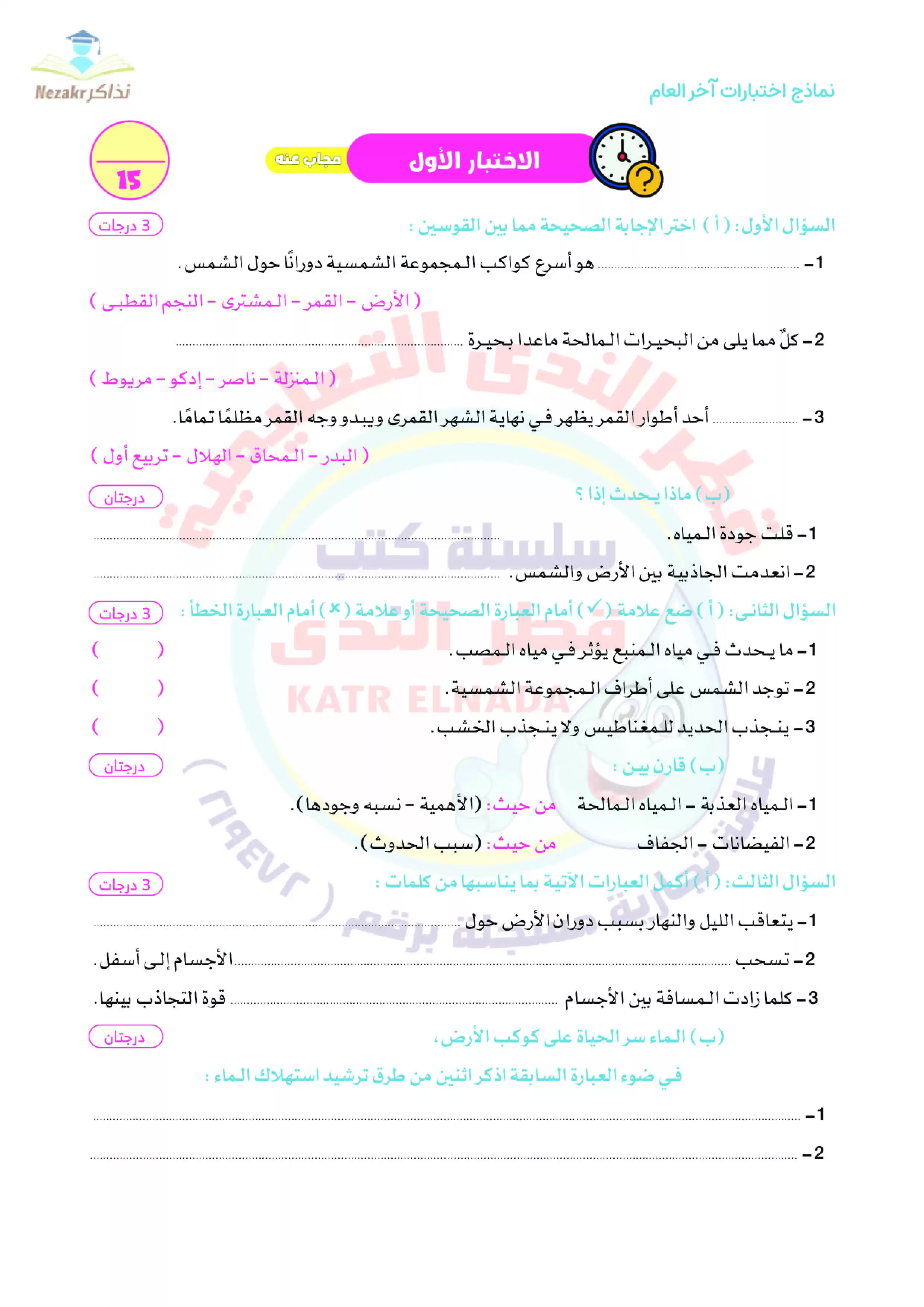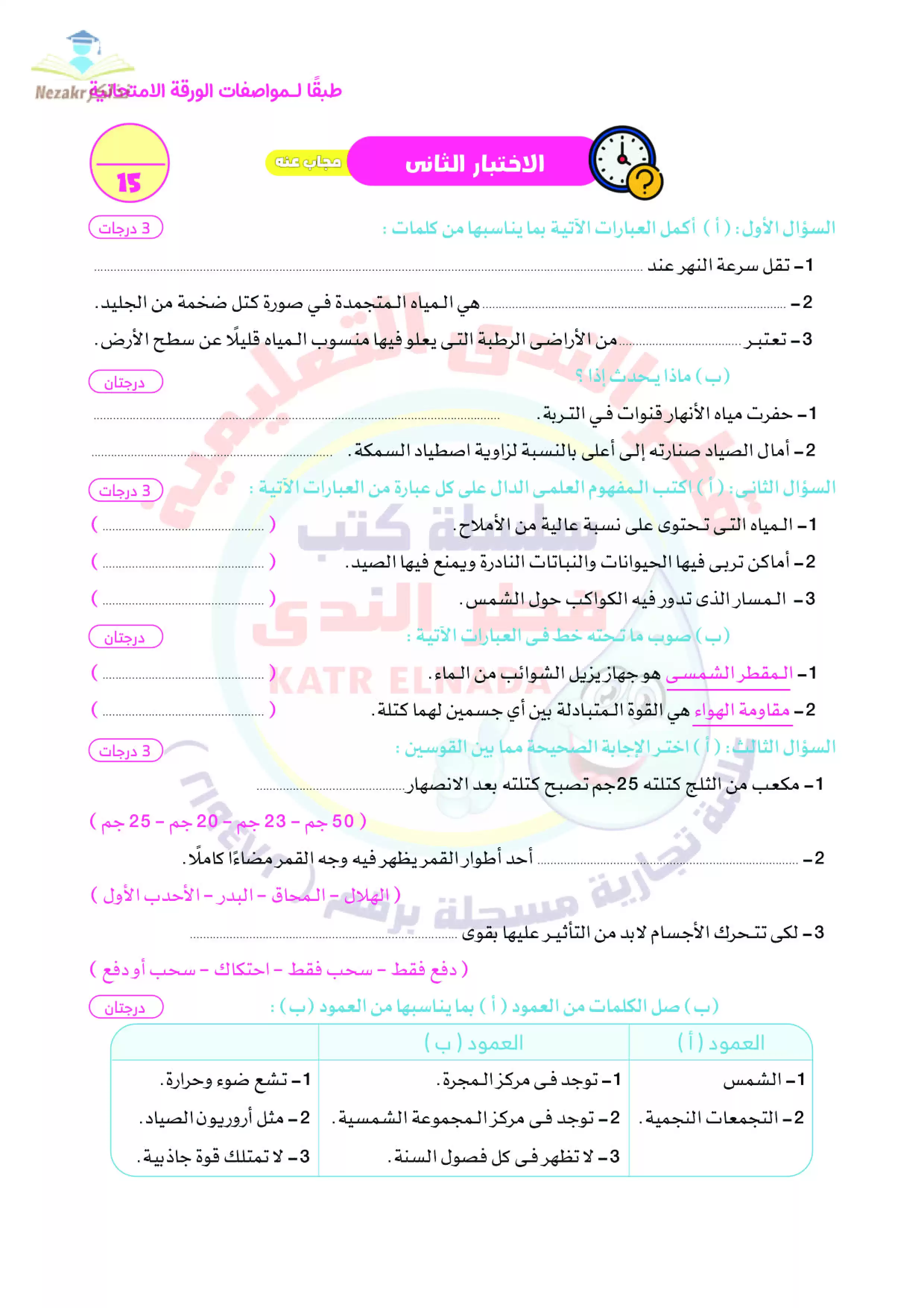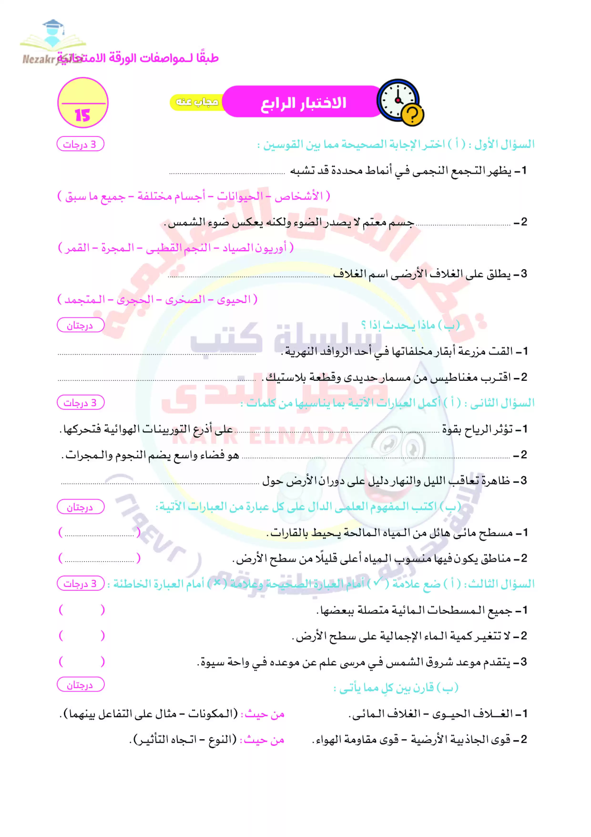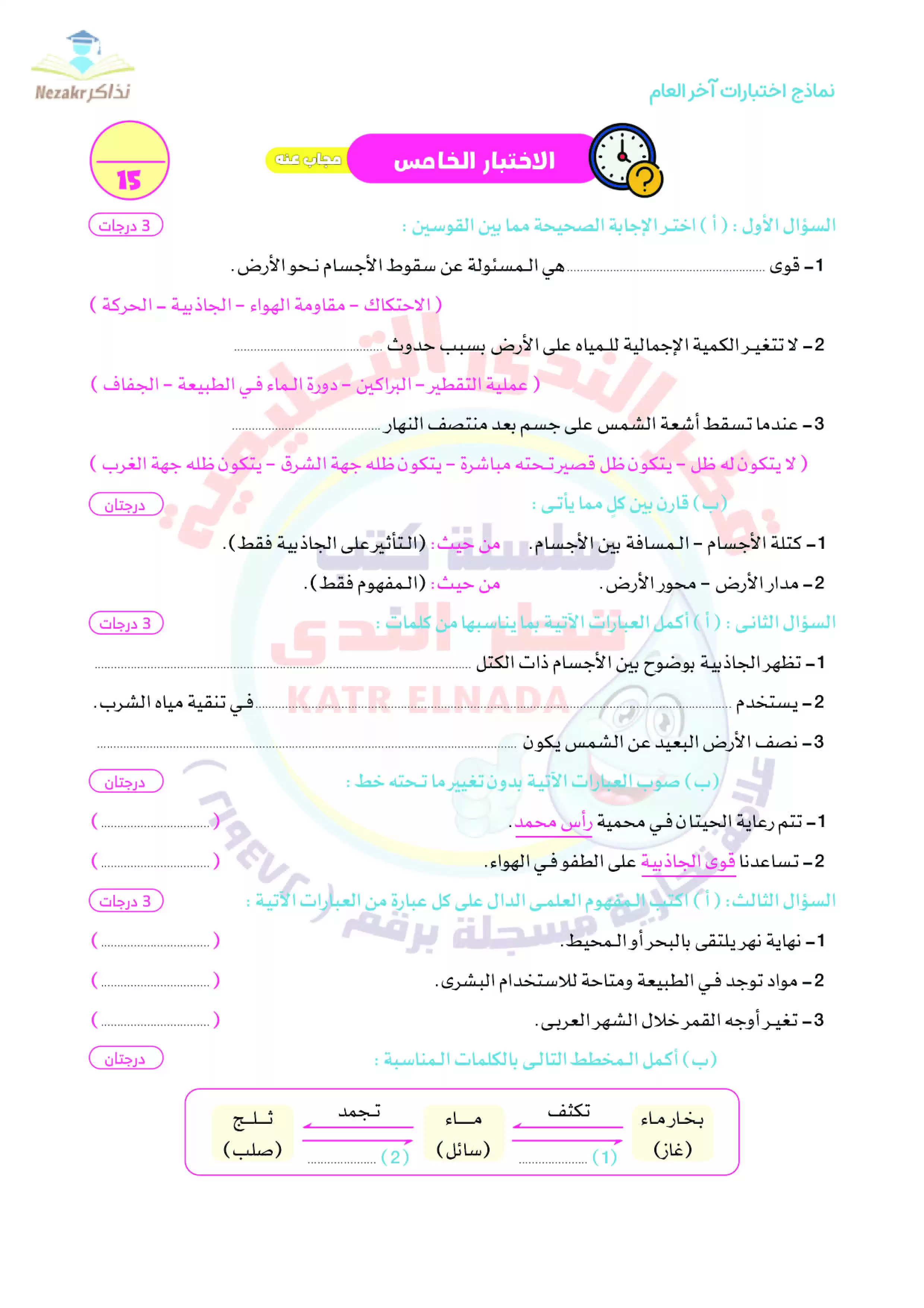 | بيانات الملف: (نماذج امتحانات العلوم للصف الخامس الابتدائي الترم الثاني من قطر الندى - Nezakr) | |