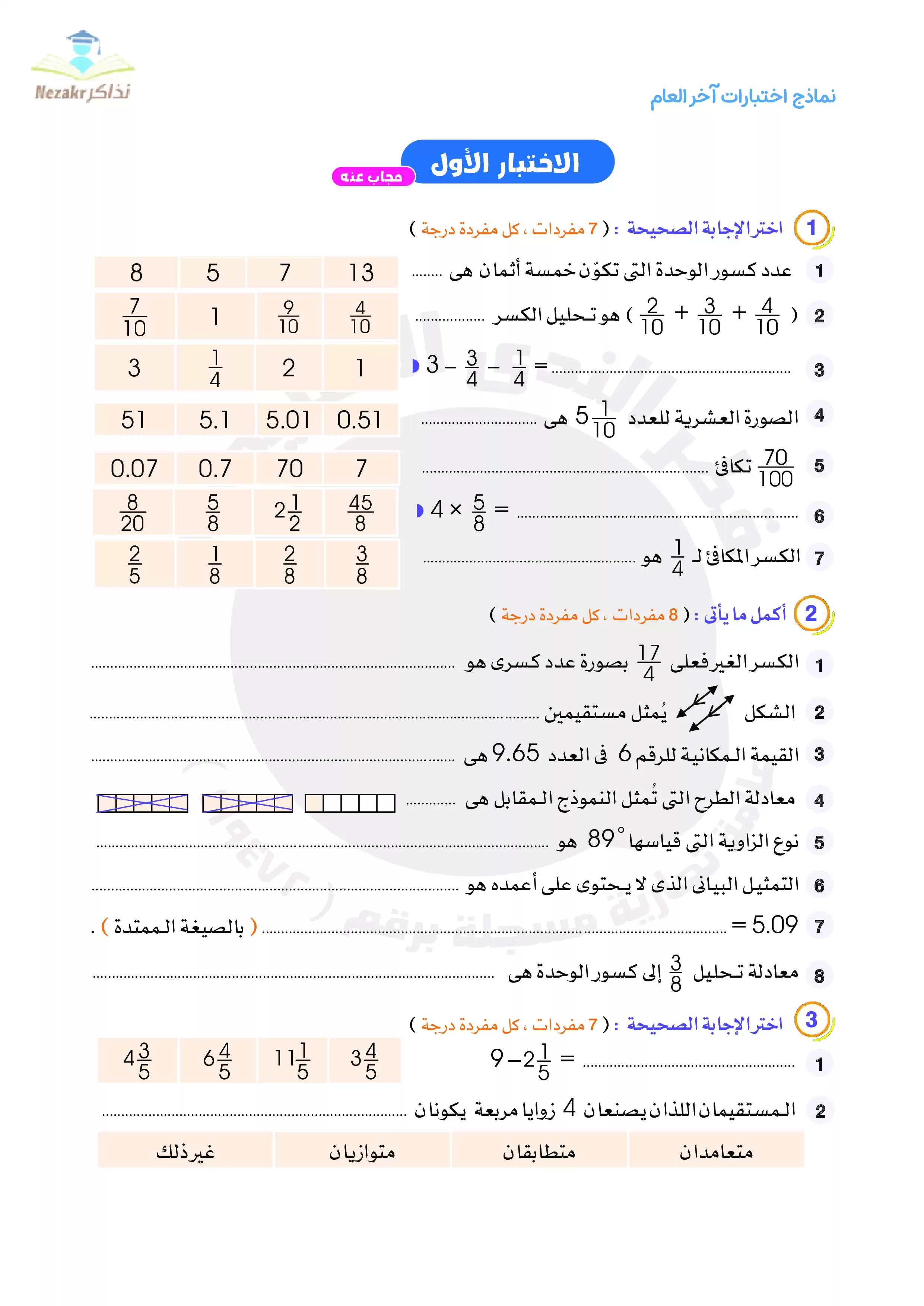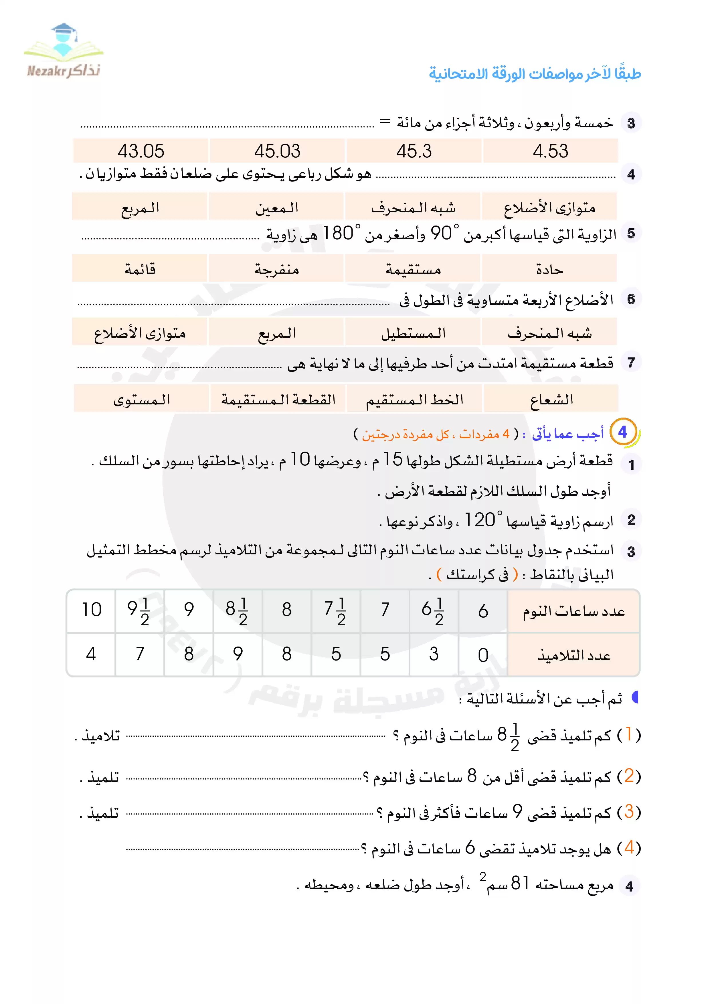 بيانات الملف: (نماذج امتحانات الرياضيات للصف الرابع الابتدائي الترم الثاني من قطر الندى - Nezakr)