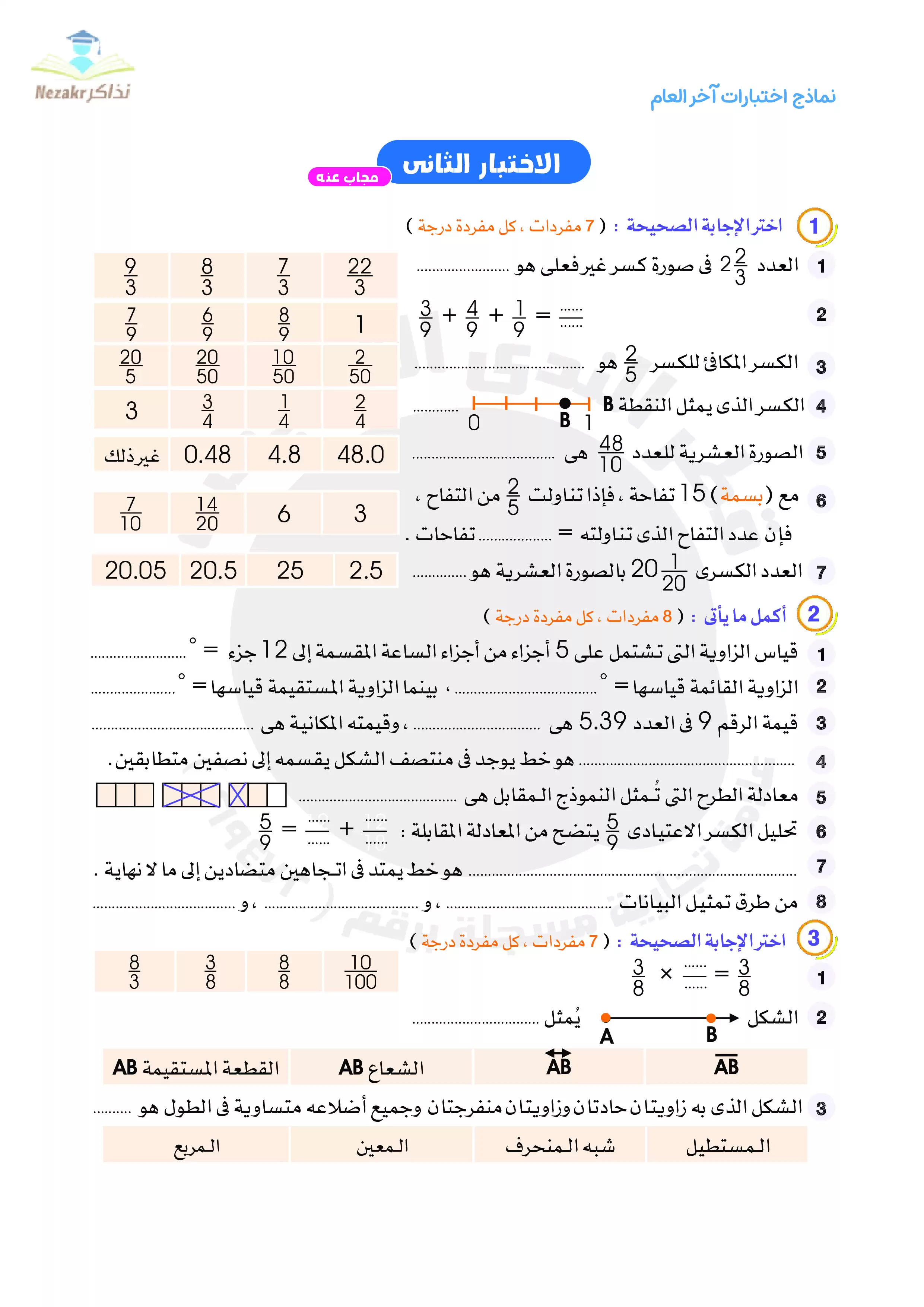 • نماذج امتحانات الرياضيات للصف الرابع الابتدائي ترم ثاني